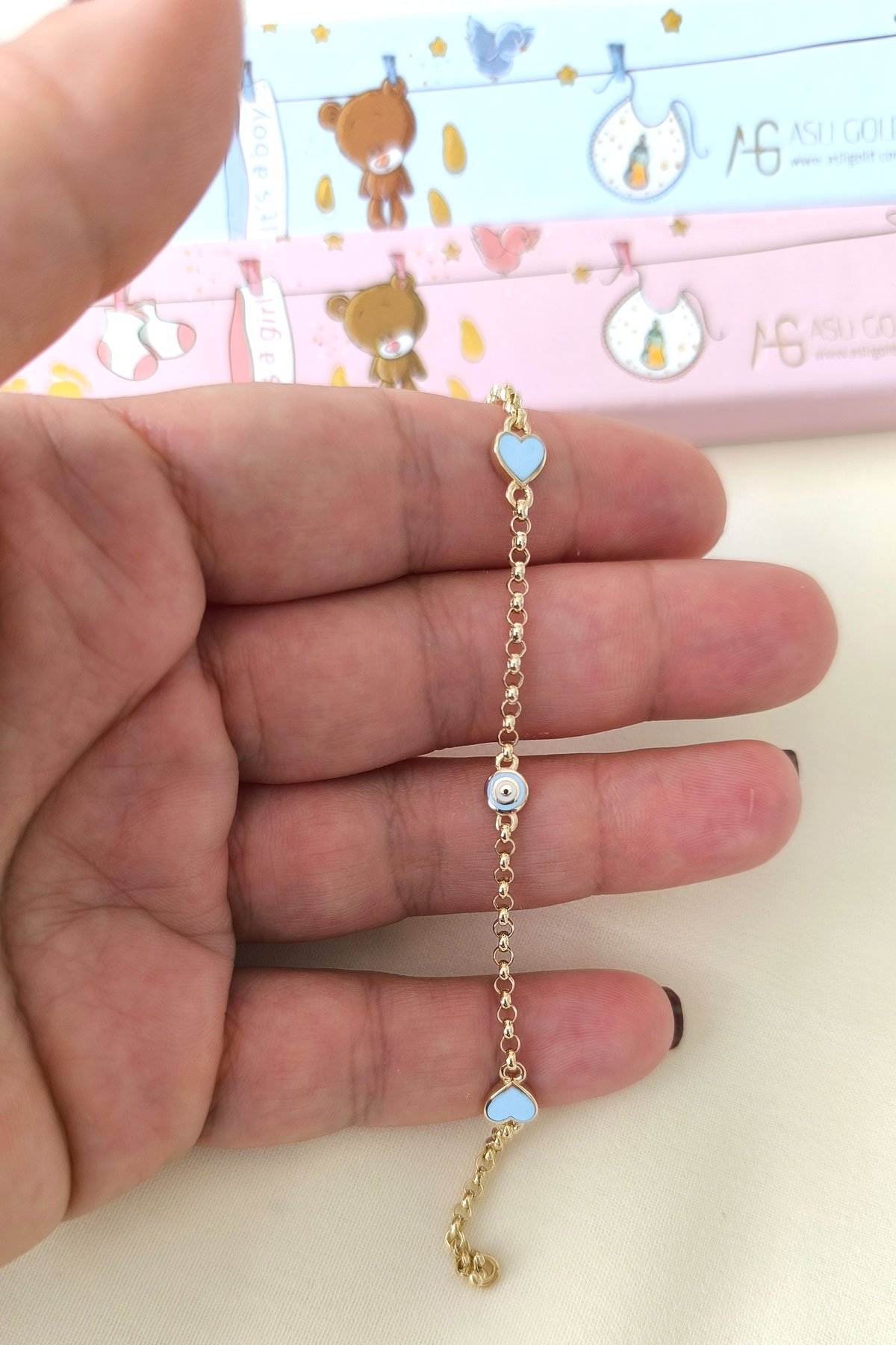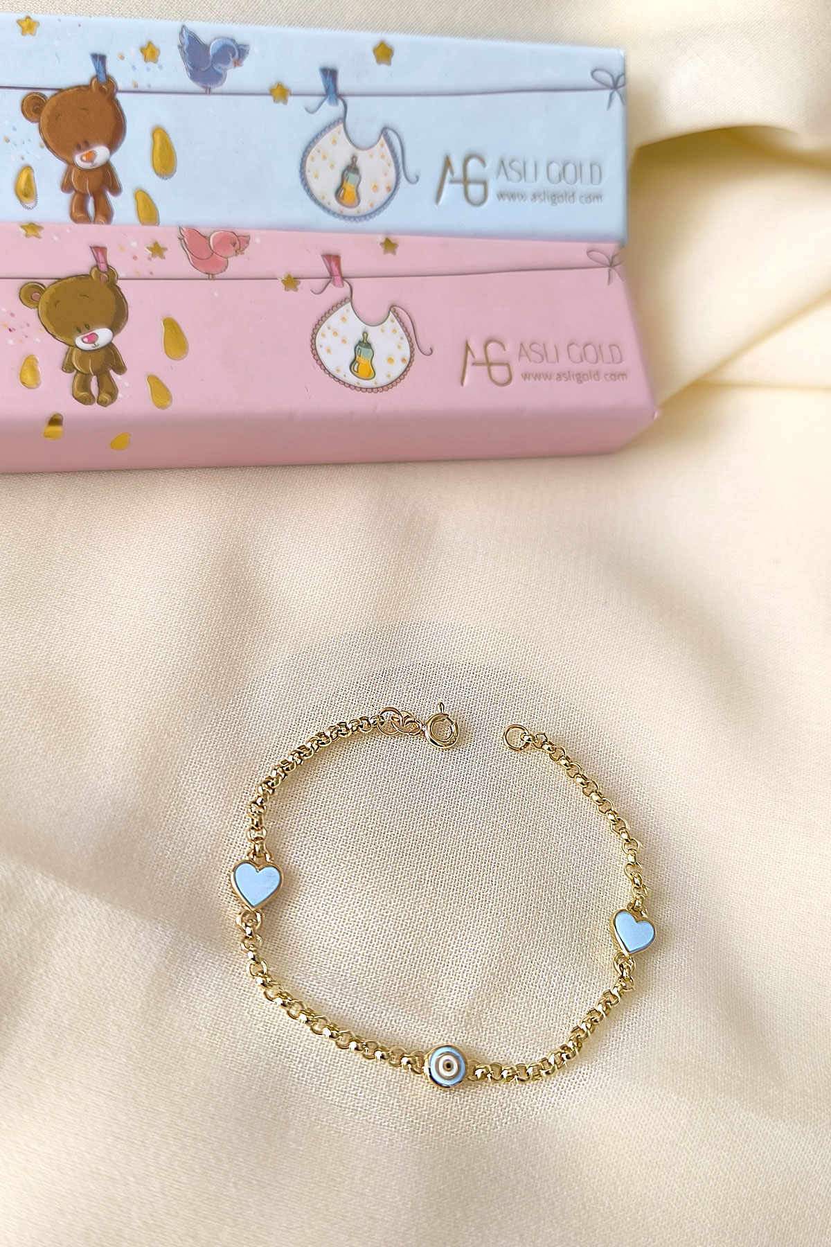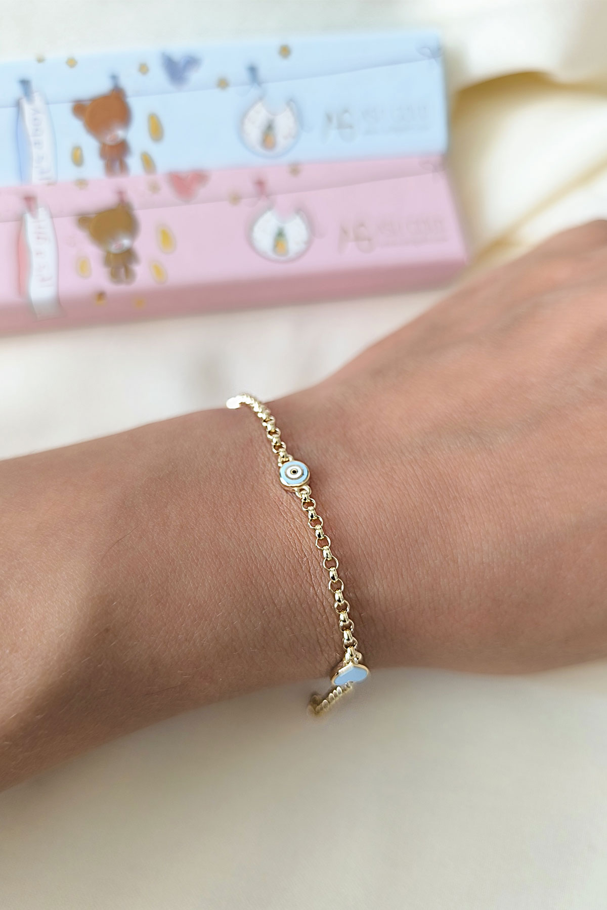 15 Cm boyunda günlük olarak da kullanıma uygun halka doc zincirli 14 ayar 1.80 gr ağırlığında altın nazar boncuğu detaylı çocuk bileklik. Hem kız hem erkek bebek için kullanıma uygundur.