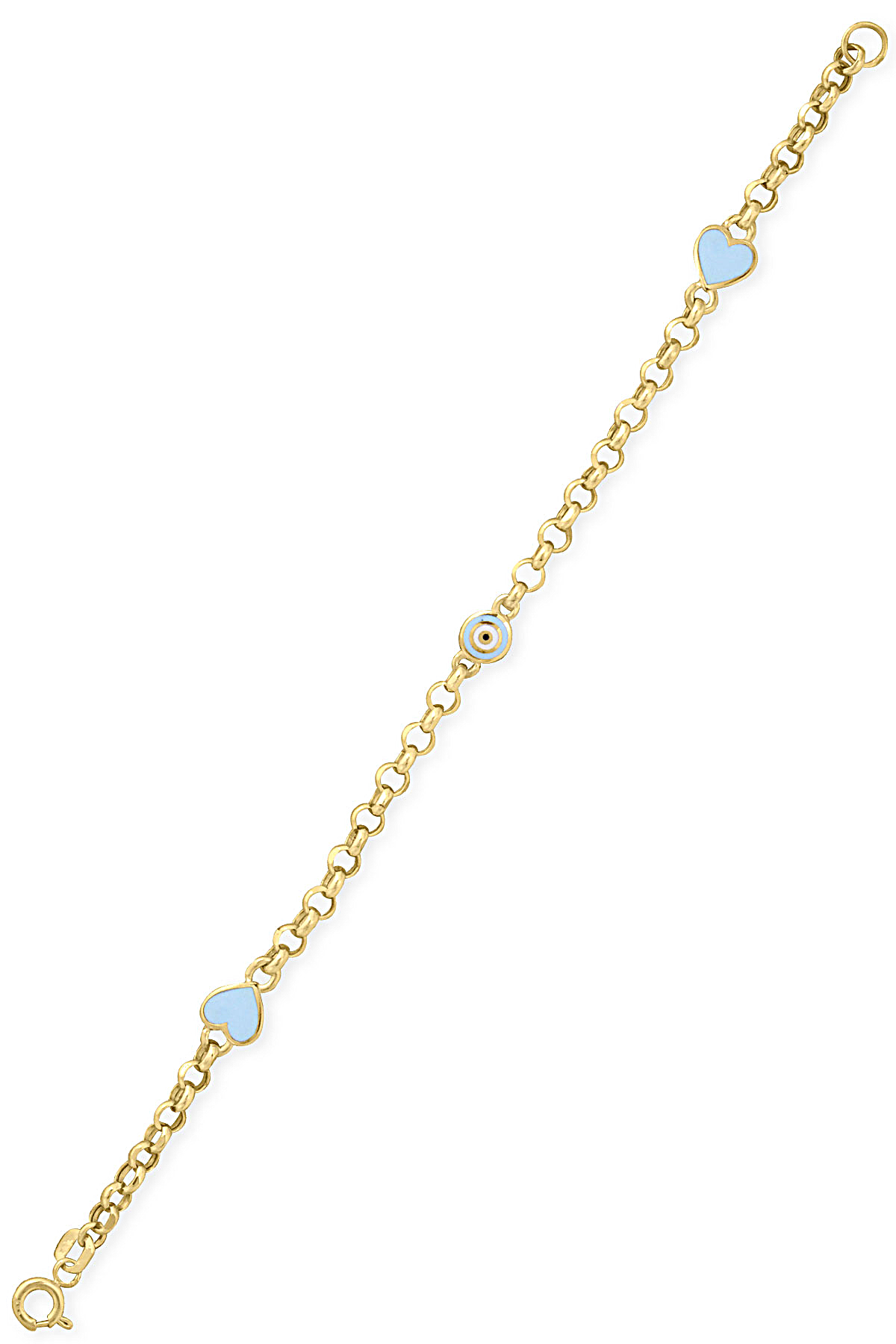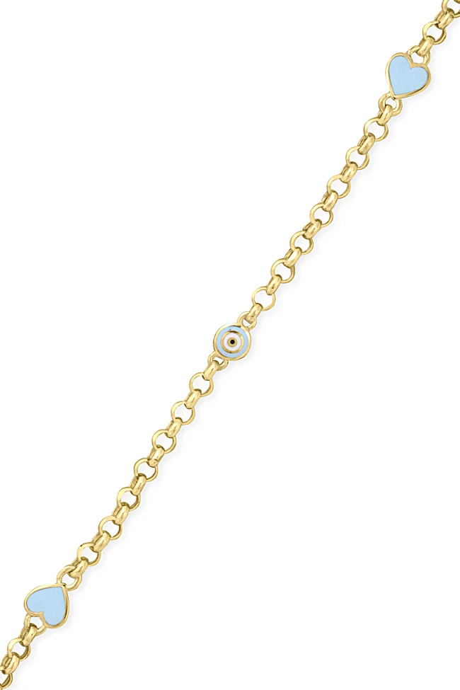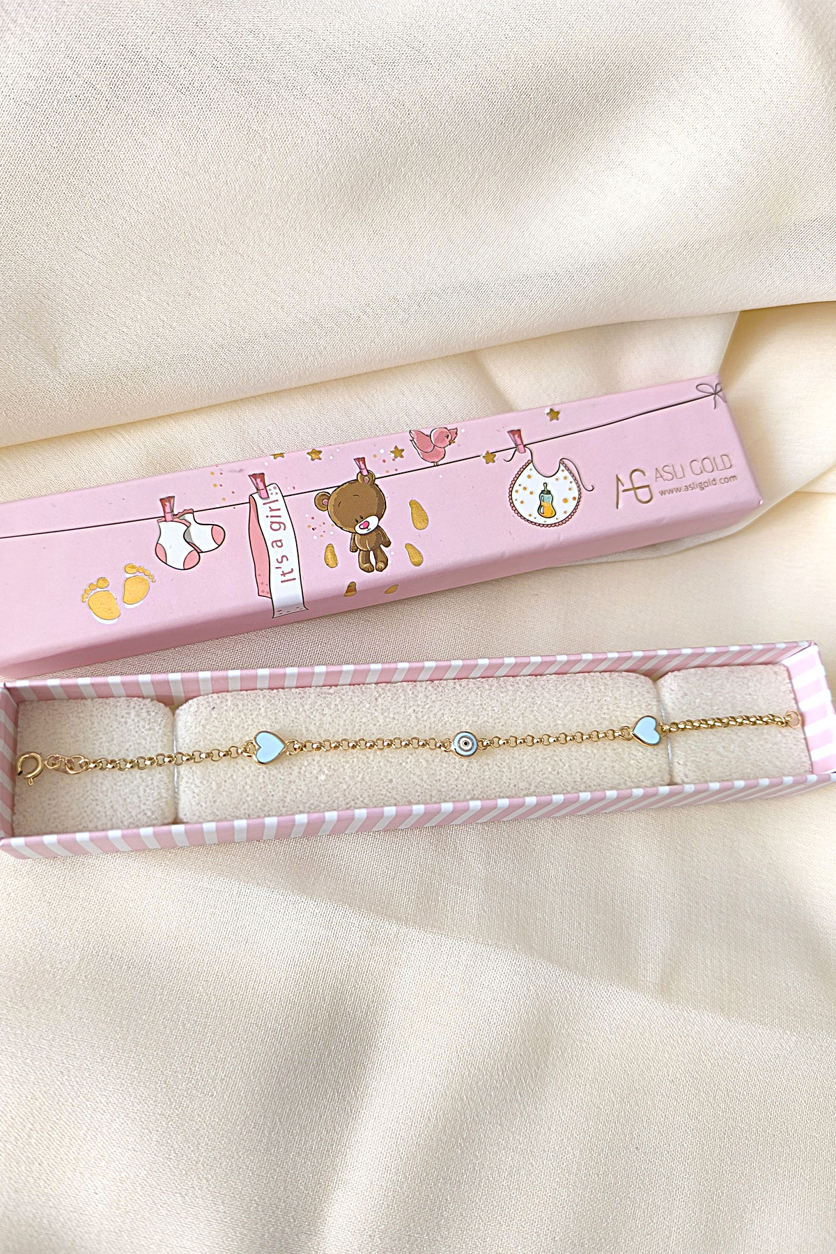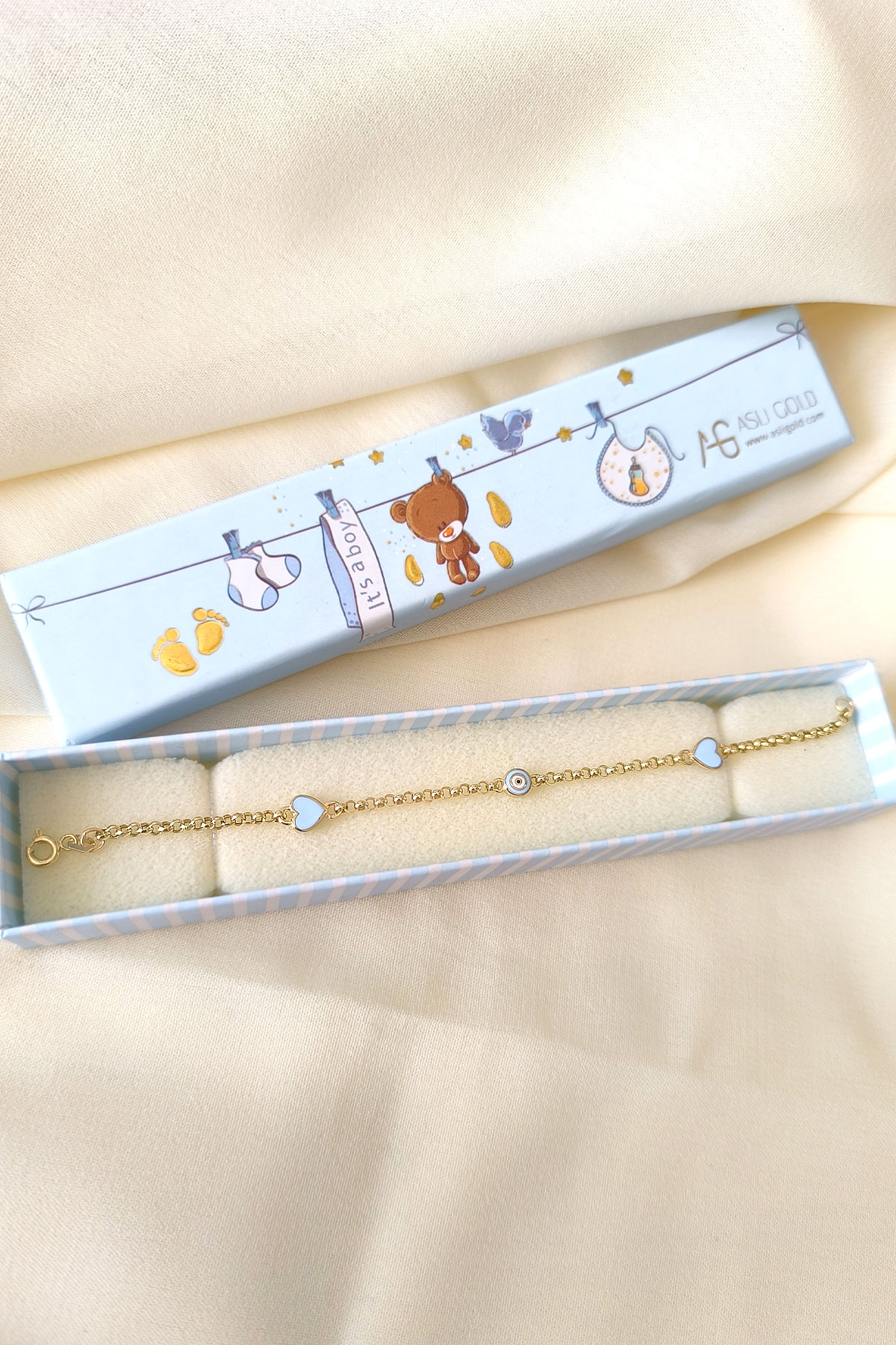 15 Cm boyunda günlük olarak da kullanıma uygun halka doc zincirli 14 ayar 1.80 gr ağırlığında altın nazar boncuğu detaylı çocuk bileklik. Hem kız hem erkek bebek için kullanıma uygundur.