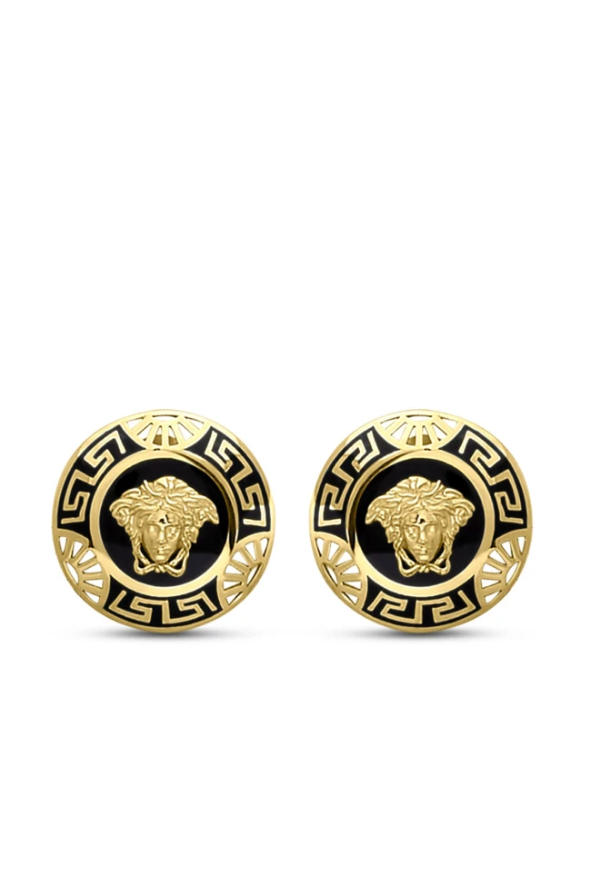 5.50 gr. 1.5 cm boyutunda Medusa model 14 ayar yuvarlak arkası vidalı siyah mine detaylı taşsız şık altın spor küpe.