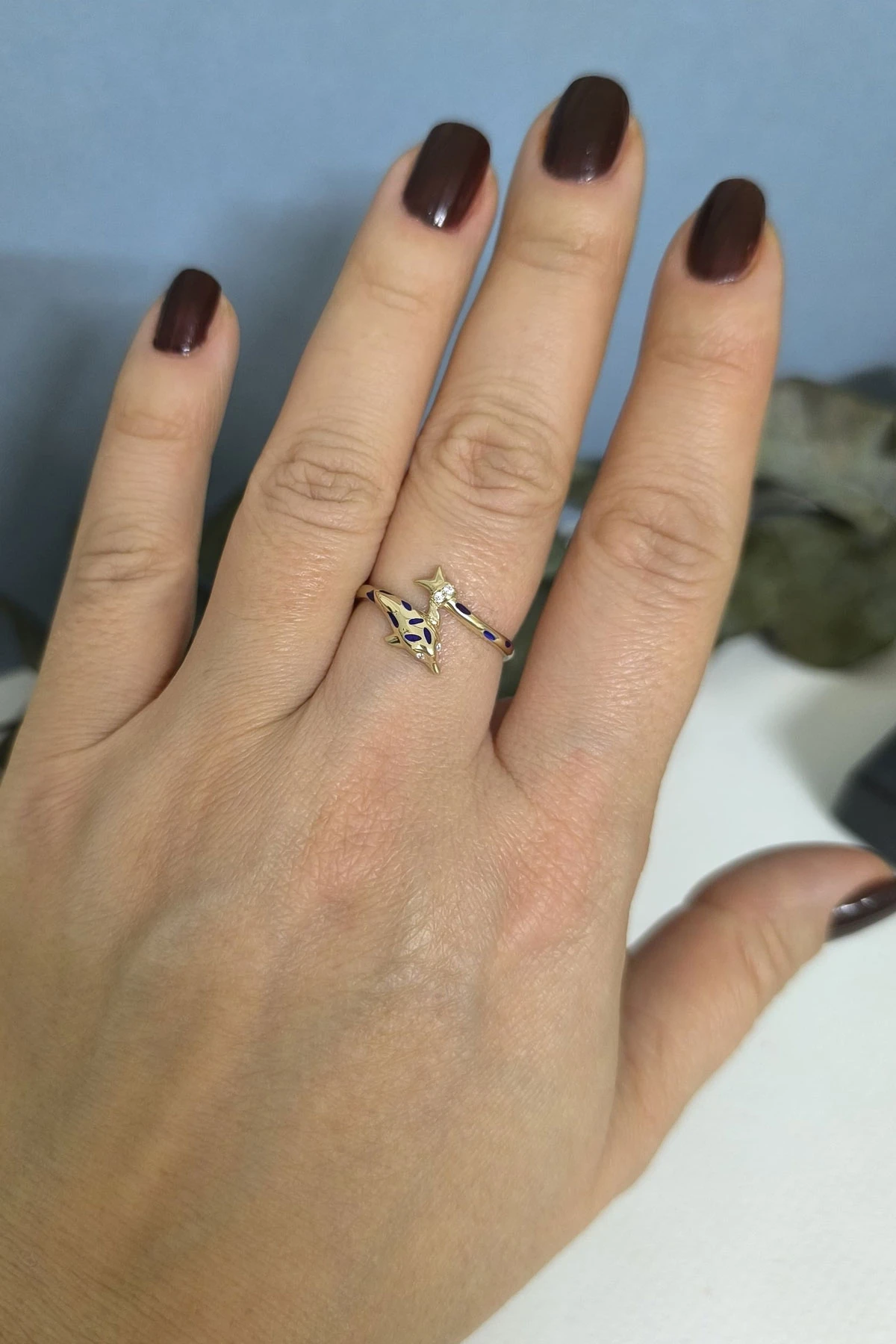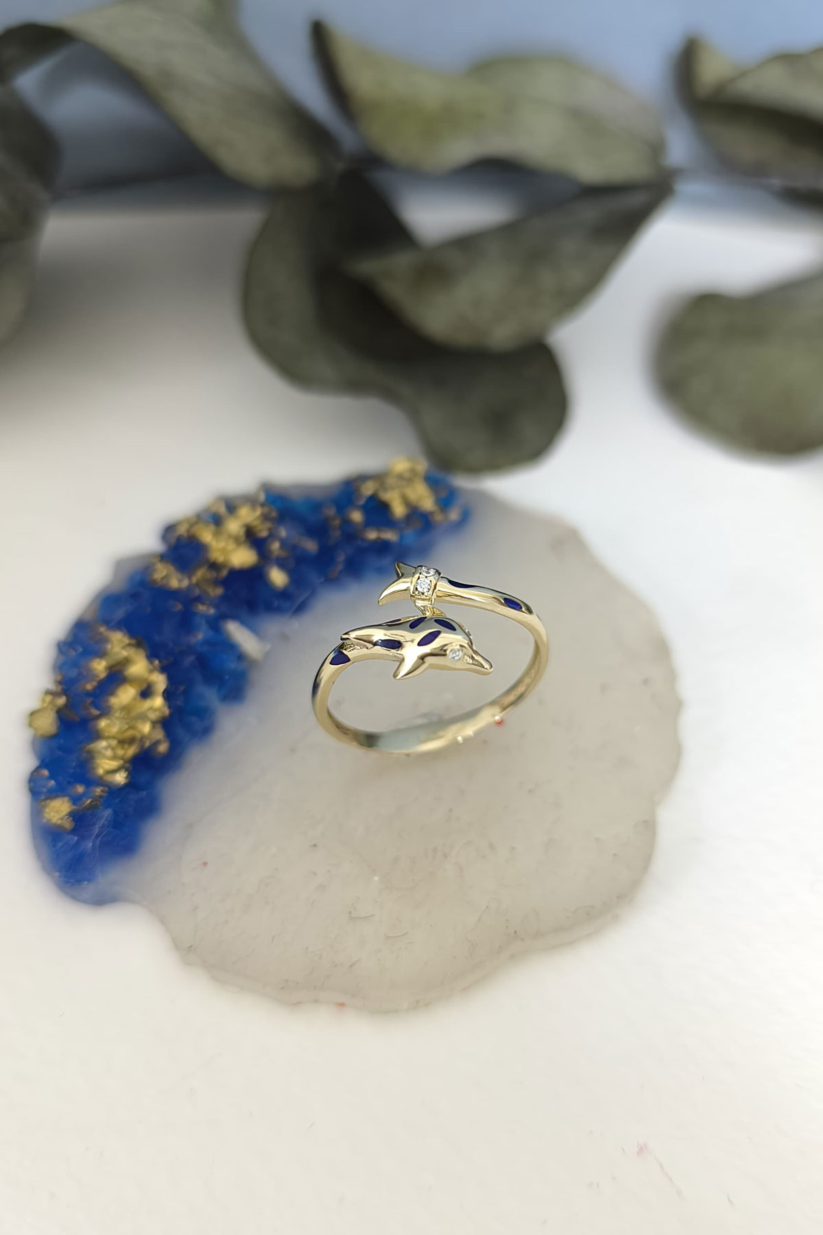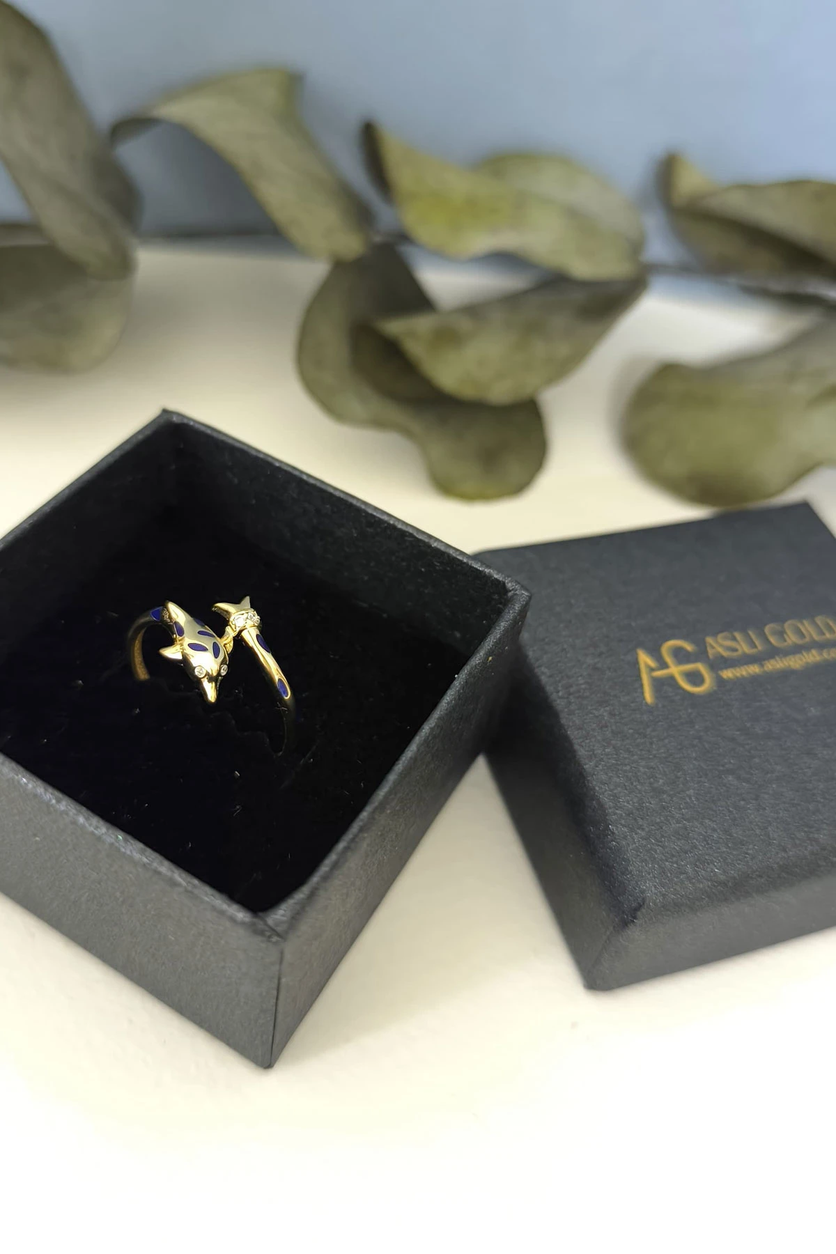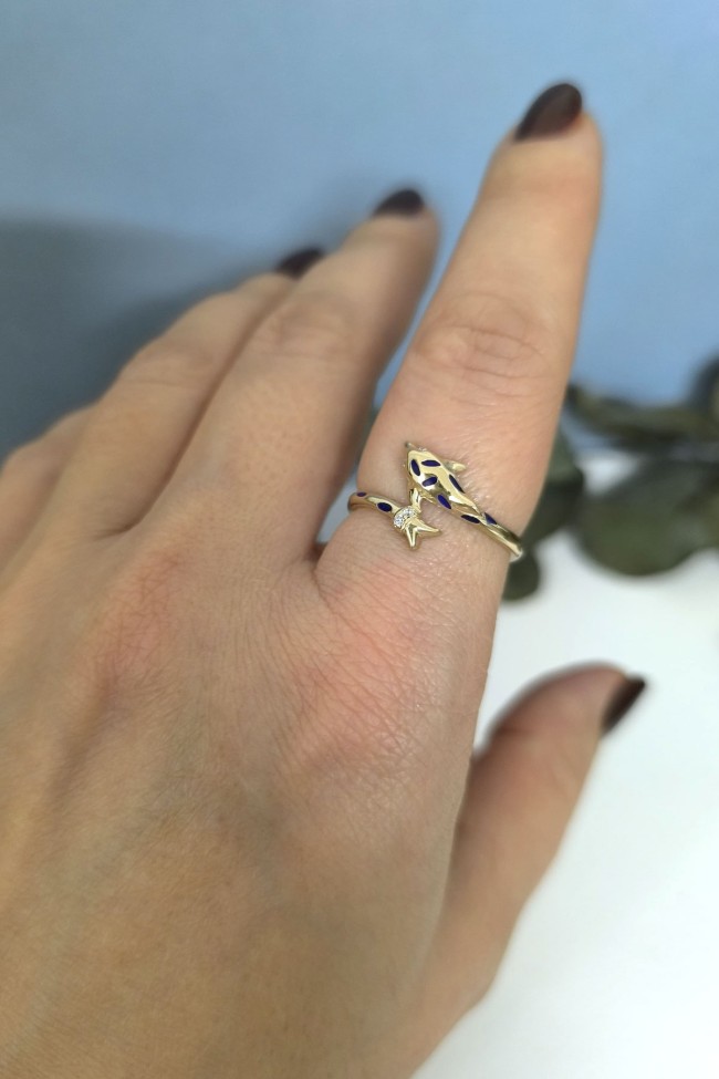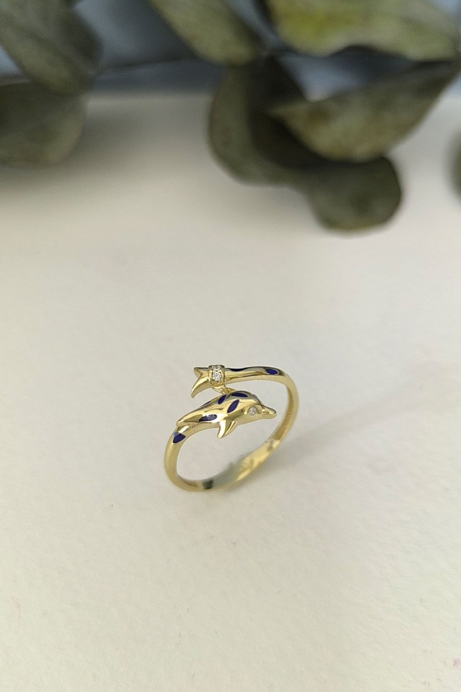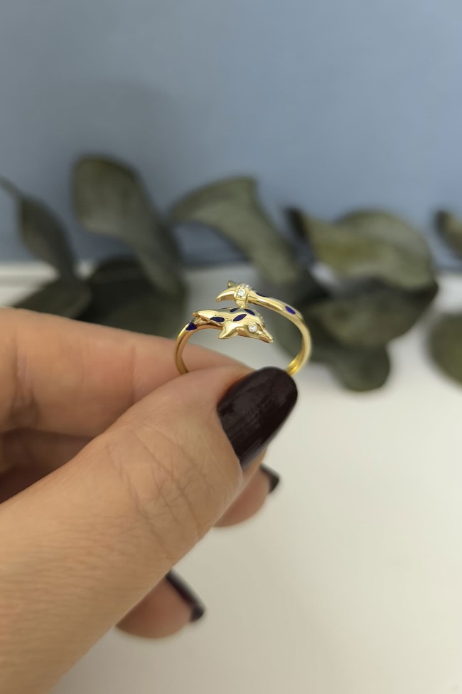 Kısmeti sembolize eden 14 ayar sarı altın tasarımıyla günlük kullanıma uygun 1.60 gram ağırlığında mineli yunus balığı yüzük.
