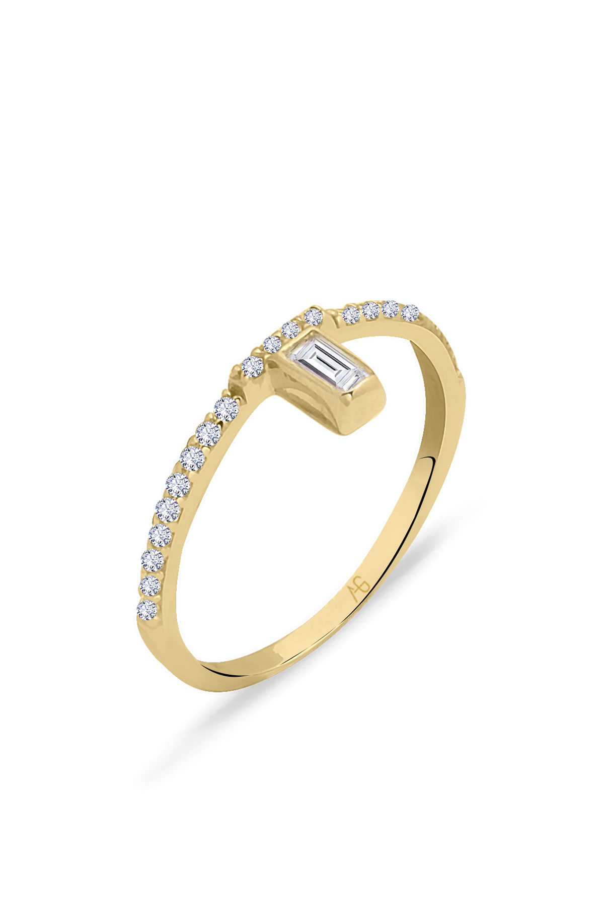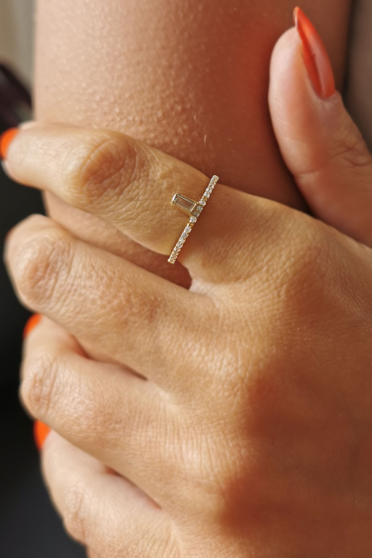 14 Ayar minimal tasarımlı zarif duruşa sahip ikili baget taş detayı ile sevdiklerinize yada kendinize armağan olarak tercih edebileceğiniz modern model günlük kullanıma uygun 1.10 gram ağırlığında farklı model yüzüklerinizle bir arada da kullanabileceğiniz altın kombin yüzük.