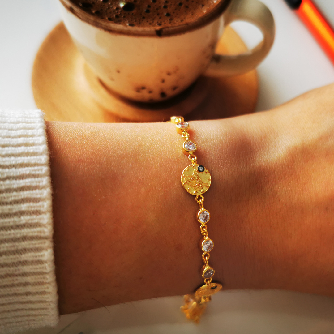 18.5 Cm boyunda günlük kullanıma uygun mini tuğralı tasarımı ile günlük olarak da kullanabileceğiniz 14 ayar 5.70 gr ağırlığında altın kadın bileklik.