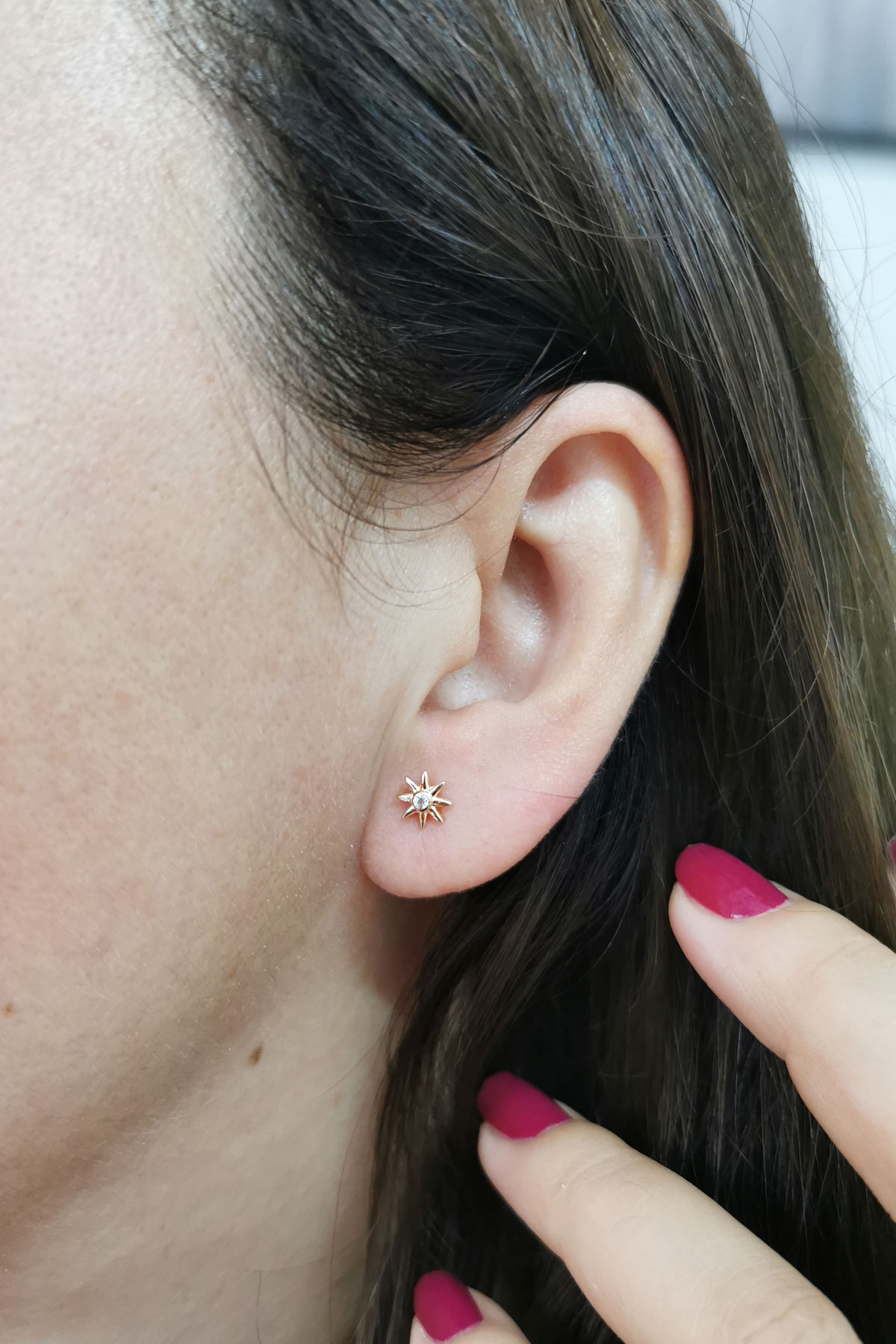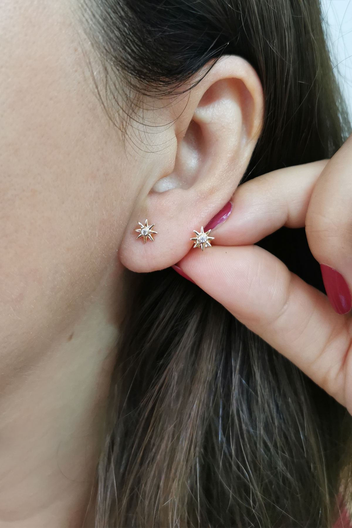 0.5 Cm boyunda zirkon taş detaylı minimal ışıl ışıl 14 ayar 0.80 gr ağırlığında yıldız model vidalı altın küpe.