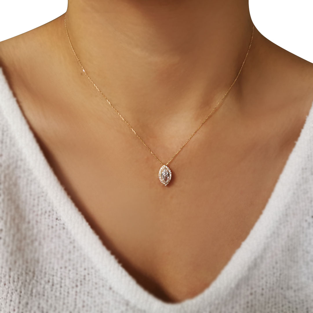 45 Cm zincirli 2.15 gr. 1.5 cm boyutunda zarif model 14 ayar altın şık ve minimal duruşa sahip markiz taşlı kolye. *Ürünlerimiz faturalıdır güvenle satın alabilirsiniz, özel hediye kutusunda ücretsiz kargo ile gönderilecektir.