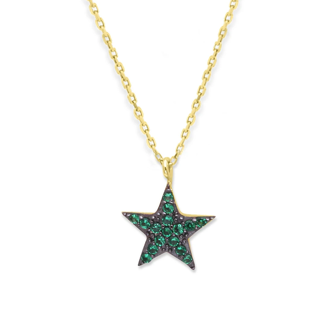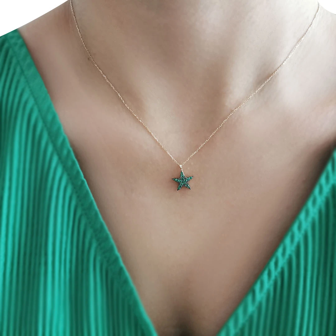 45 Cm zincirli 1.45 gr. 1.3 cm boyutunda zirkon yeşil taşlı model 14 ayar altın minimal yıldız kolye. Farklı zincirlerinizle bir arada kombine olarak kullanabileceğiniz harika bir model.