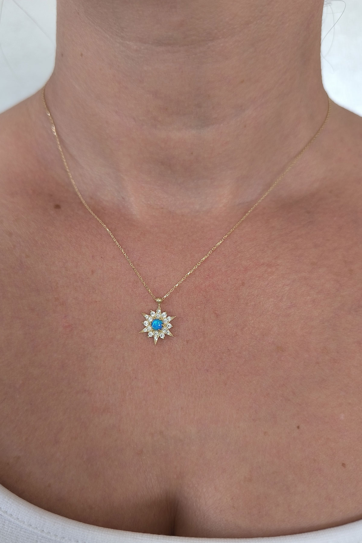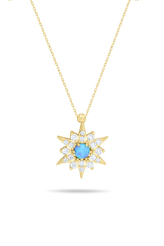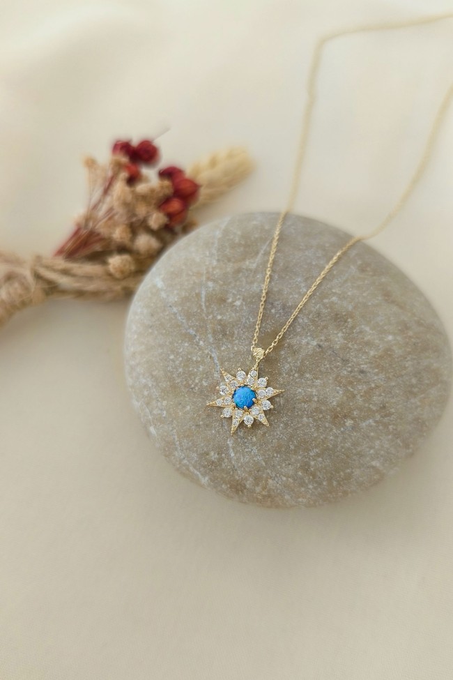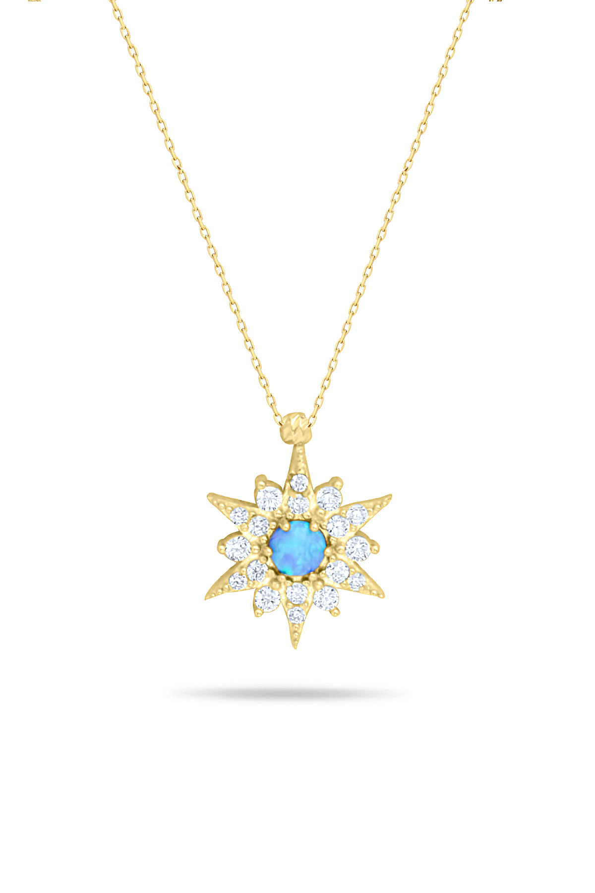 45 Cm zincirli 2.00 gr. 1.7 cm boyutunda zirkon ve mavi opal taş detaylı günlük kullanıma uygun 14 ayar altın yıldız kolye.