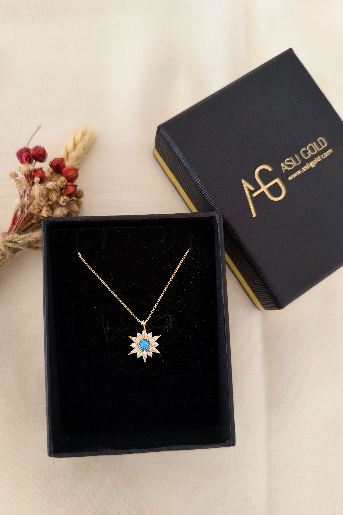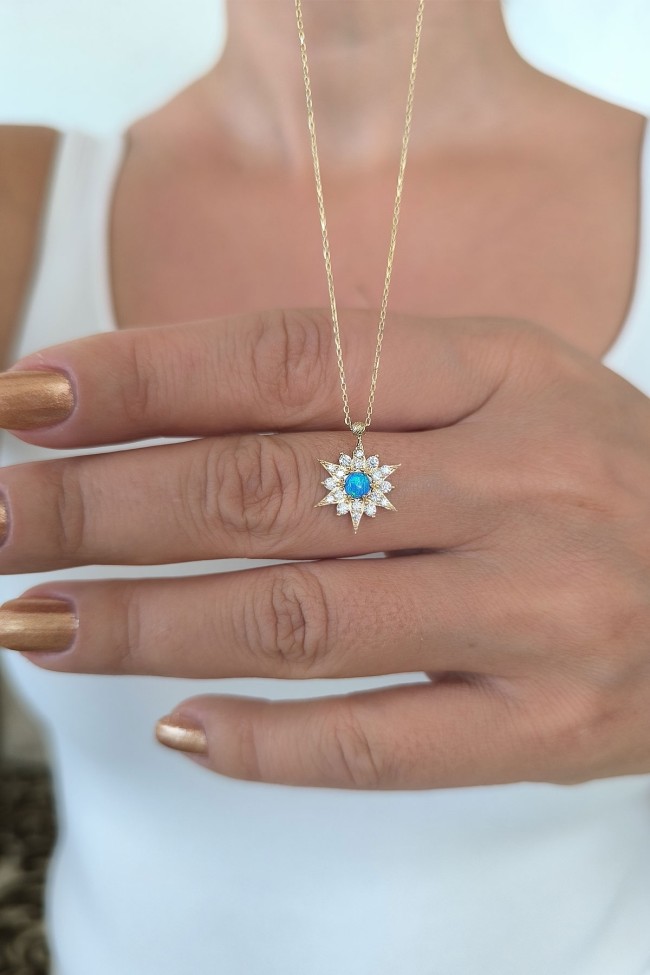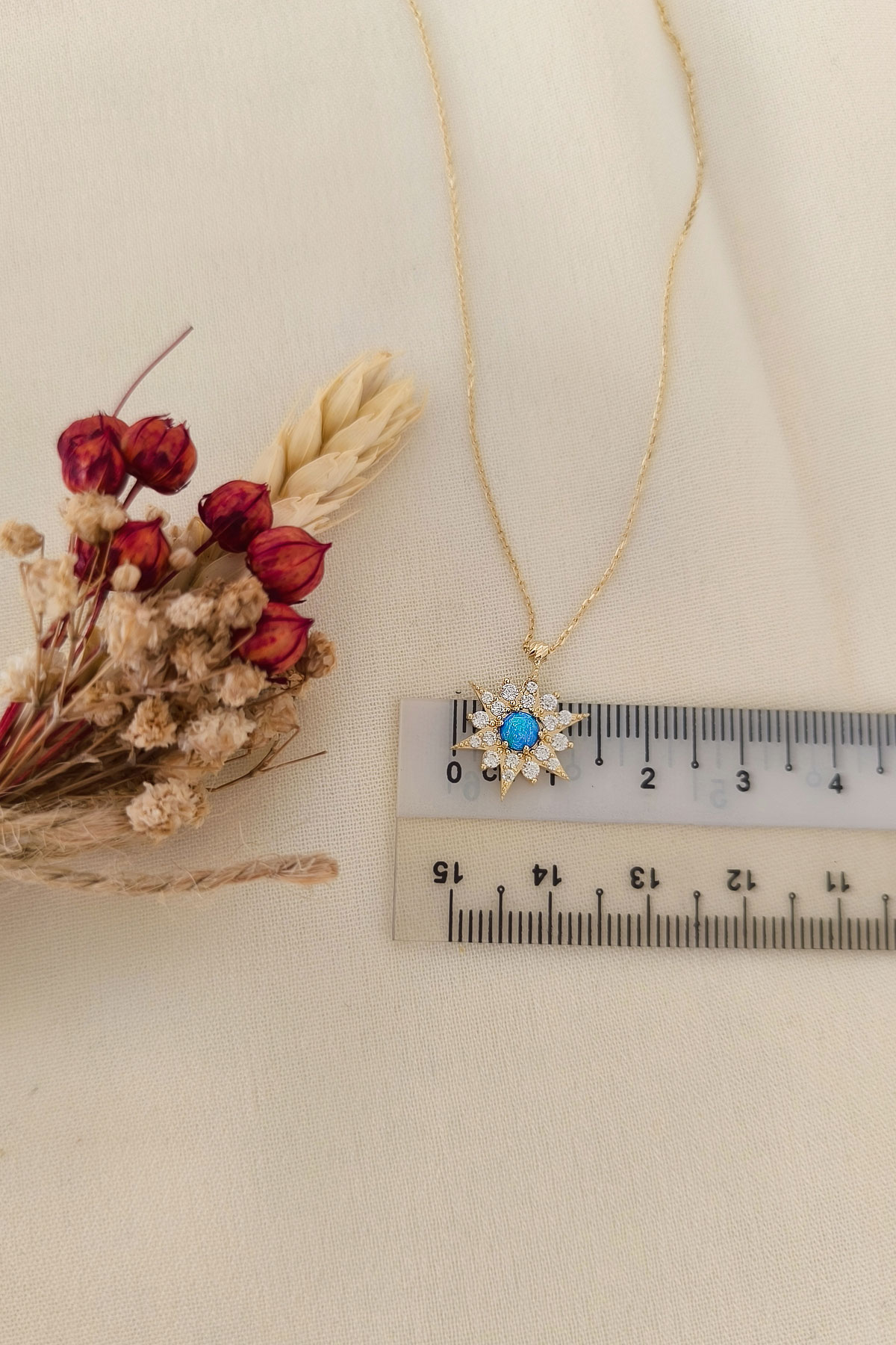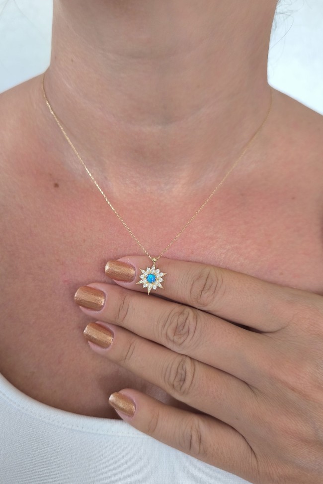 45 Cm zincirli 2.00 gr. 1.7 cm boyutunda zirkon ve mavi opal taş detaylı günlük kullanıma uygun 14 ayar altın yıldız kolye.