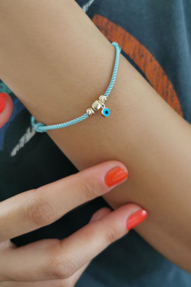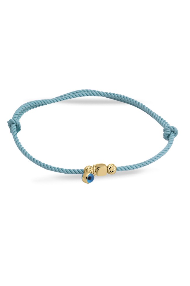 Mint yeşil ipli tasarımı ile günlük olarak saatlerinizle yada tek olarak kullanabileceğiniz sevdiklerinize doğum günü hediyesi olarak da armağan edebileceğiniz 14 ayar 0.65 gr ağırlığında 14 ayar altın dorika ve küp detaylı nazar bileklik.