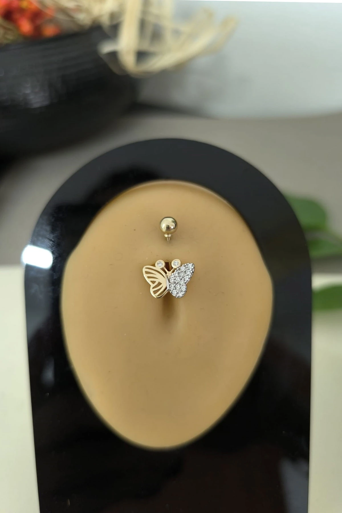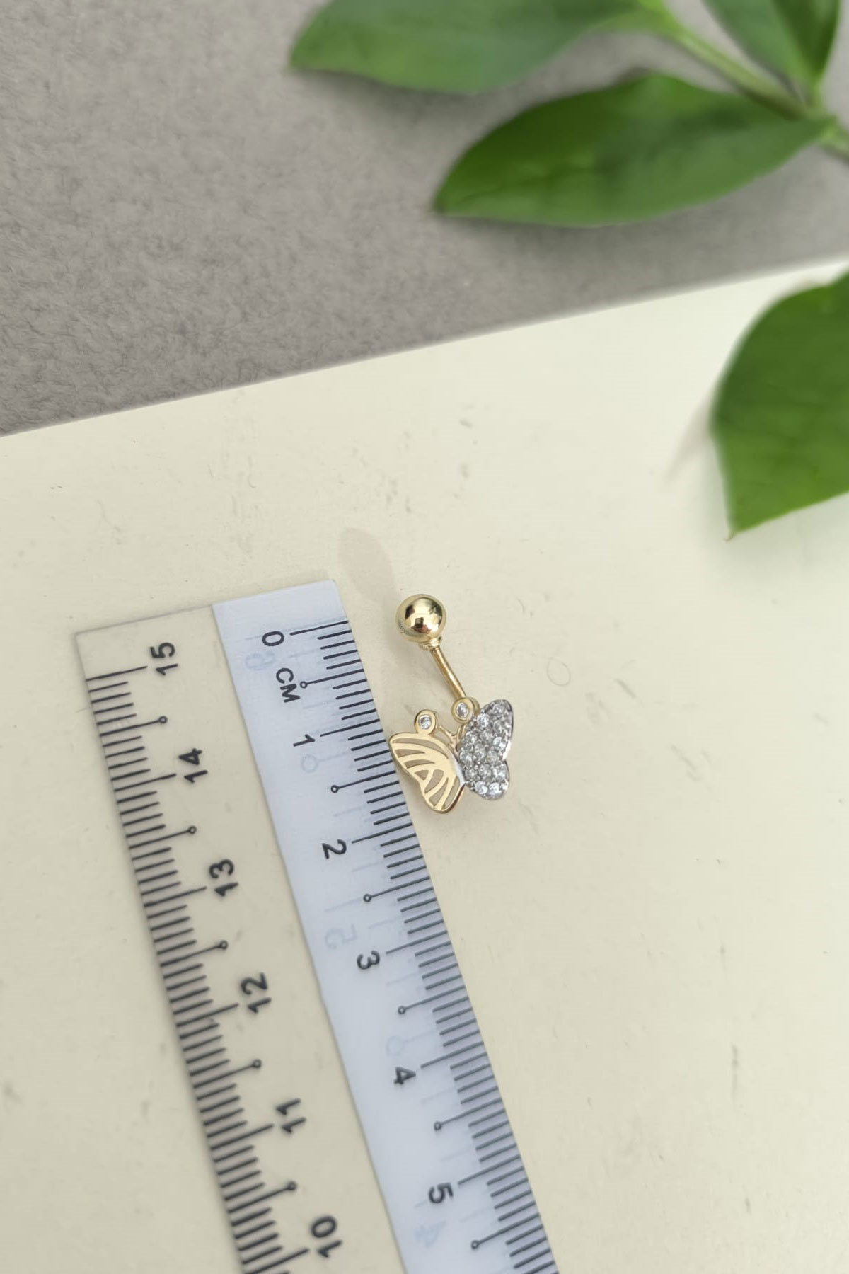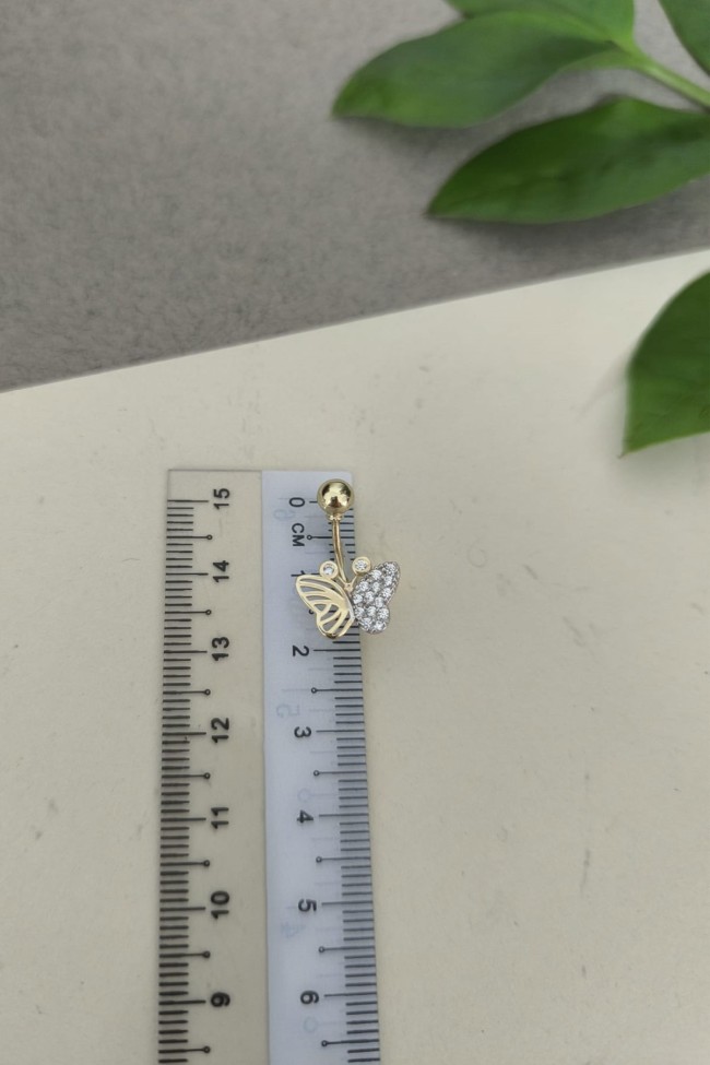 Motif Kelebek Model Işıl Işıl Zirkon Taşlı 14 Ayar Altın Göbek Piercingi. İnsan vücuduna en uyumlu değerli maden olan altın göbek piercinglerini sağlıkla ve güvenle uzunca seneler kullanabilirsiniz.