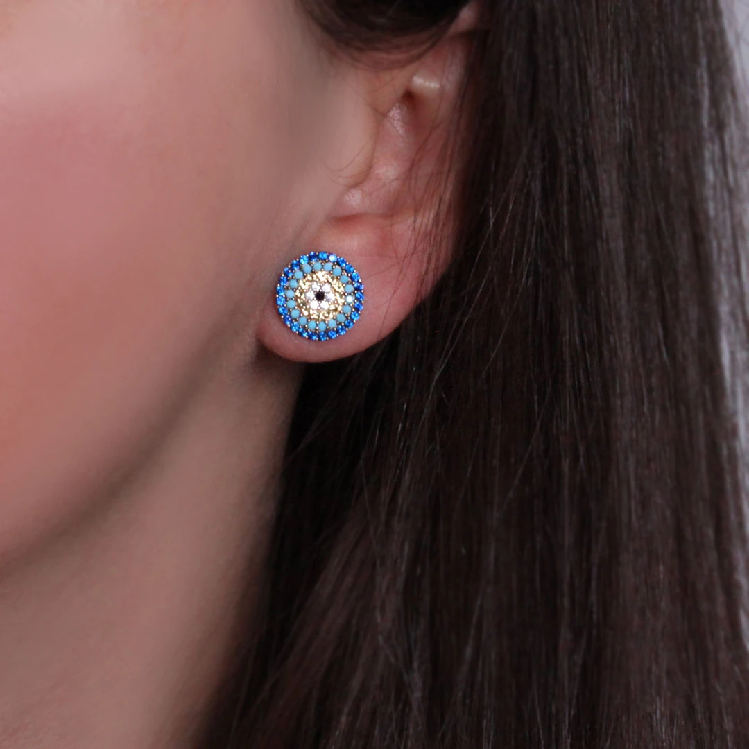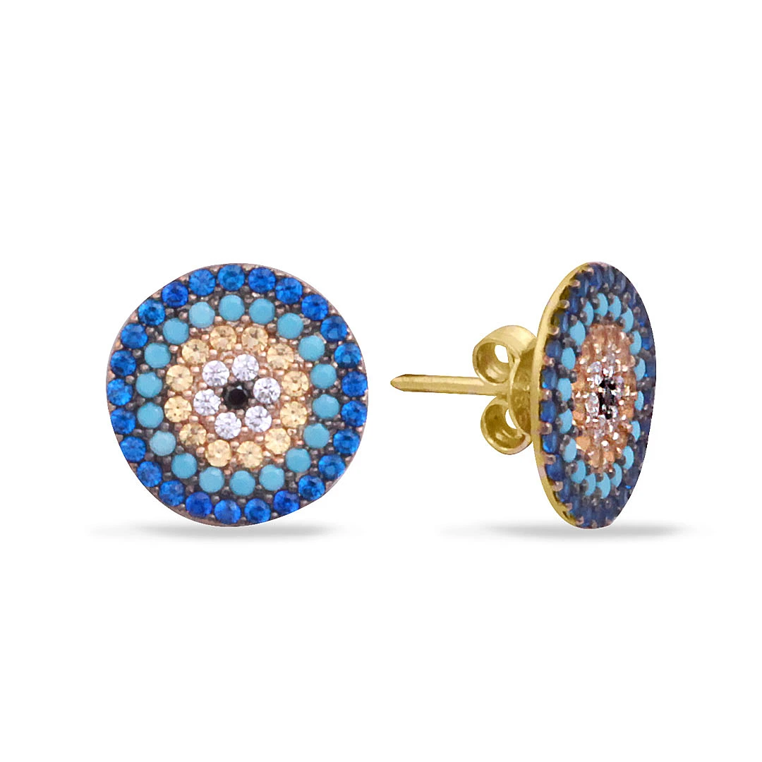 14 Ayar 1.2 cm boyutunda zirkon taş detaylı ışıl ışıl ve şık duruşa sahip günlük kullanıma uygun 2,50 gram ağırlığında spor model altın vidalı nazar küpe.