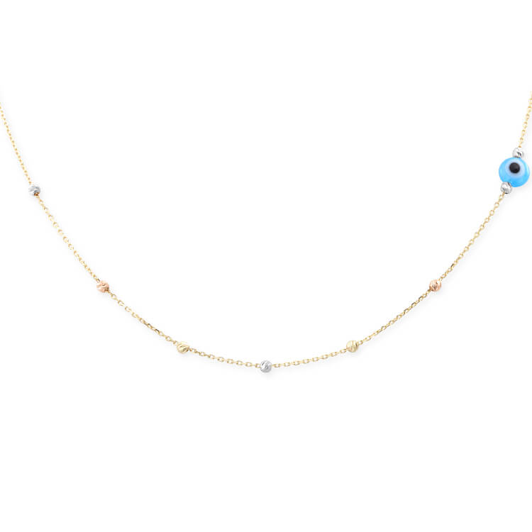 Nazar boncuğunun sadeliği ve ışıltılı topların zarif duruşu beraberliğinde kombine olarak gerçekten günlük kullanımda severek takacağınız harika bir 14 ayar altın kolye modeli. *Ürünlerimiz faturalıdır güvenle satın alabilirsiniz, özel hediye kutusunda ücretsiz kargo ile gönderilecektir.