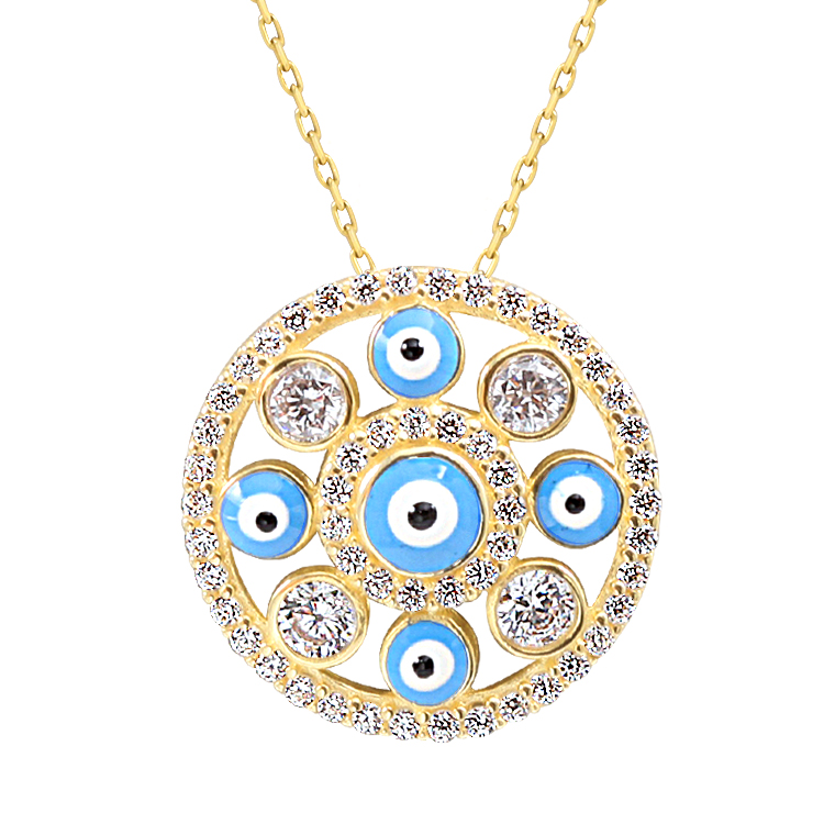 14 Ayar altın nazar boncuğu mineli şık ve taşlı tasarım kolye modeli ile kem gözlerden ışıl ışıl bir tasarımla korunun.