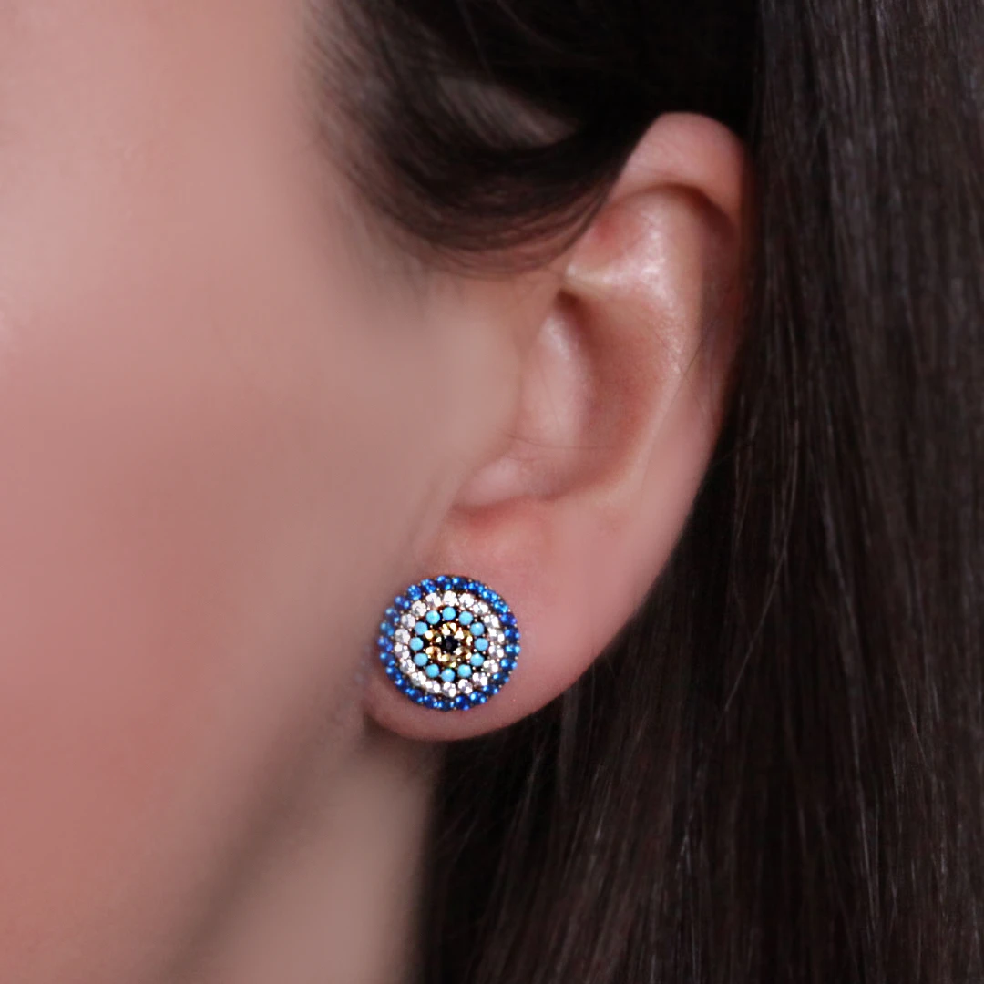 14 Ayar 1.2 cm boyutunda zirkon taş detaylı ışıl ışıl ve şık duruşa sahip günlük kullanıma uygun 2,50 gram ağırlığında spor model altın vidalı nazar boncuk küpe.