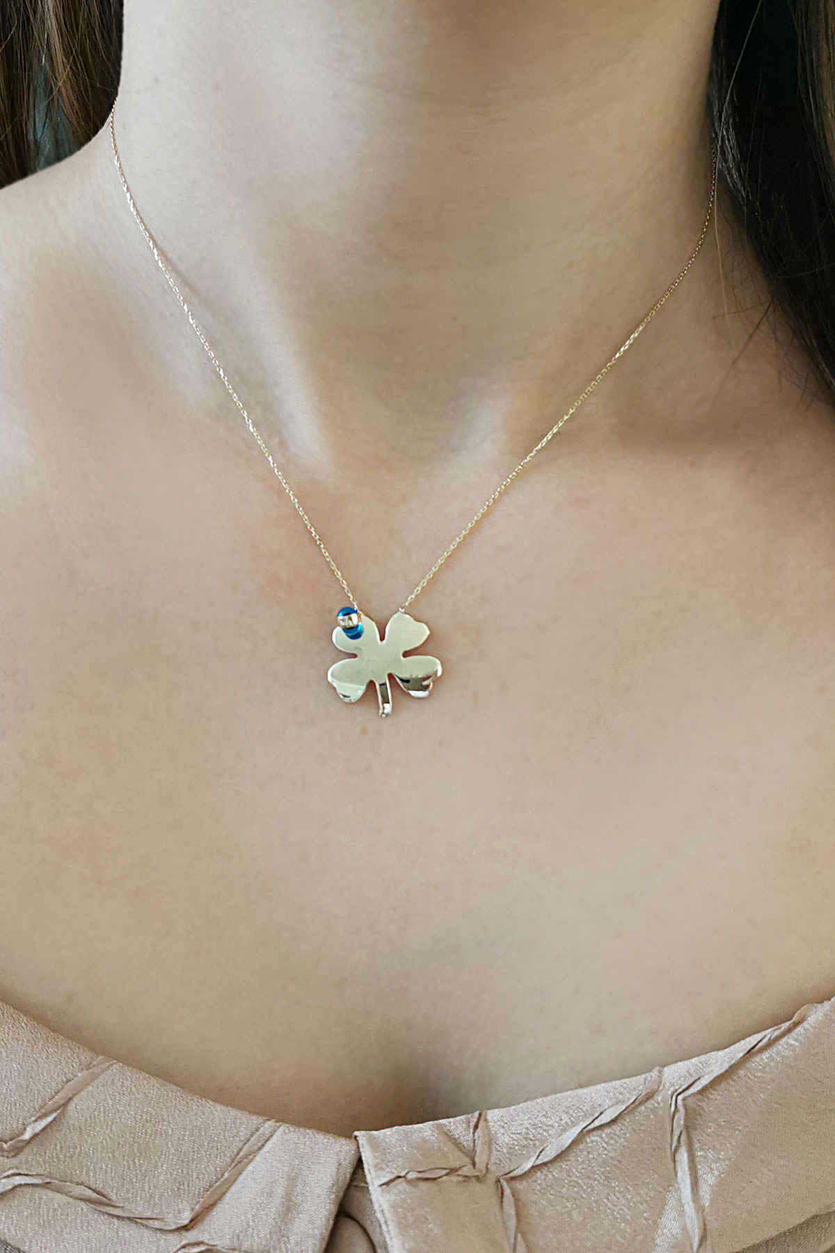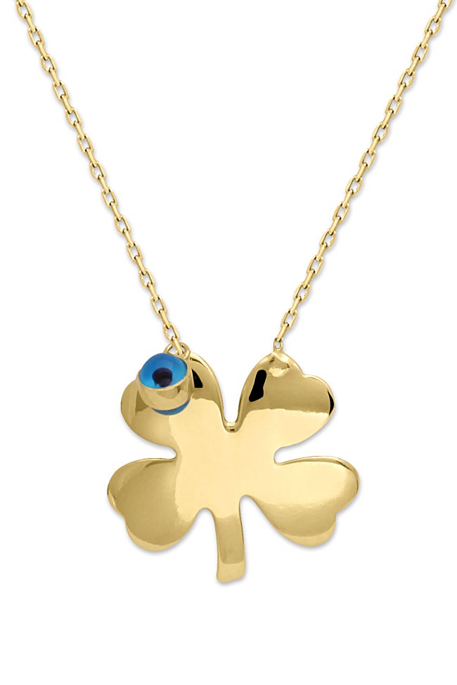 45 Cm Zincirli 14 Ayar Mini Nazar Boncuğu Detaylı Işıl Işıl  Zirkon Taşlı 2.50 Gr. Ağırlığında Altın Şans Yoncası Kolye.