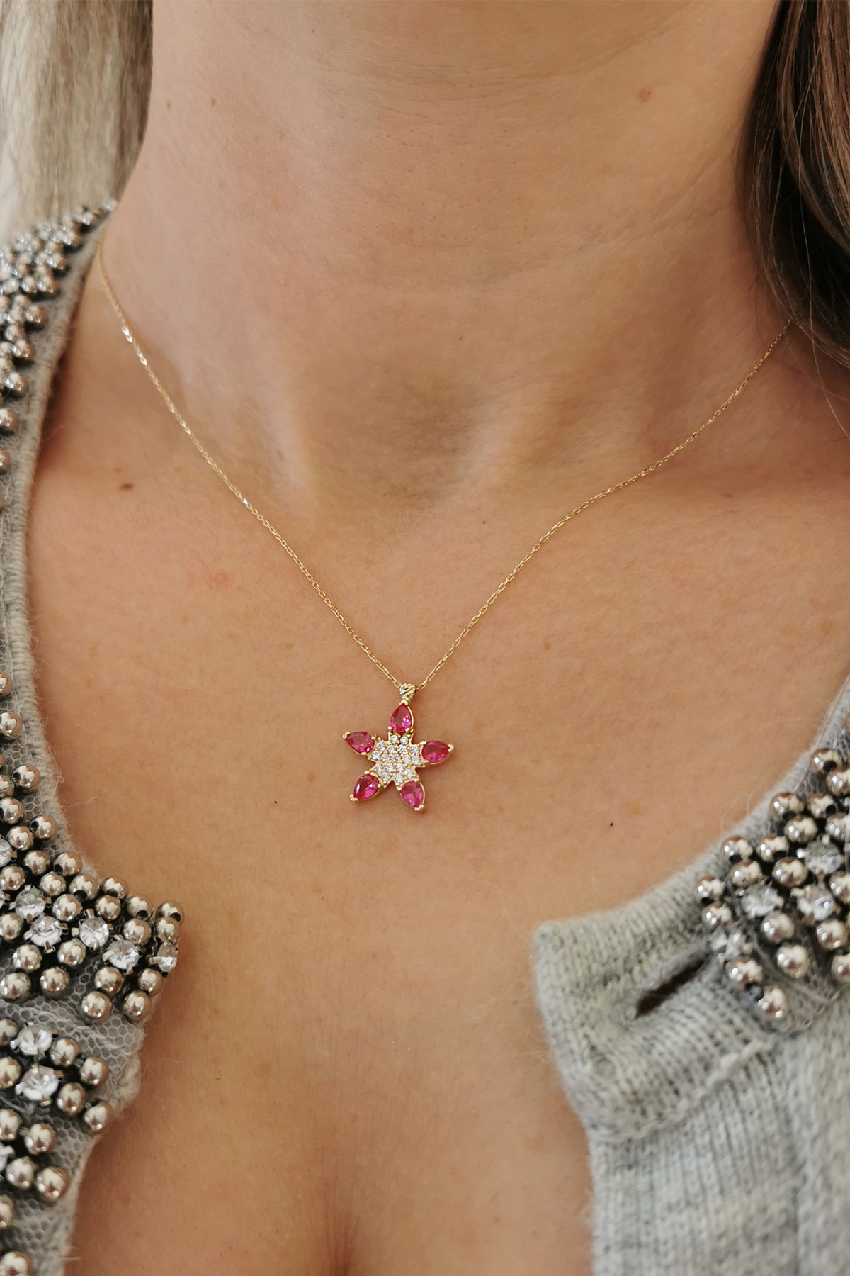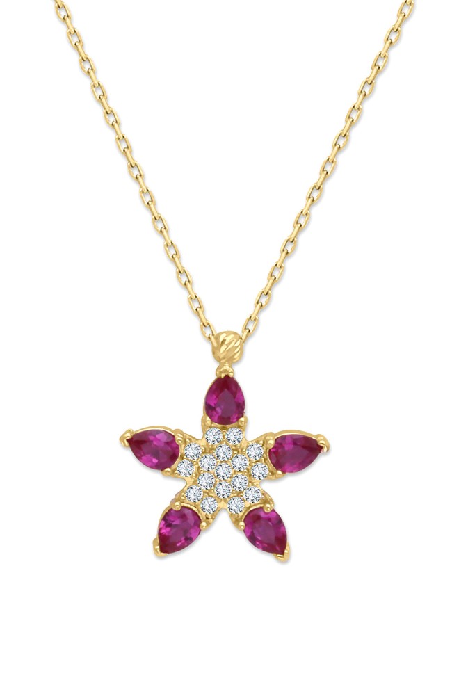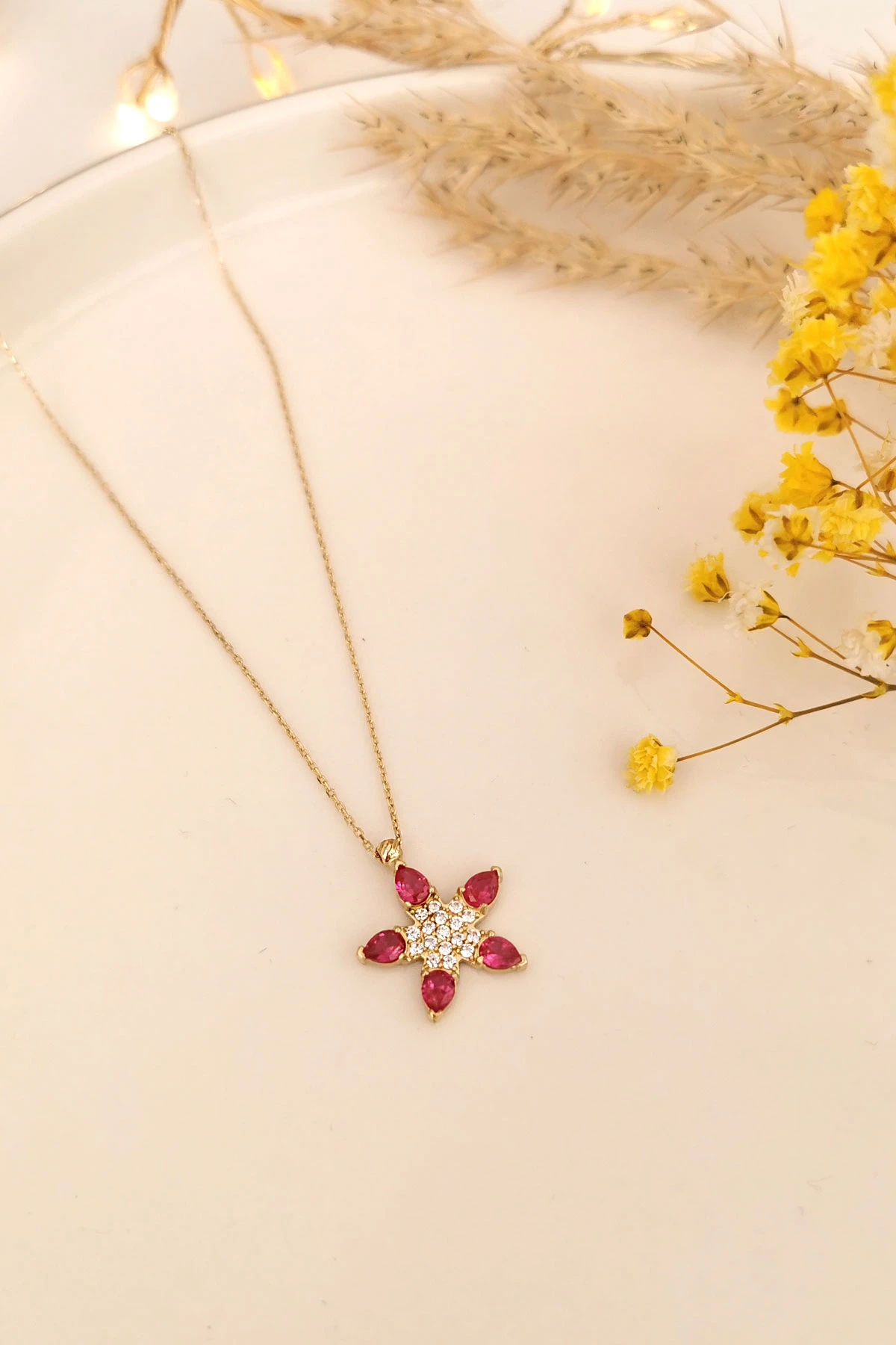 1.7 Cm Boyunda Kendinden 45 Cm Zincirli 14 Ayar Kırmızı Taşlı Minimal Tasarıma Sahip Işıl Işıl Günlük Kullanıma Uygun 2.15 Gr. Ağırlığında Altın Nergis Çiçeği Kolye.