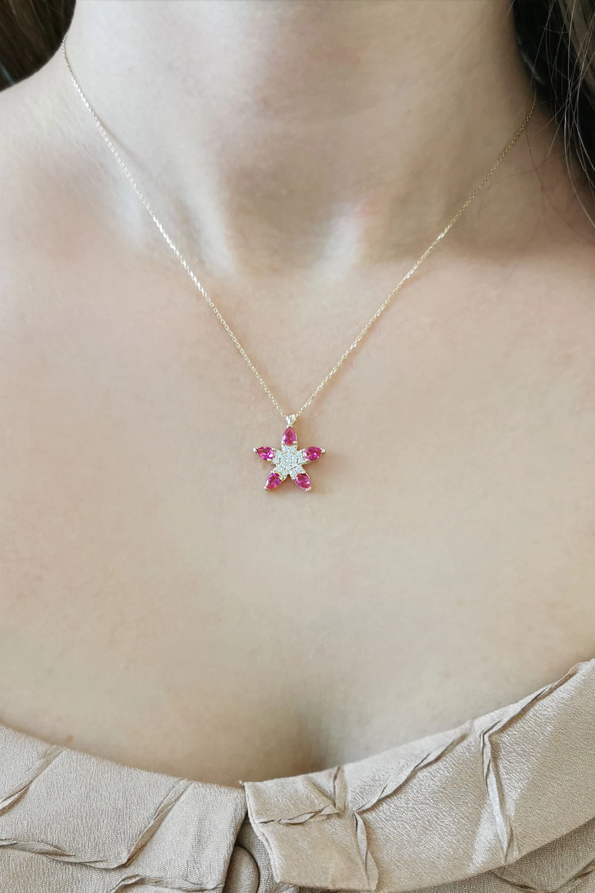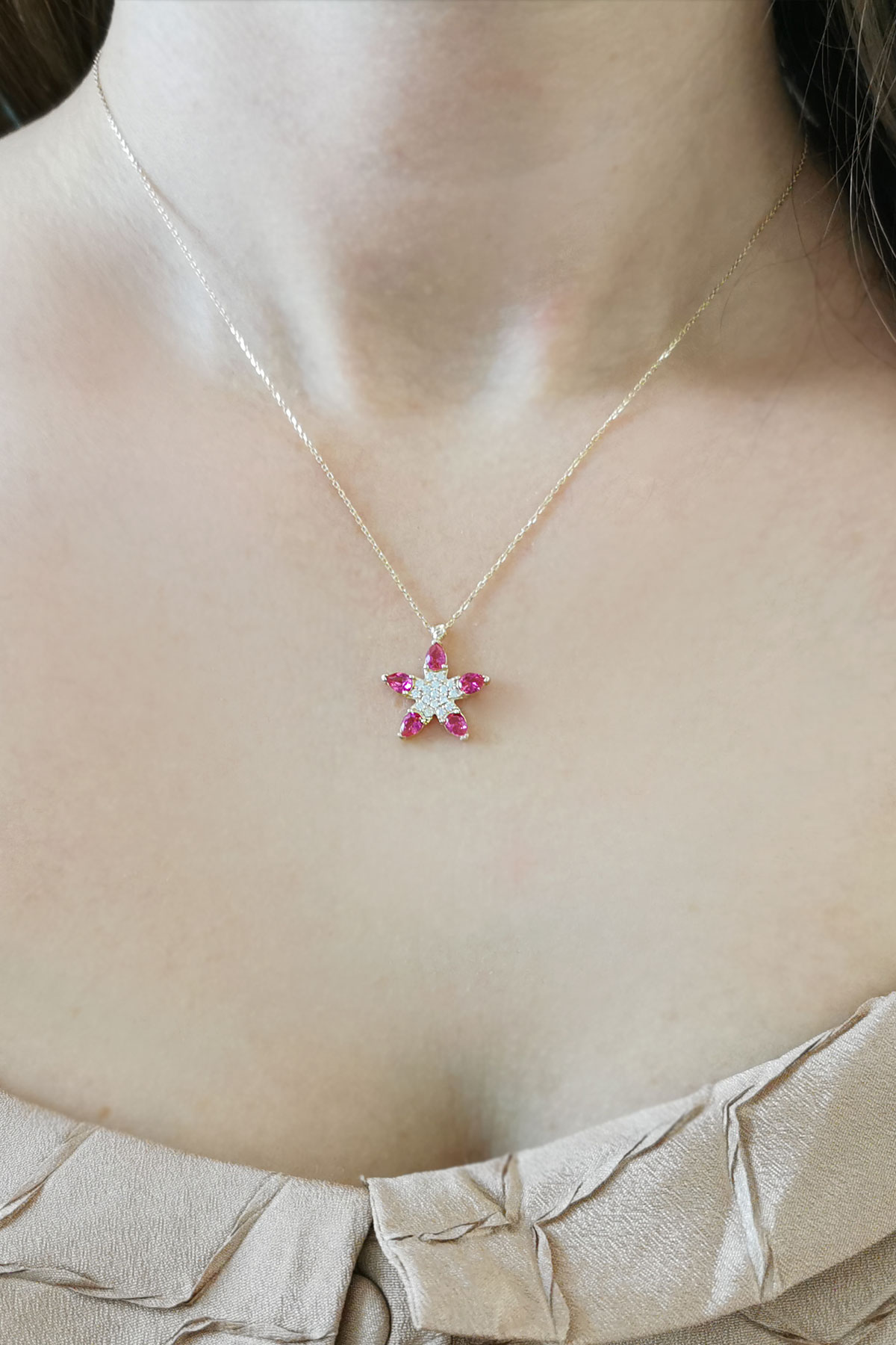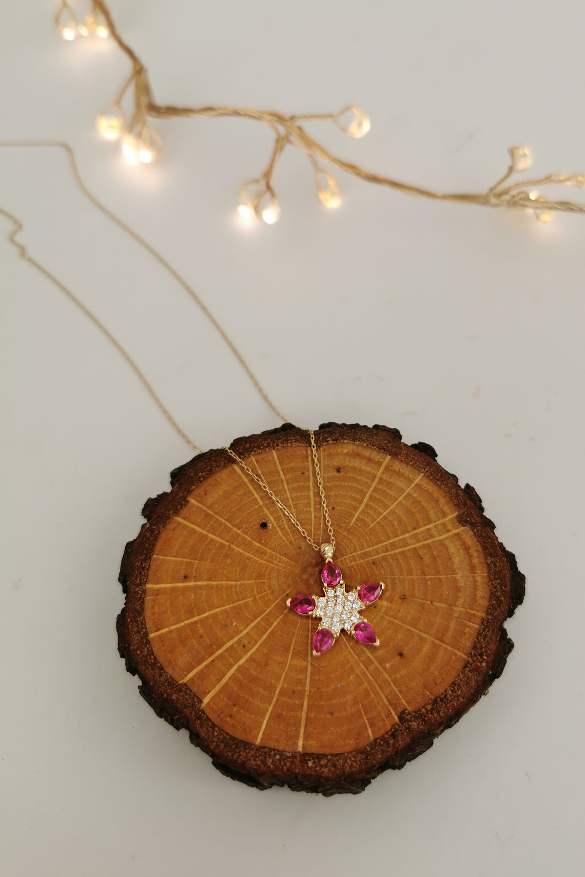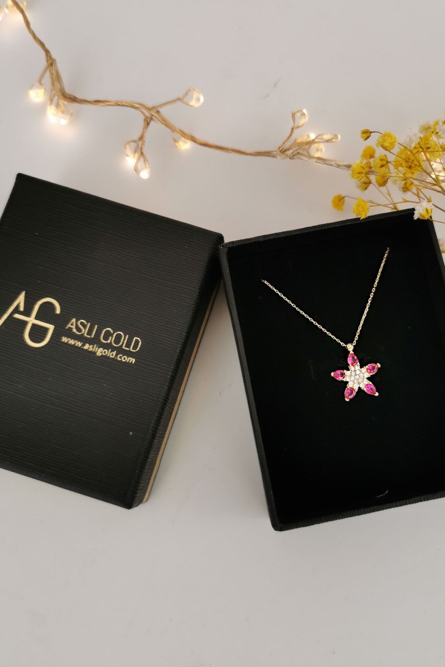 Zirkon taşlarının parıltısı, kırmızı taş detaylarıyla birleşerek dikkat çekici bir kontrast oluşturur. 1.7 cm boyutundaki nergis çiçeği formu, zarafet ve zarif duruşun simgesi olarak her yaşta kadına hitap eder. Günlük kullanımda zarif bir dokunuş, özel günlerde ise etkileyici bir tamamlayıcı arayanlar için ideal bir seçimdir. Aslı Gold’un titiz işçiliğiyle hazırlanan bu kolye, stilinizi doğanın zarafetiyle buluşturur.
