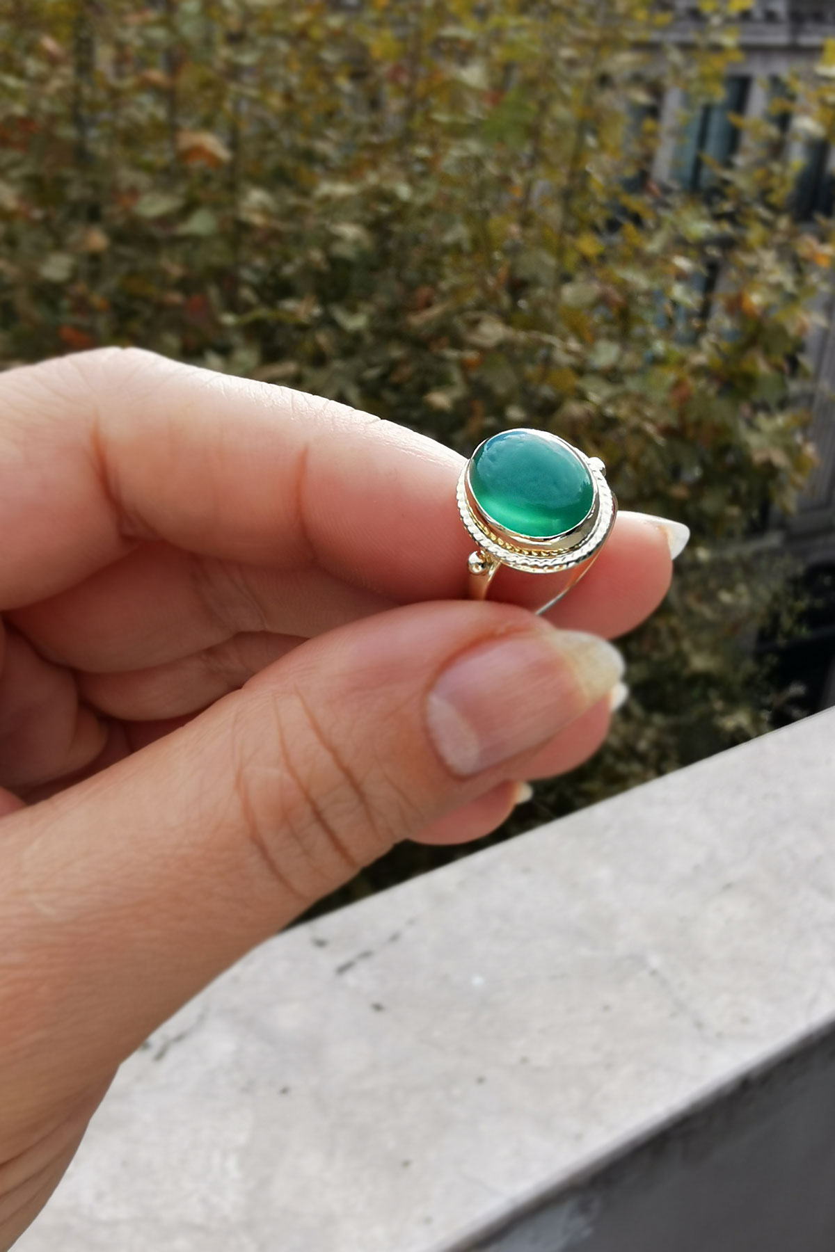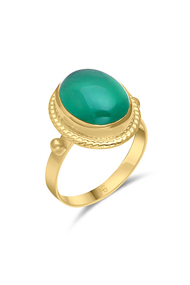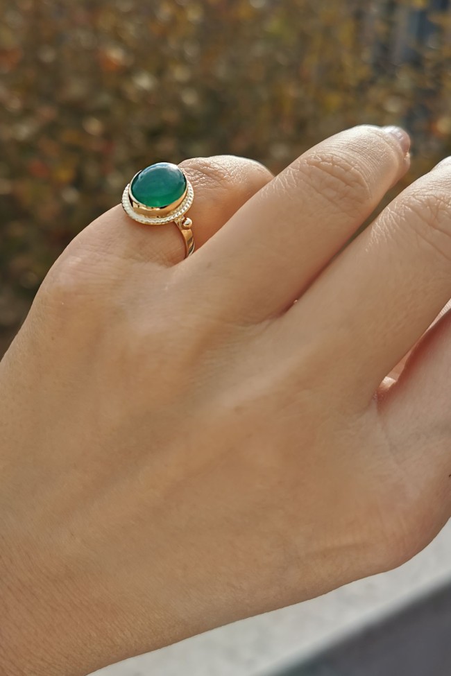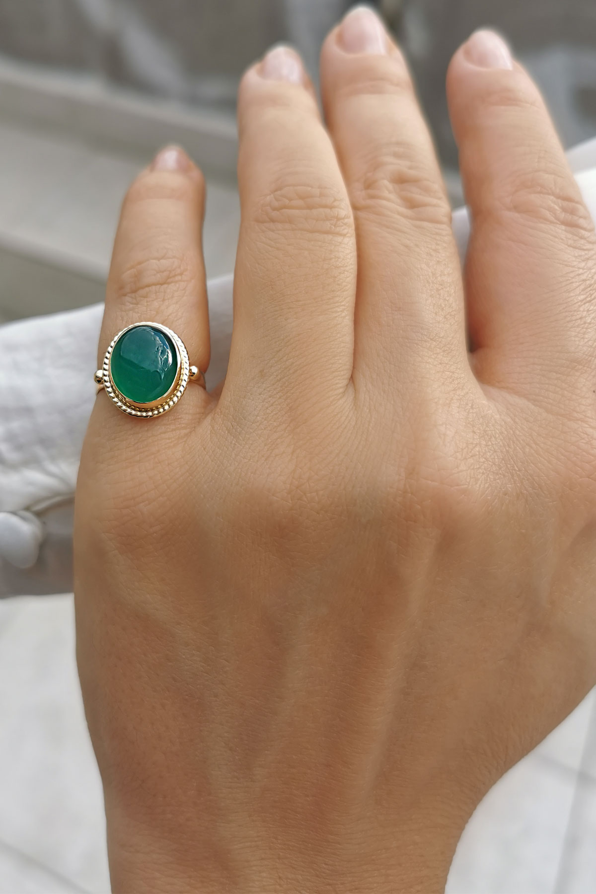 2.20 Gram Ağırlığında Modern Retro Bir Tarzı Olan Günlük Kullanıma Uygun 14 Ayar Altın Yeşil Renk Kapşon Kesim Taşlı Altın Yüzük.