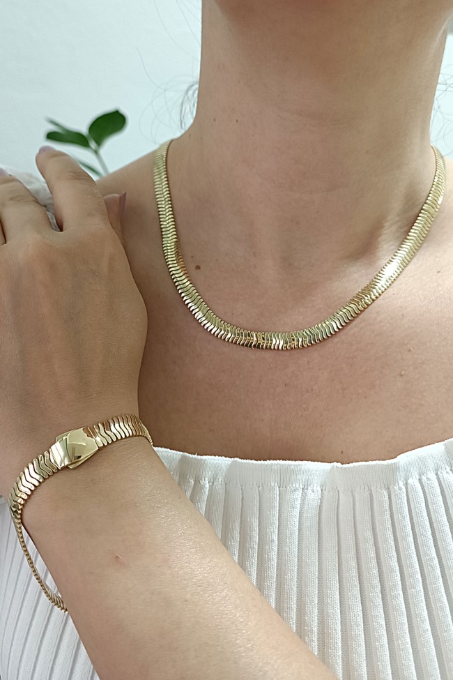 14 Ayar geniş şık ve modern tasarım günlük kullanıma uygun taşsız ışıl ışıl özel detay tokalı kilidi ile oldukça iddialı bir model 32.40 gram ağırlığında altın omega gerdanlık & kolye bileklik.