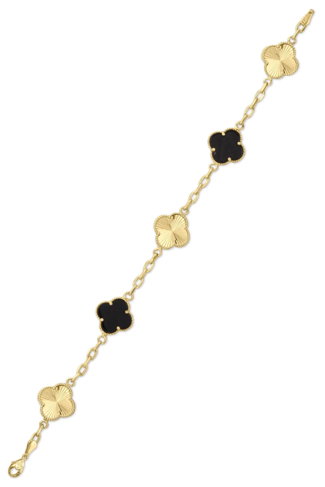 14 Ayar şık ve zarif duruşa sahip günlük kullanıma uygun 7.80 gram ağırlığında 18 Cm boyunda altın onix taş ve atlamalı kalemli parça detaylı beşli yonca bileklik.