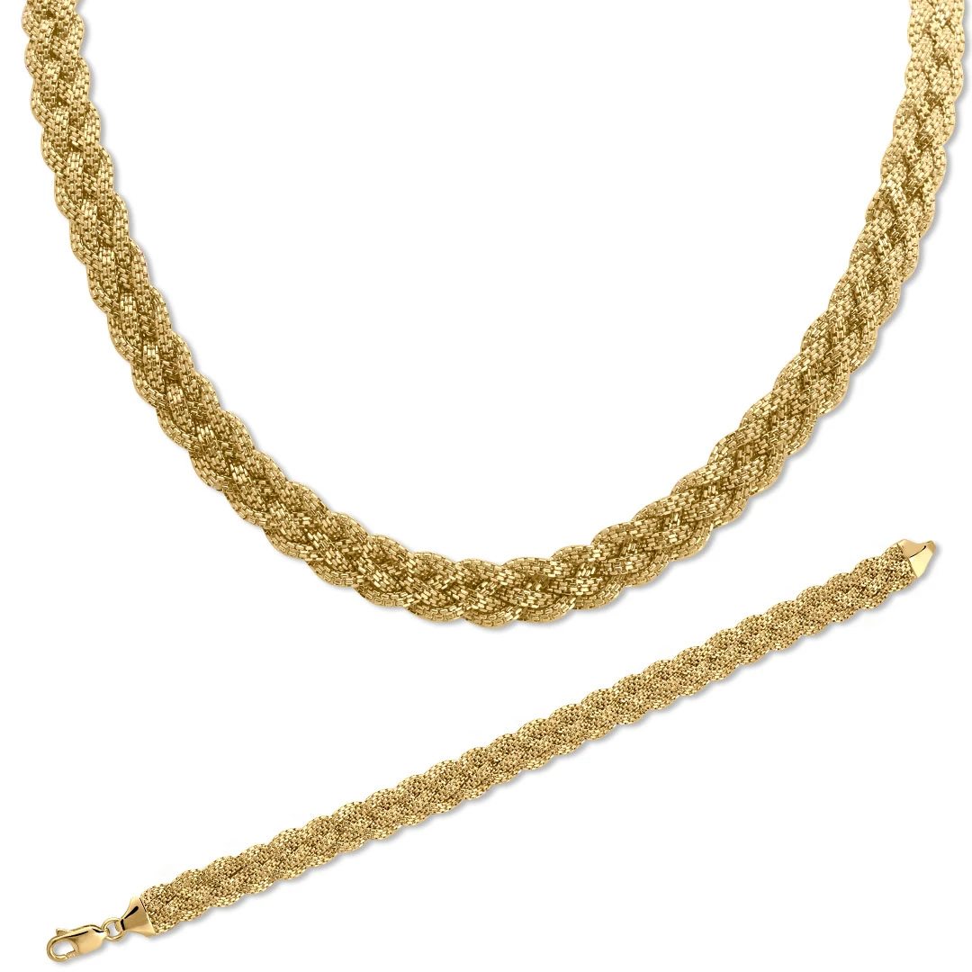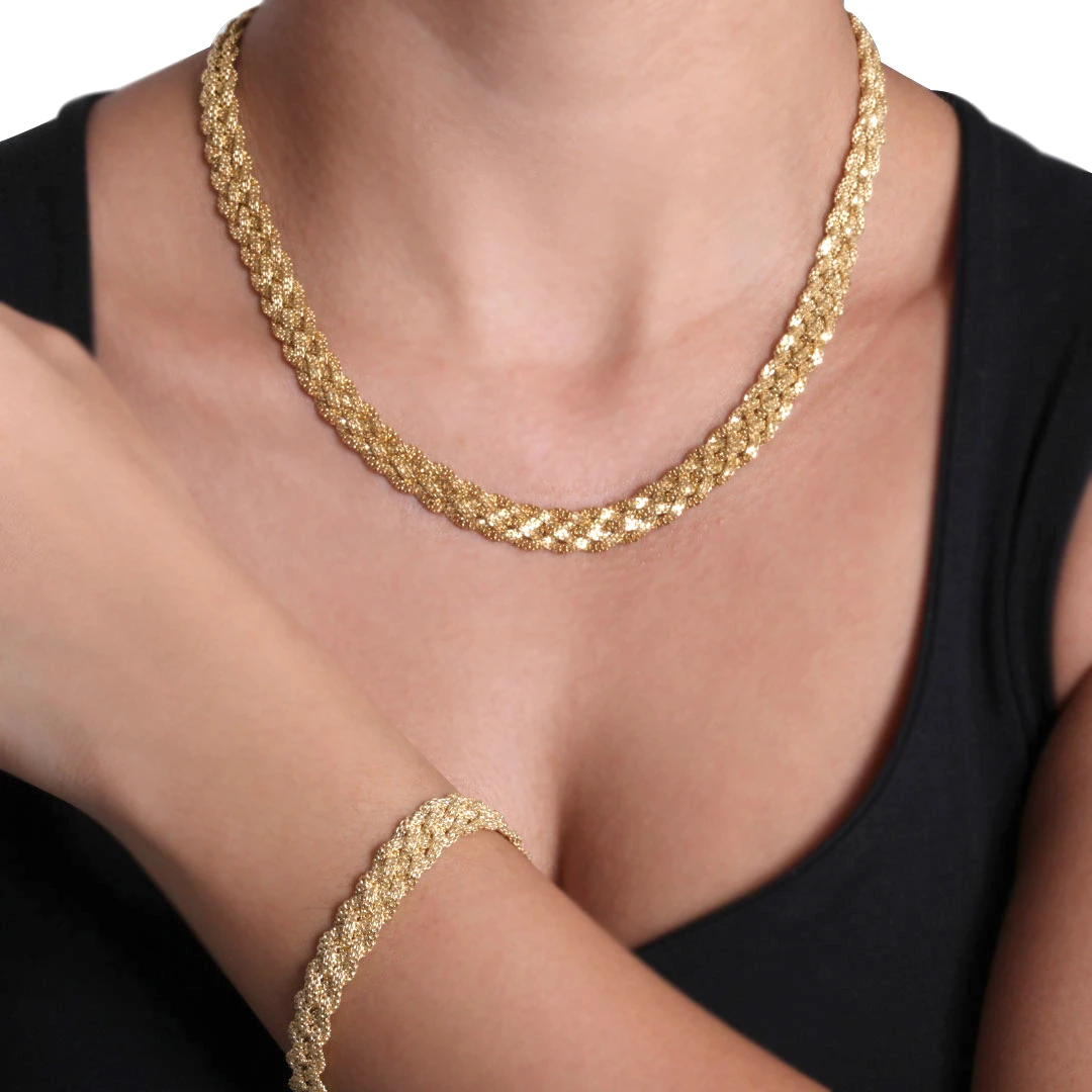 Oldukça gösterişli ve hoş bir model 30.60 Gram ağırlığında 50 cm boyunda örgü zincir modeliyle şık, havalı duruşa sahip tüm giyim kombinlerinizle uyum sağlayacak altın 14 ayar gerdanlık bileklik takım. Günlük kullanımda severek tercih edeceğiniz harika bir tasarım.