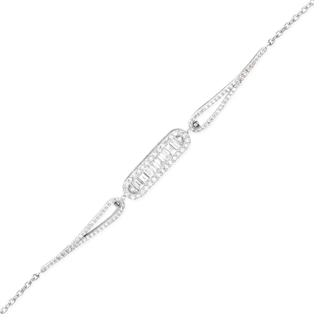 Yuvarlak kesim taşların arasında detaylandırılan baget taşlar ile spor tasarımlı, günlük kullanıma uygun ışıl ışıl modern bir tasarıma sahip 14 ayar beyaz altın pırlantalı spor bileklik. Farklı ve sade modelleri seven kadınların tercihi..