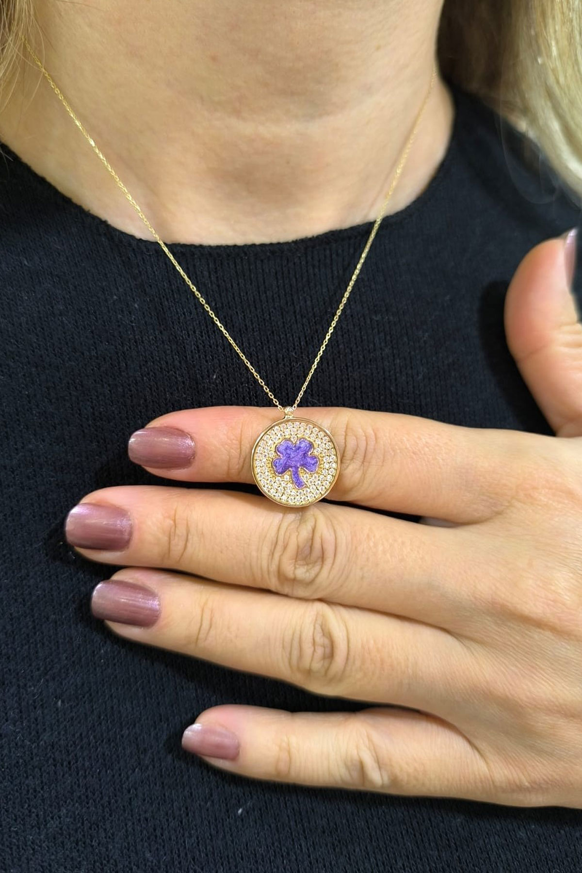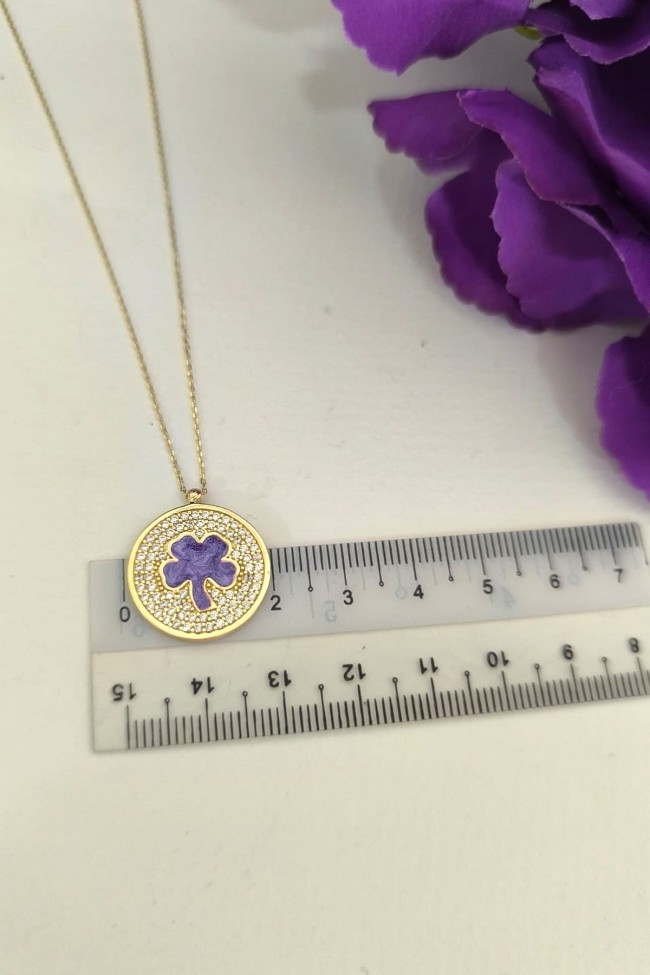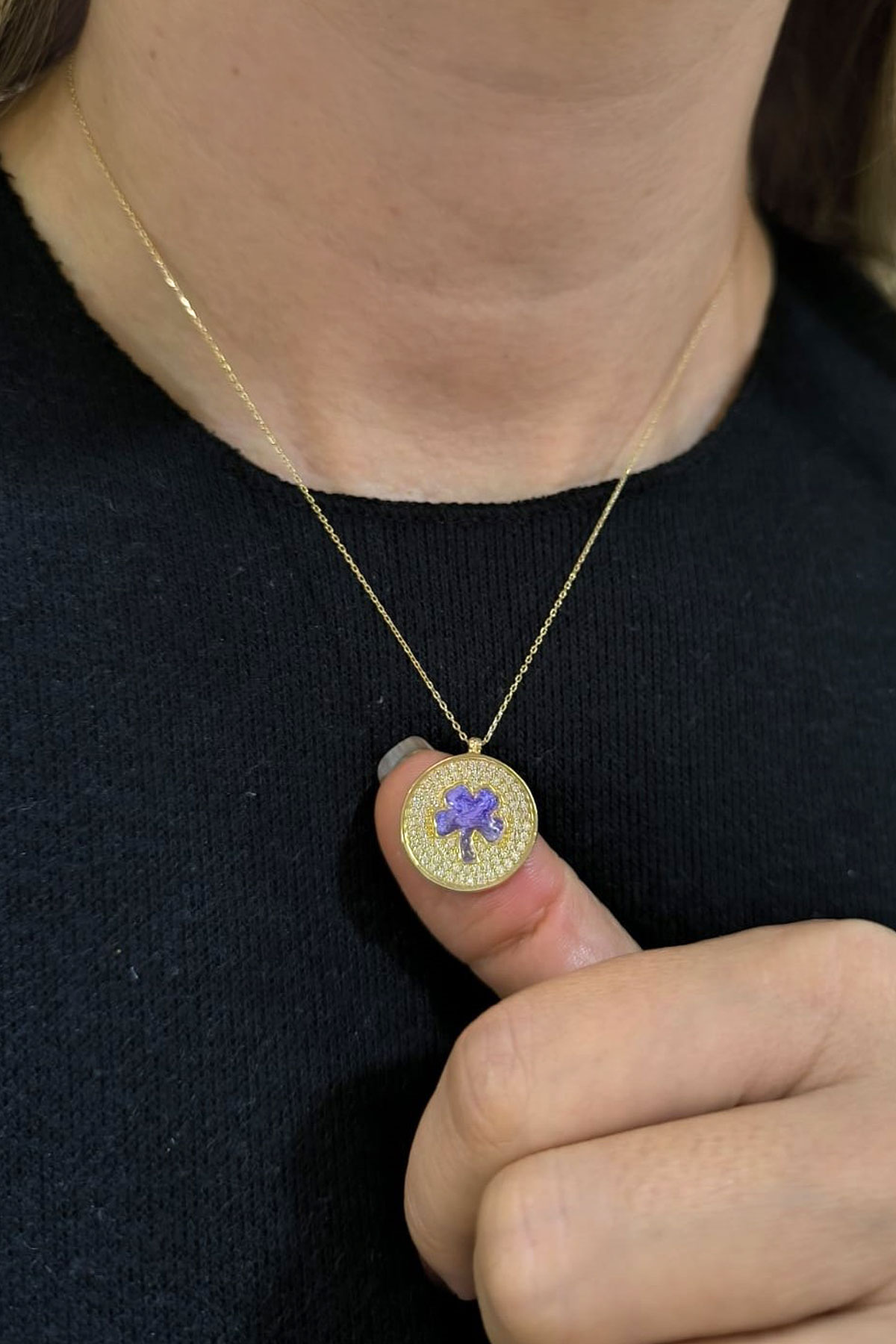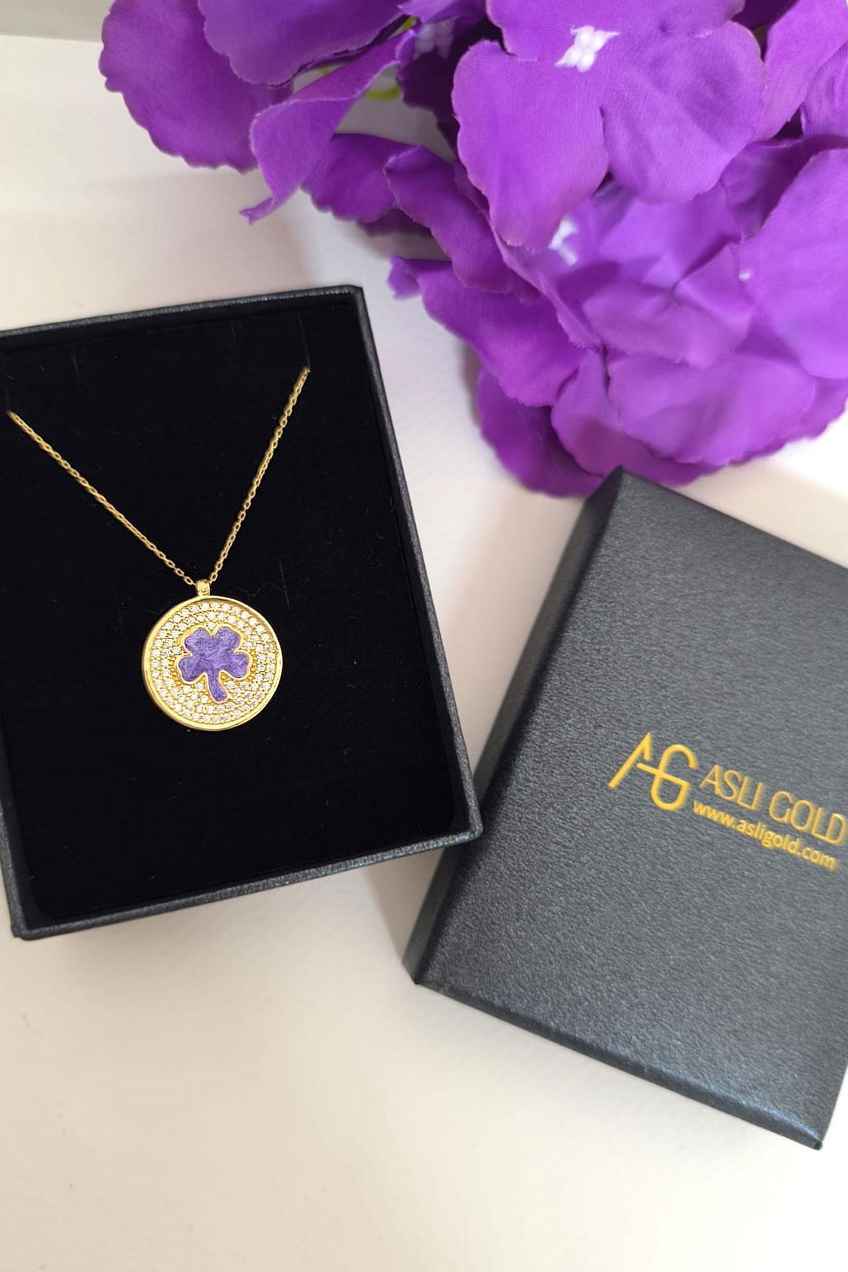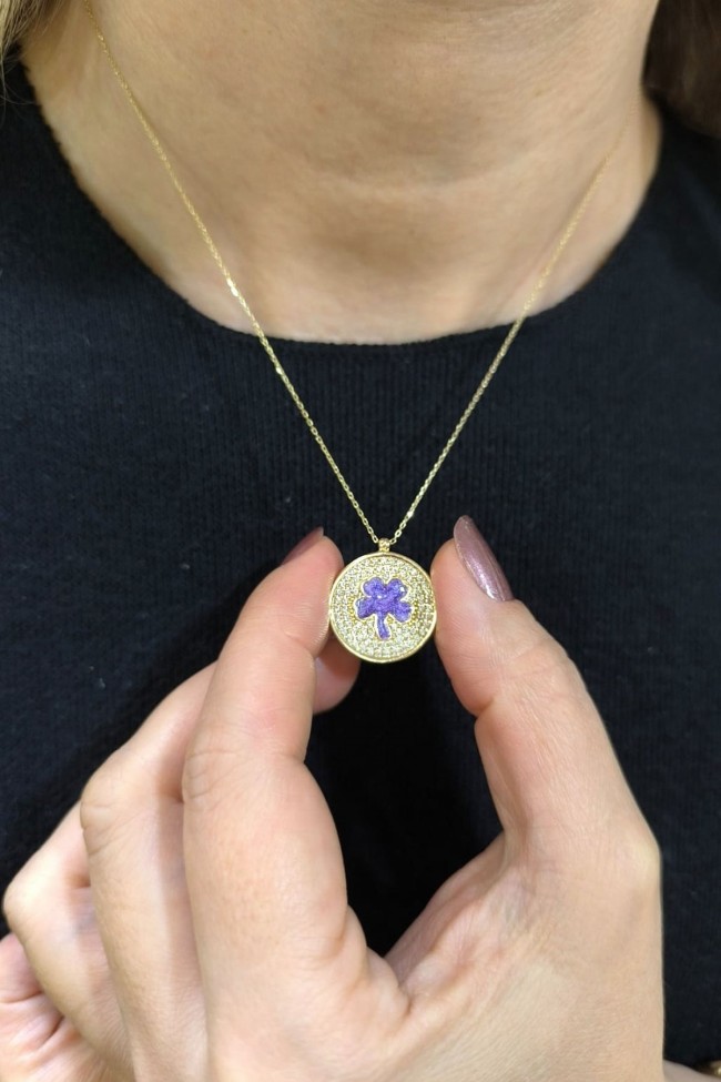 45 Cm Zincirli 14 Ayar Ortası Mor Mine Detaylı Işıl Işıl  Zirkon Taşlı 3.80 Gr. Ağırlığında Altın Yonca Kolye.