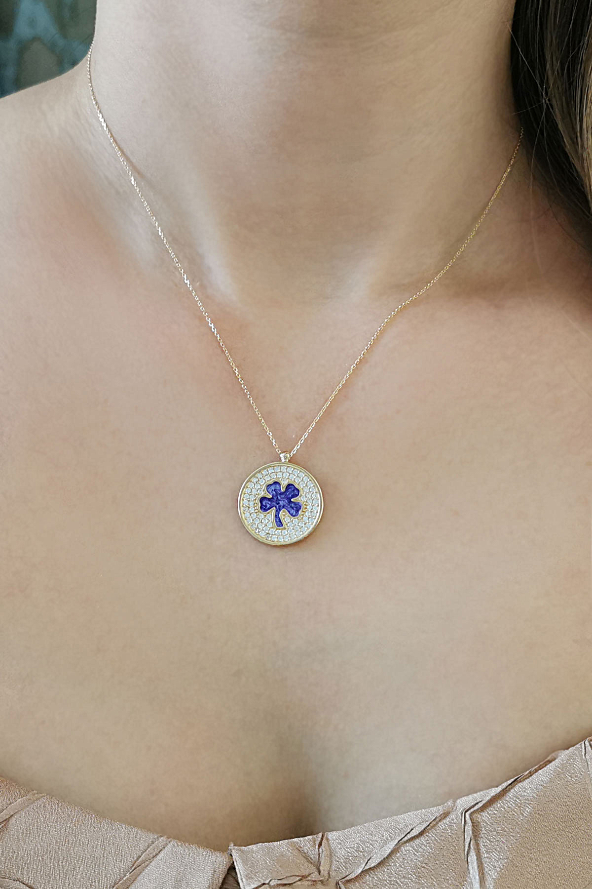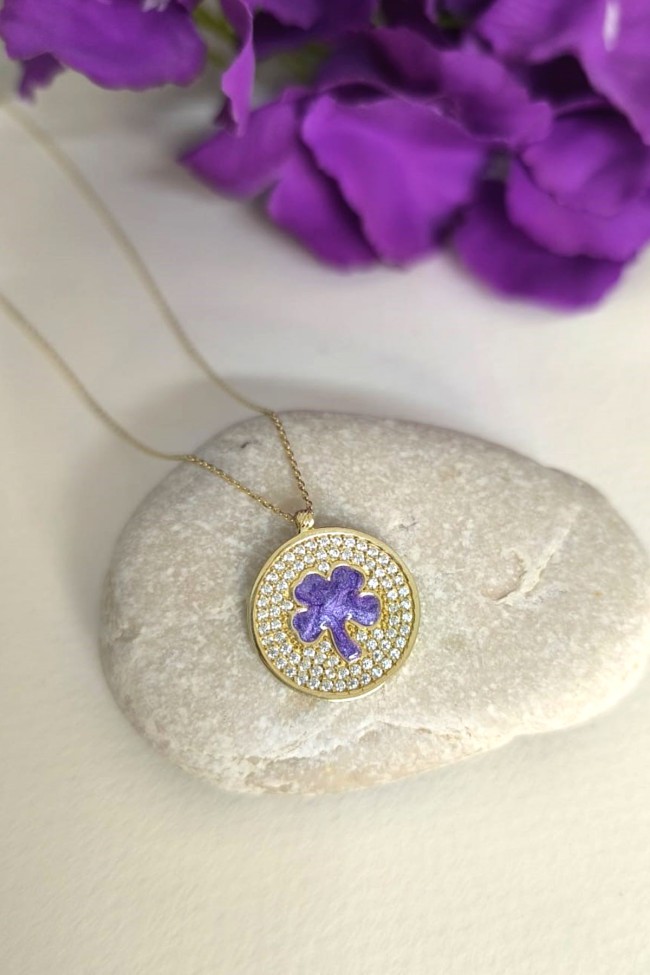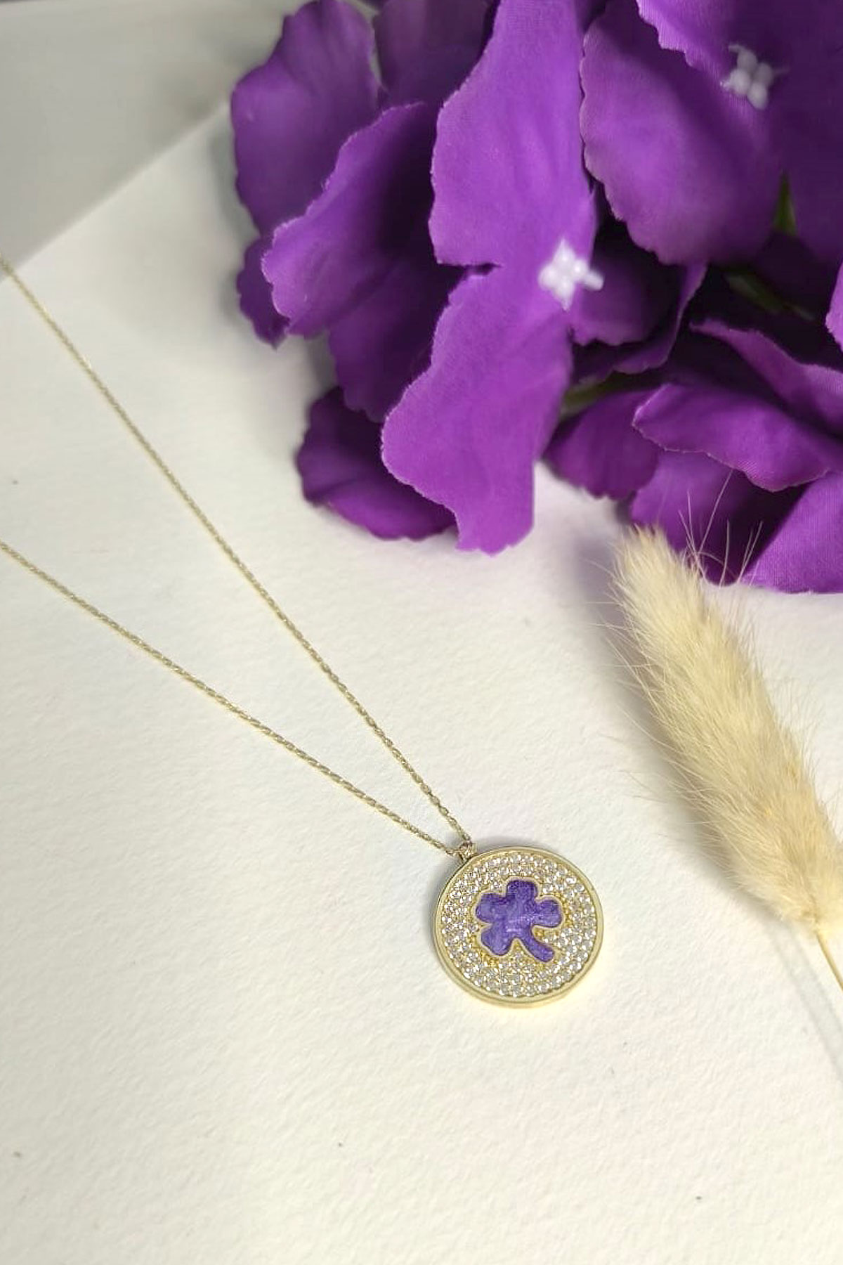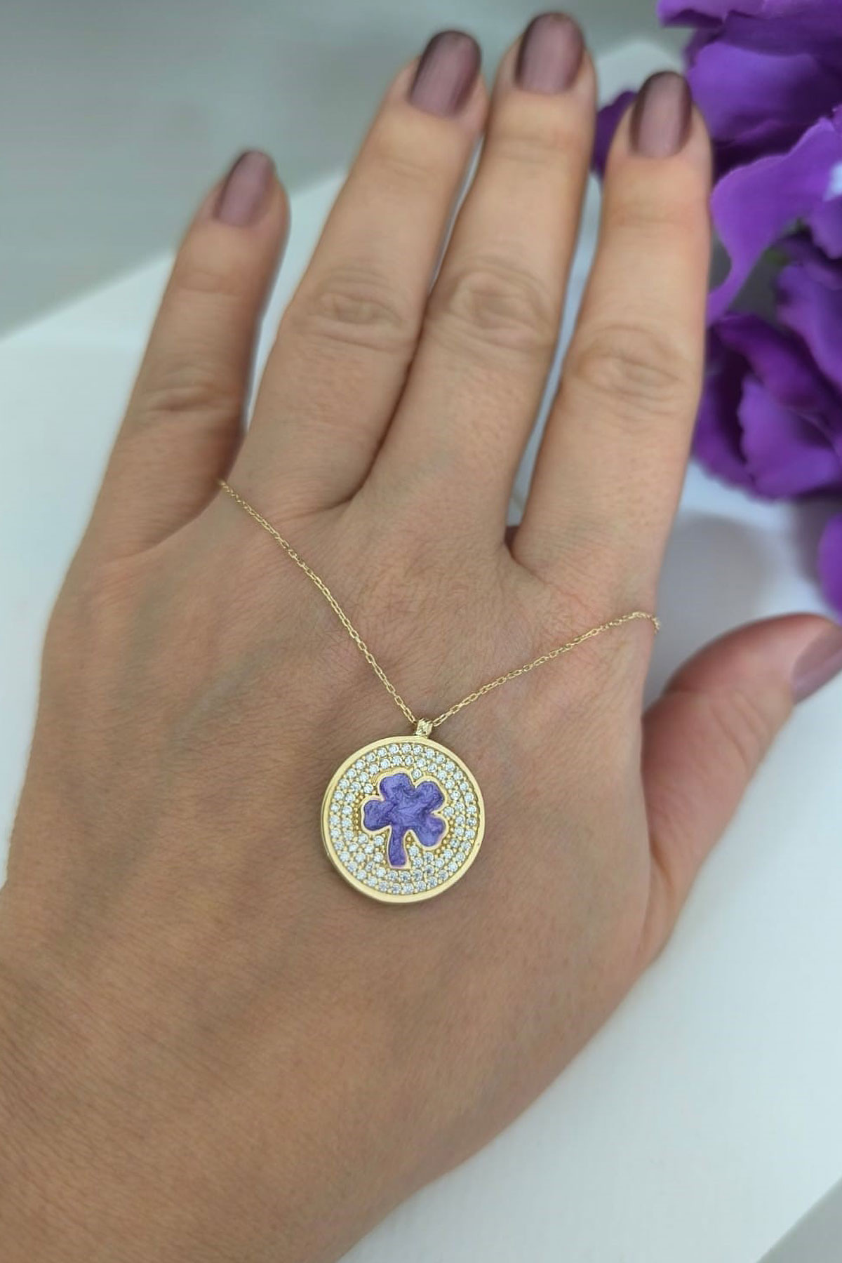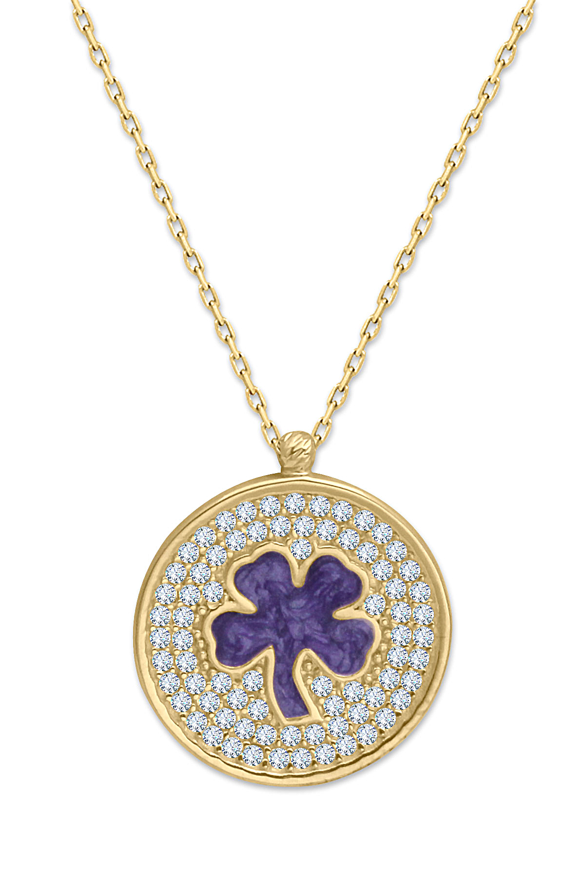 45 Cm Zincirli 14 Ayar Ortası Mor Mine Detaylı Işıl Işıl  Zirkon Taşlı 3.80 Gr. Ağırlığında Altın Yonca Kolye.