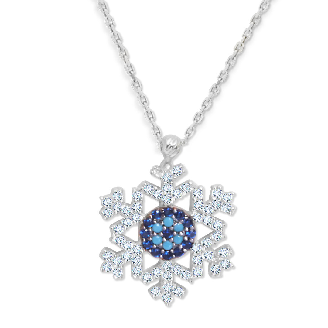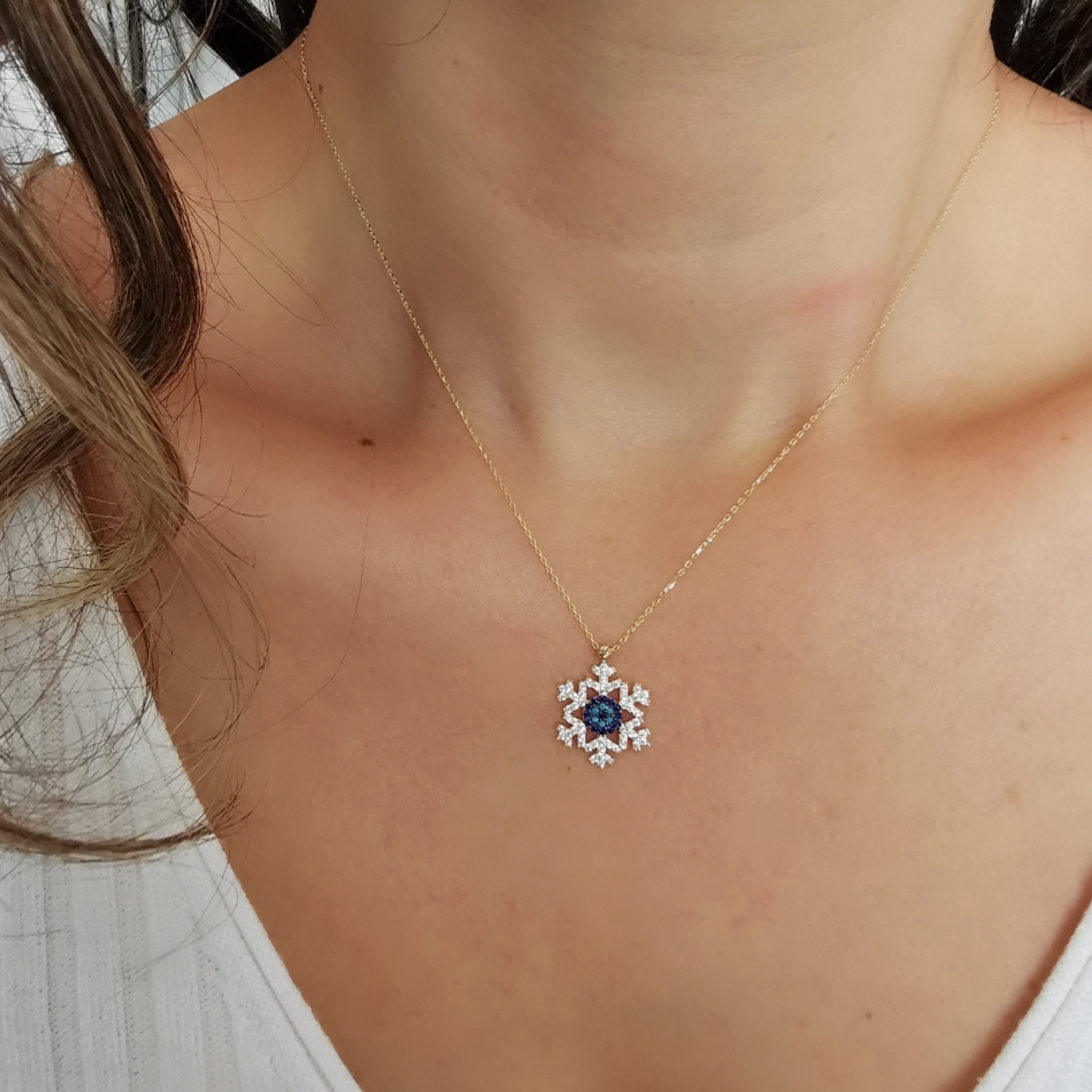 14 Ayar altın orta kısmı mavi taş detayları ile nazar boncuğu temsili tasarımıyla yaz kış severek kullanacağınız, spor giyim tarzınıza muhteşem uyum sağlayacak kar tanesi kolye.