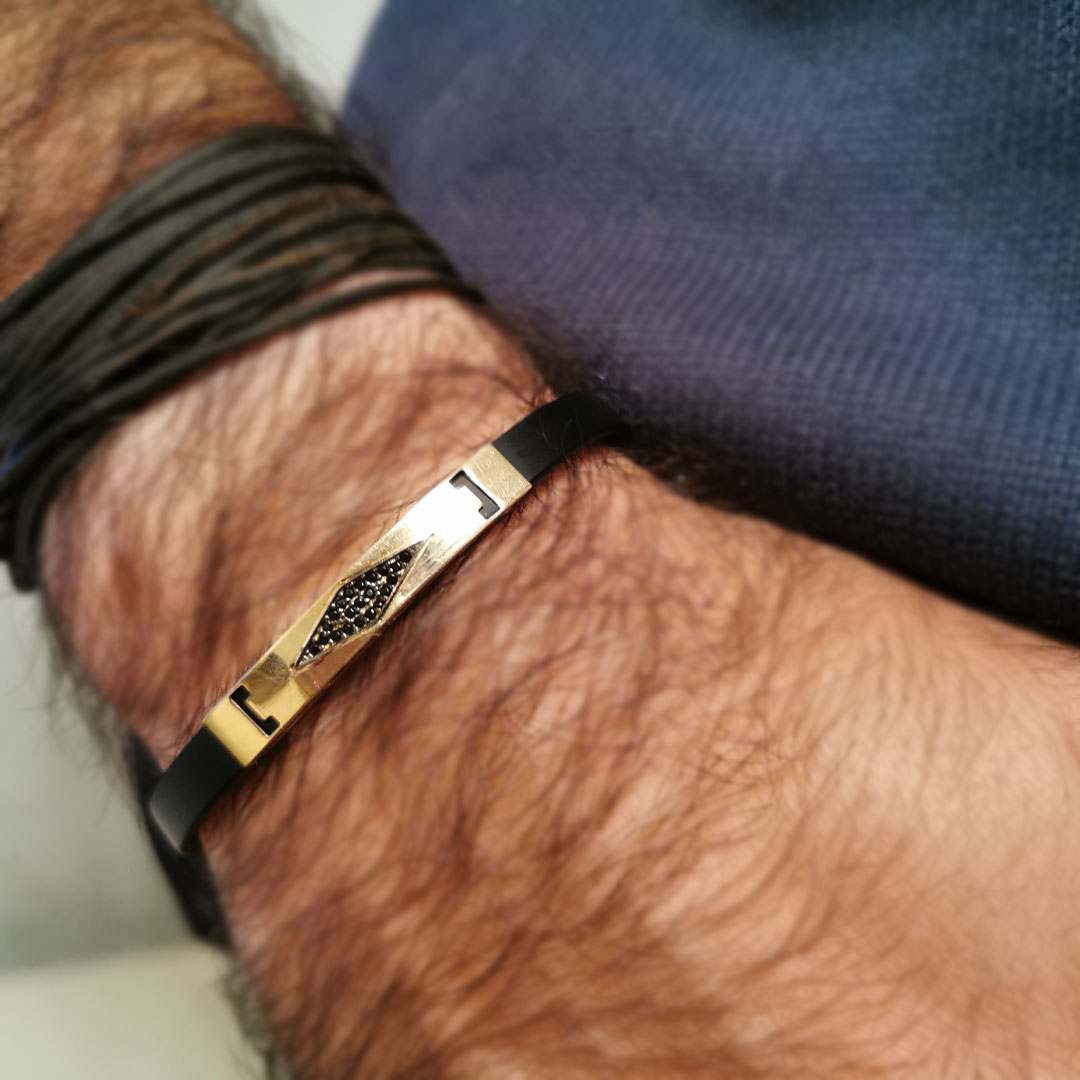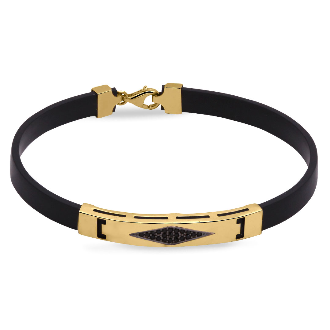 Kauçuk kombinasyonlu ortası siyah zirkon taş detaylı tasarımı ile günlük olarak da kullanabileceğiniz, özel günlerinde sevdiklerinize şık bir hediye seçeneği olacak 5.70 gr ağırlığında 14 ayar altın erkek bileklik.