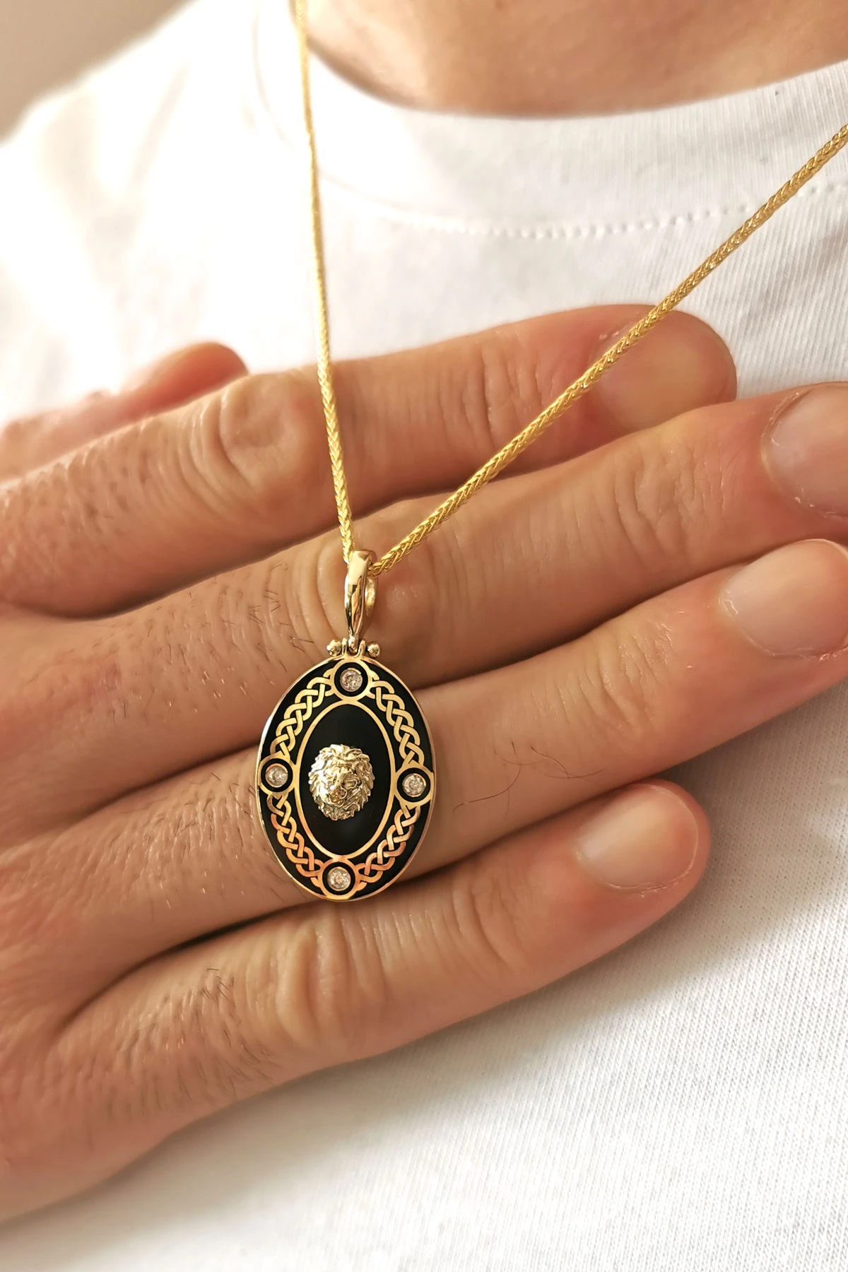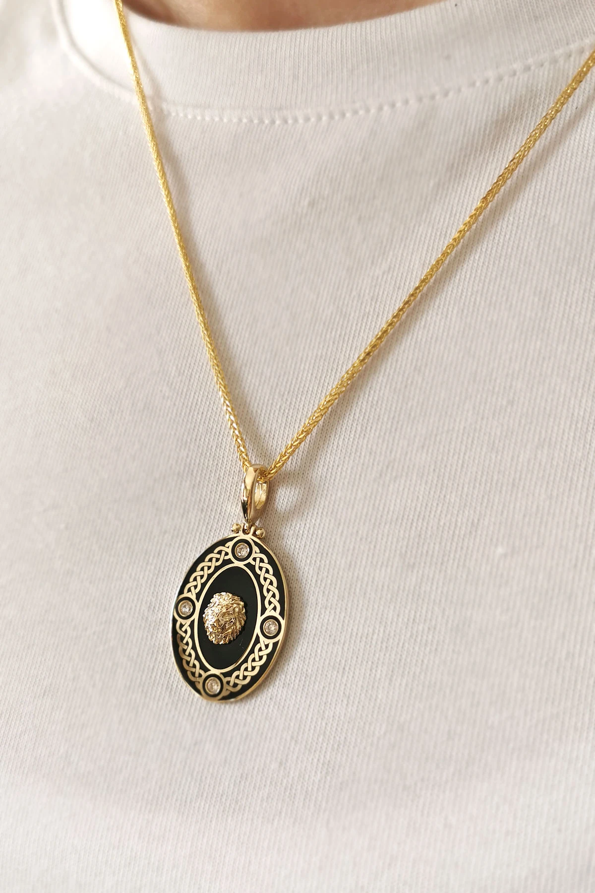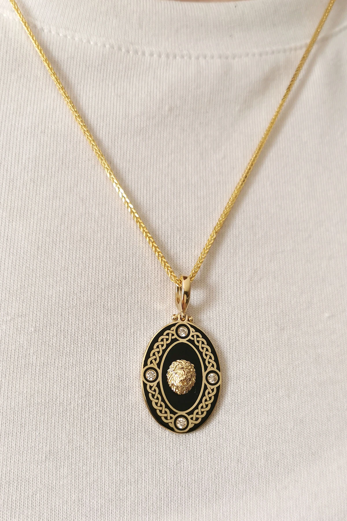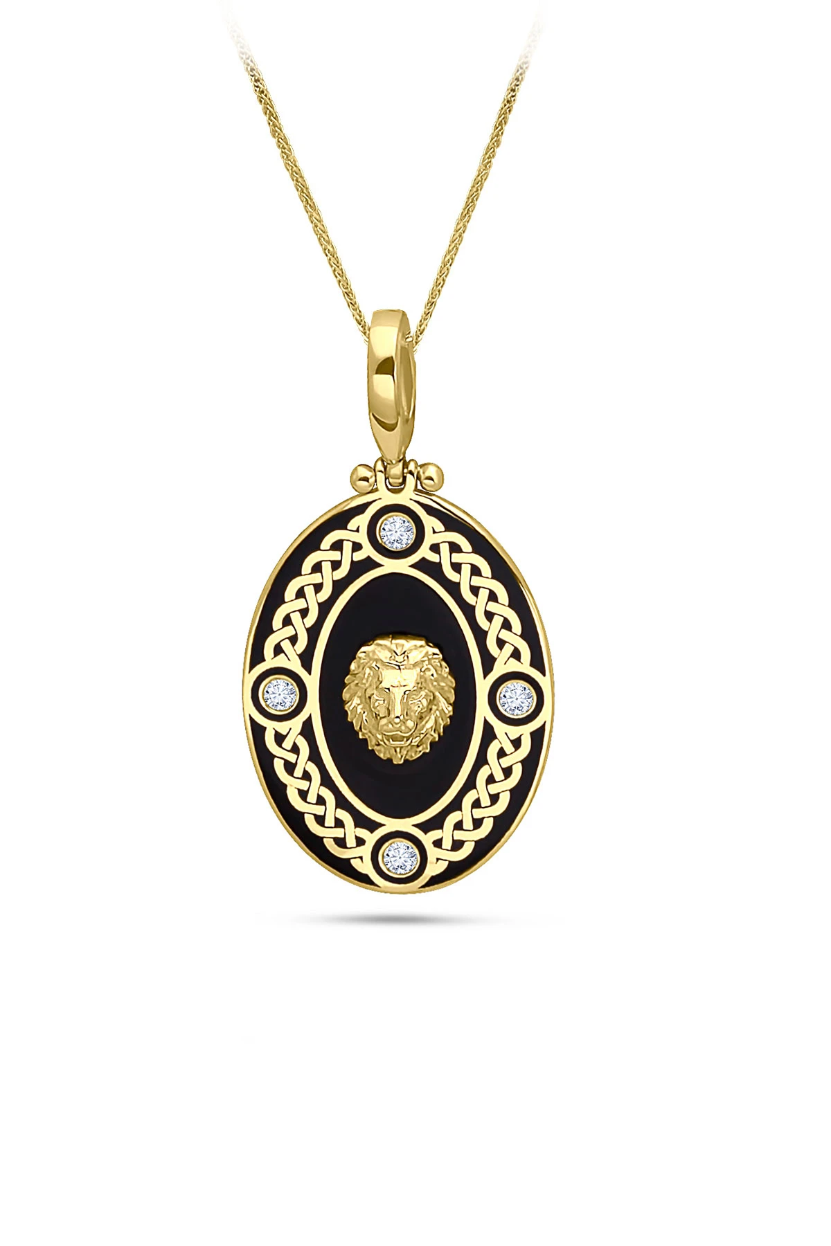 6.50 gr. 3.5 cm boyutunda 50 cm spiga zincirli 14 ayar altın mineli oval aslan model örgü işleme detaylı erkek kolye .