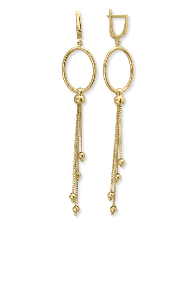 8.45 Gram Ağırlığında 11 Cm Spor Ve Modern Oval Çemberden Sallanan Püskül Detaylı Şık Bir Tarzı Olan Gösterişli 14 Ayar Altın Tasarım İtalyan Küpe.