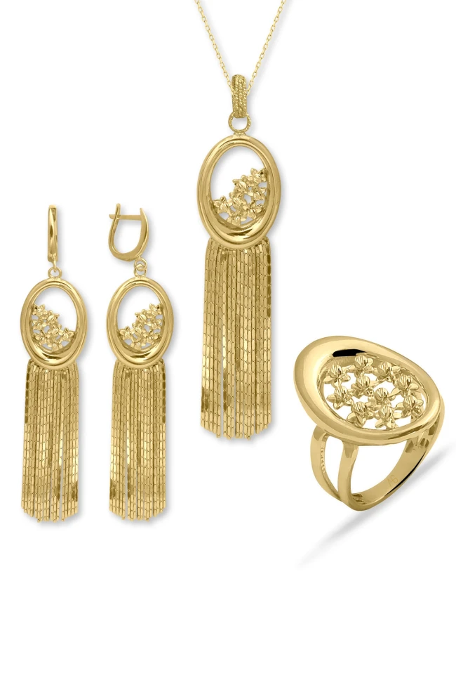 24.85 Gram Ağırlığında Oval Tasarım Dorika Top Detaylı Gösterişi İle Dikkatleri Üzerine Toplayan 14 Ayar Modern ve Şık Bir Havaya Sahip Kolye Ve Küpesi 7.5 Cm Boyunda Altın Püsküllü İtalyan Kolye, Küpe, Yüzük Takım.