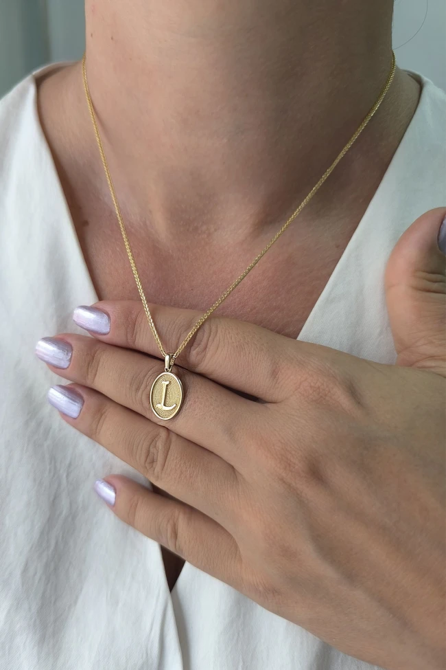 14 Ayar Altın Oval Spor Model L Harfi Tasarım Kolye Ucu.