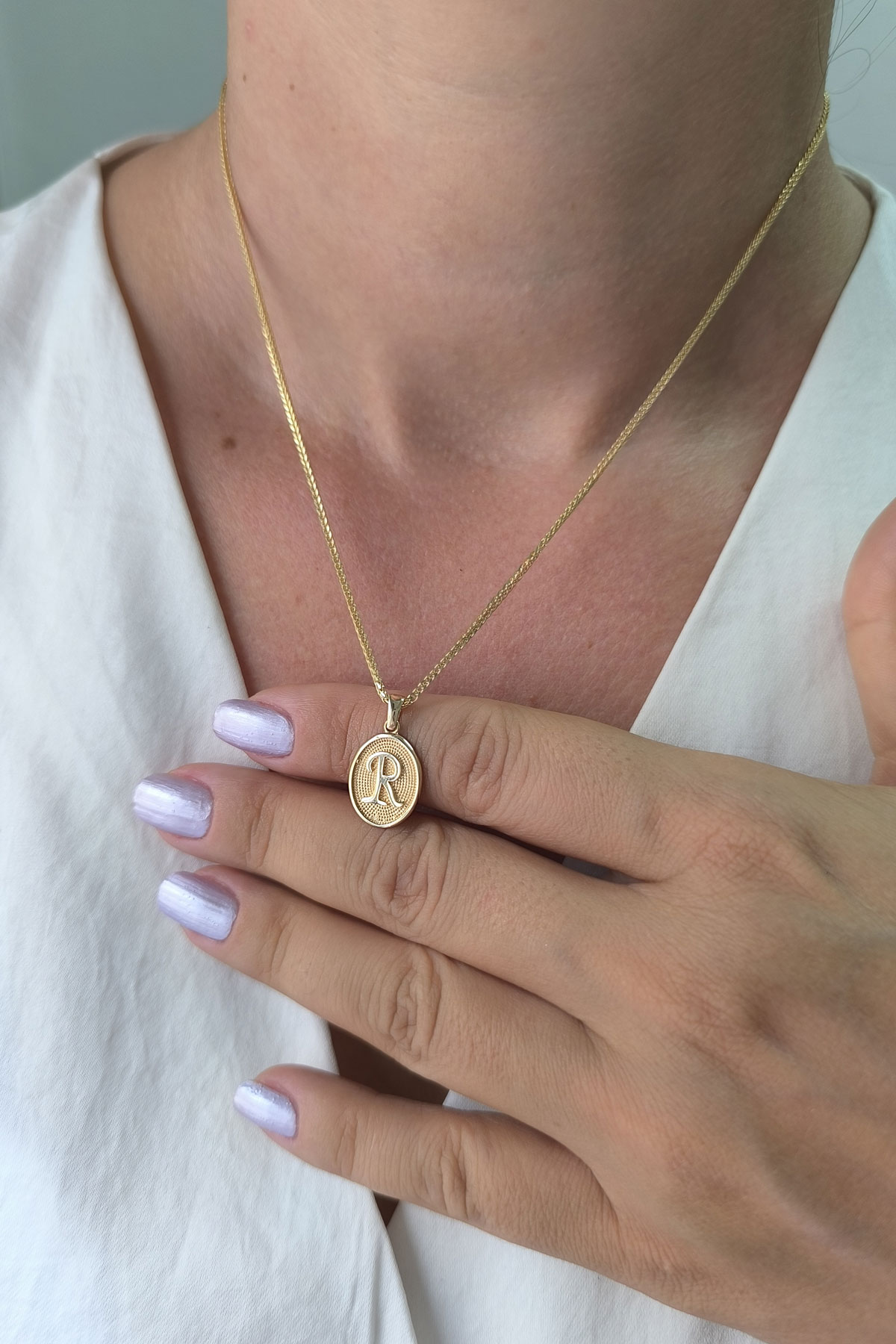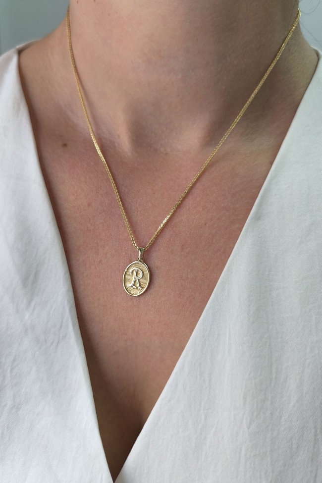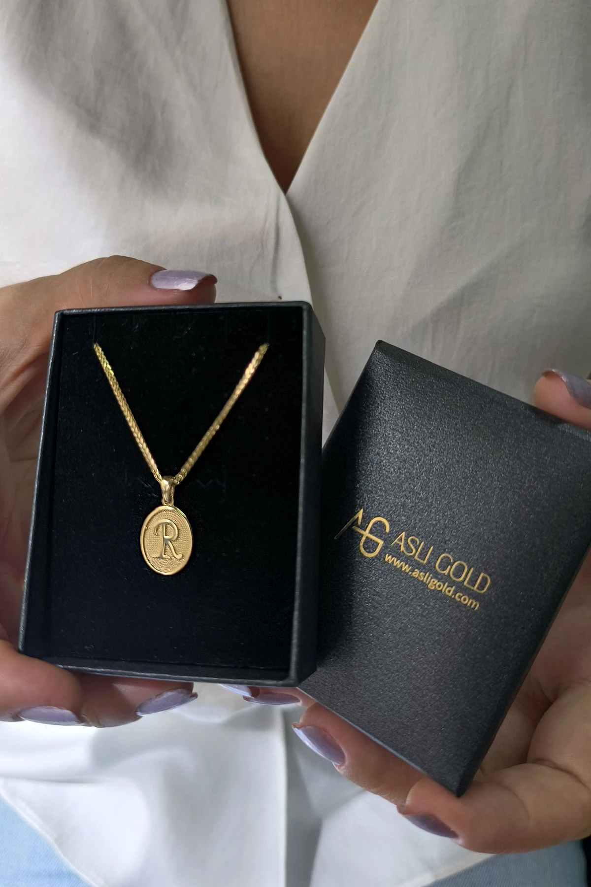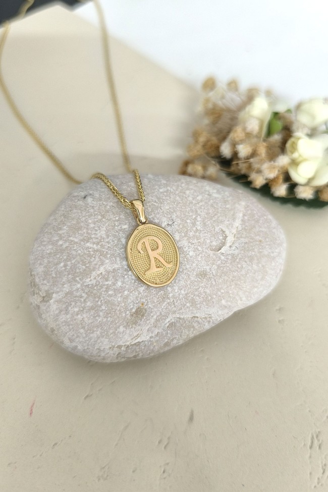 14 Ayar Altın Oval Spor Model R Harfi Tasarım Kolye.