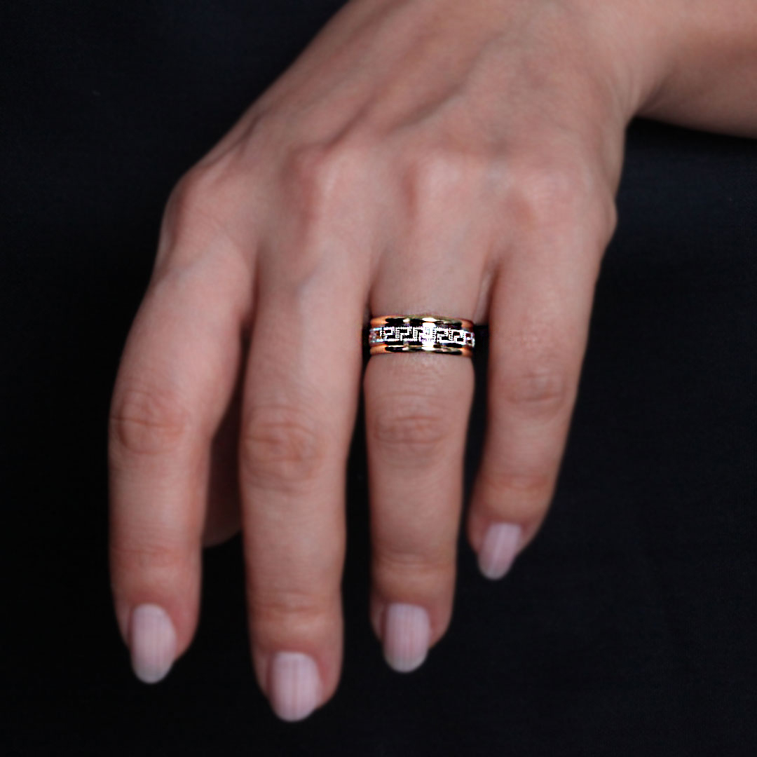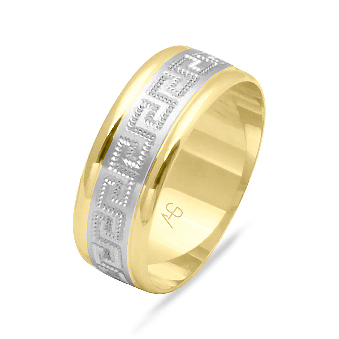 14 Ayar sarı-beyaz altın ortası pana desenli modeliyle şık duruşa sahip gösterişli model günlük kullanıma sahip 3.10 gram ağırlığında taşsız hem kadın hem erkek için uygun unisex tasarım alyans.