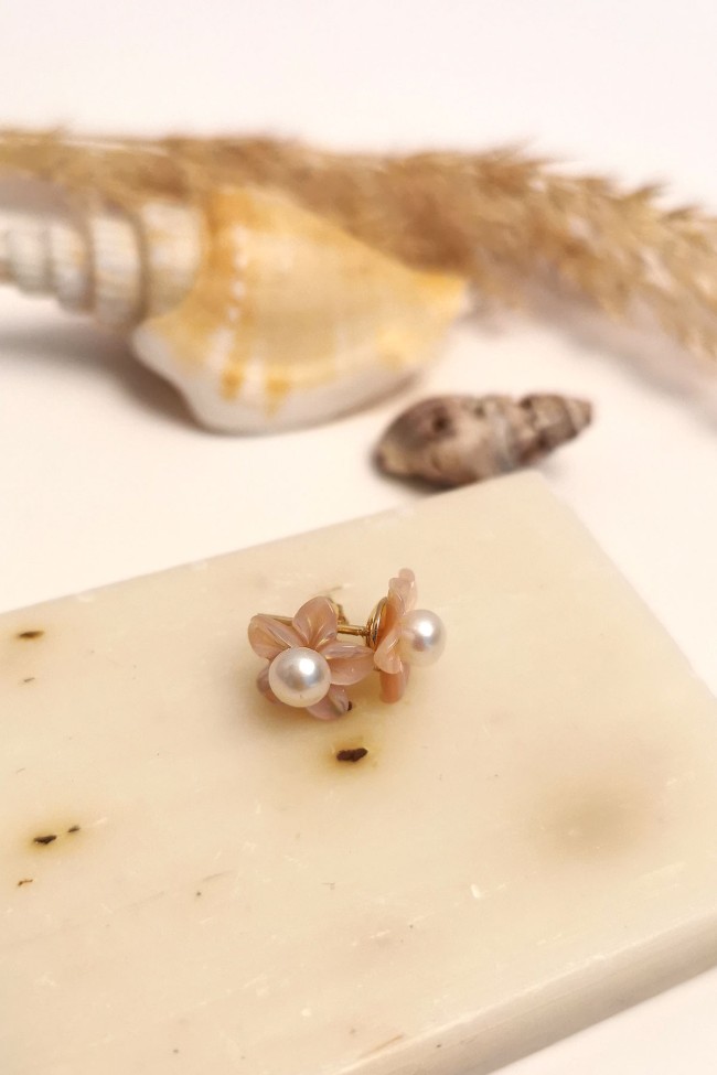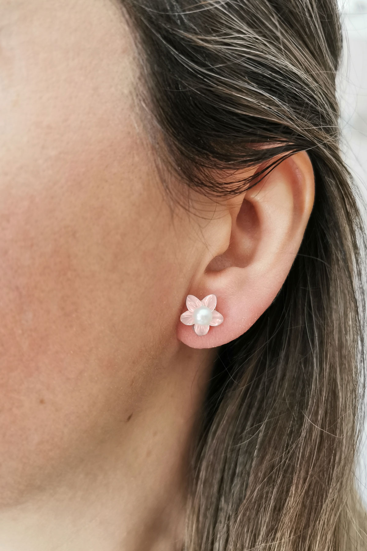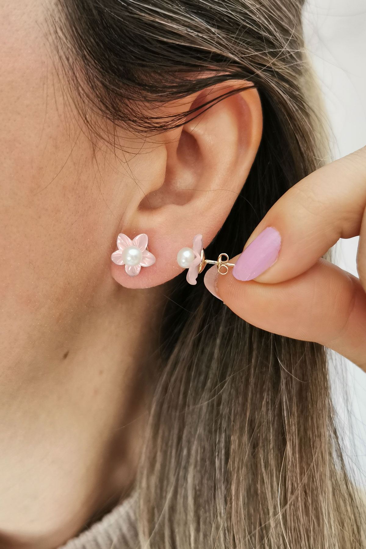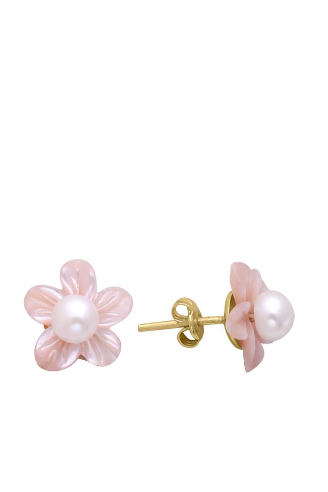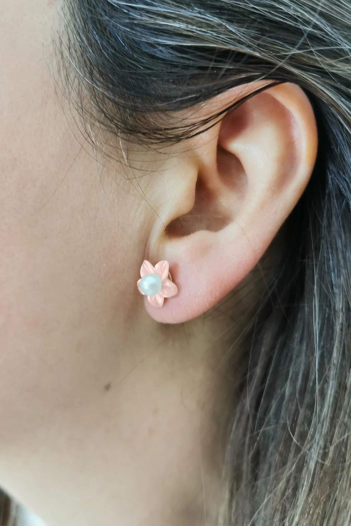 1.65 Gram Ağırlığında 1 Cm 14 Ayar Pembe Çiçekli İnci Altın Küpe.