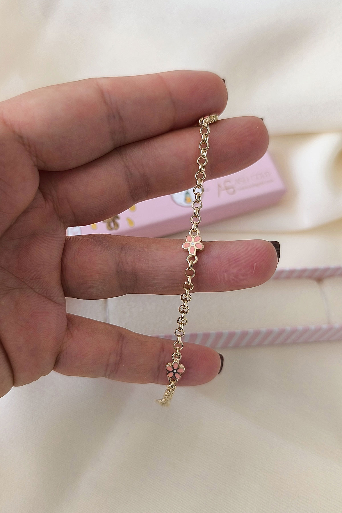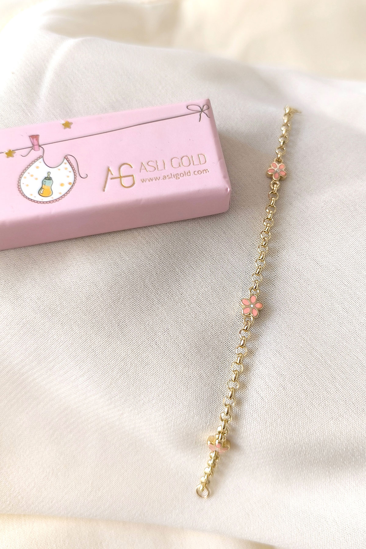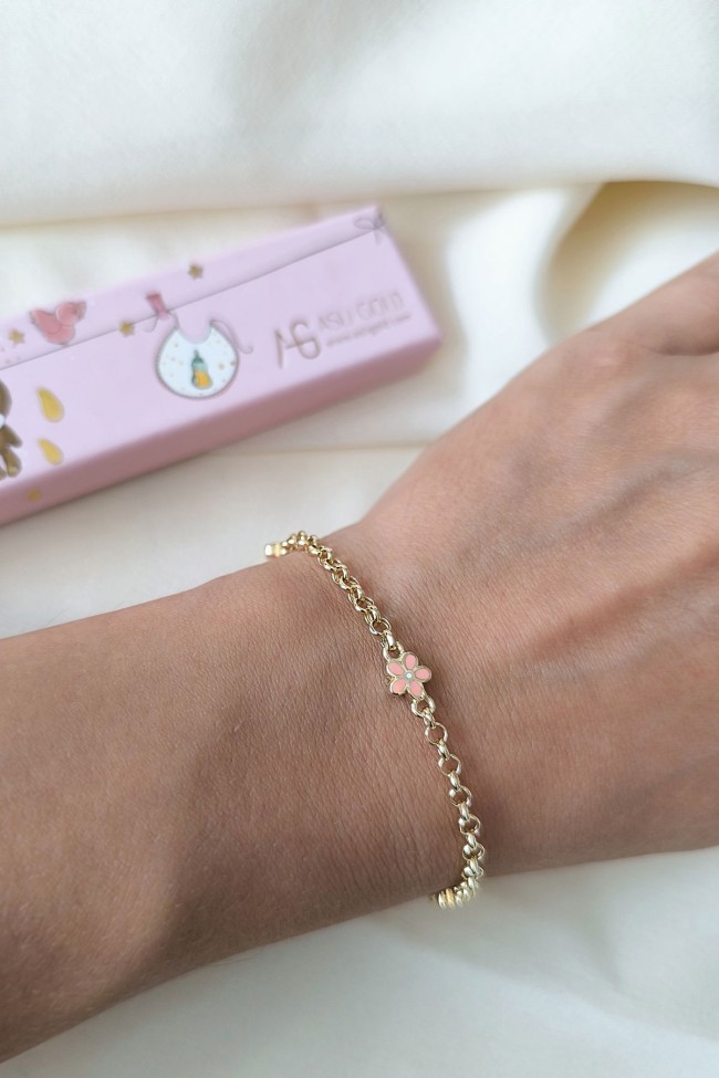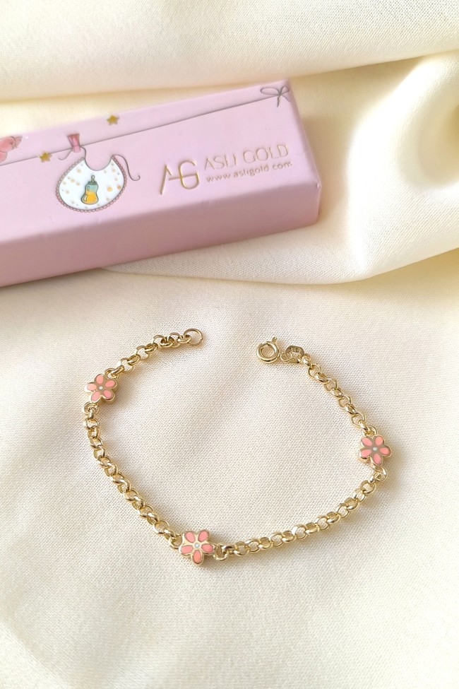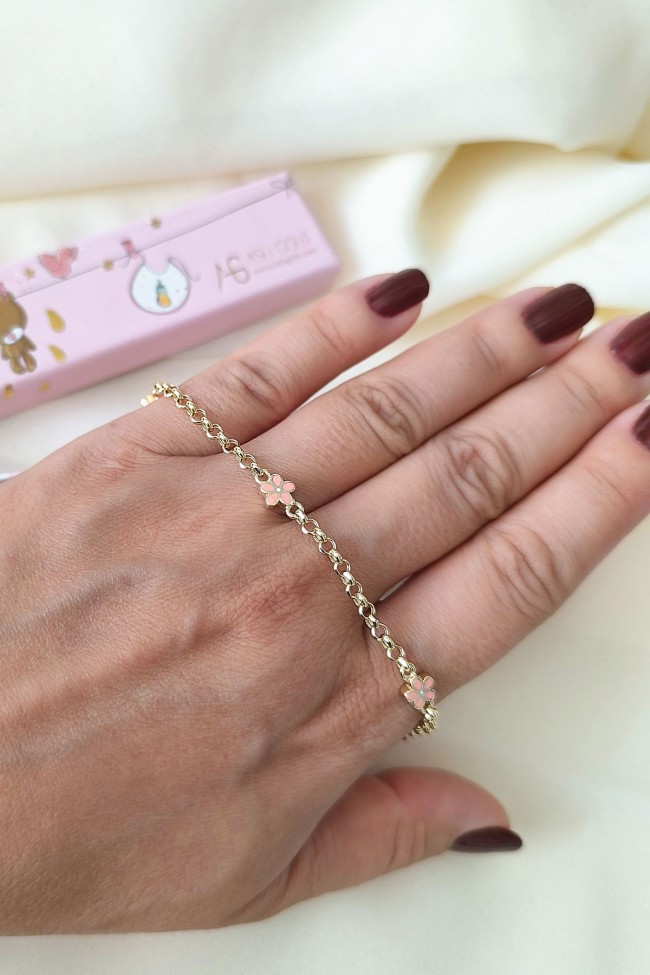 14.5 Cm boyunda günlük olarak da kullanıma uygun halka doc zincirli 14 ayar 2.70 gr ağırlığında altın pembe çiçek modelli kız çocuk bileklik.
