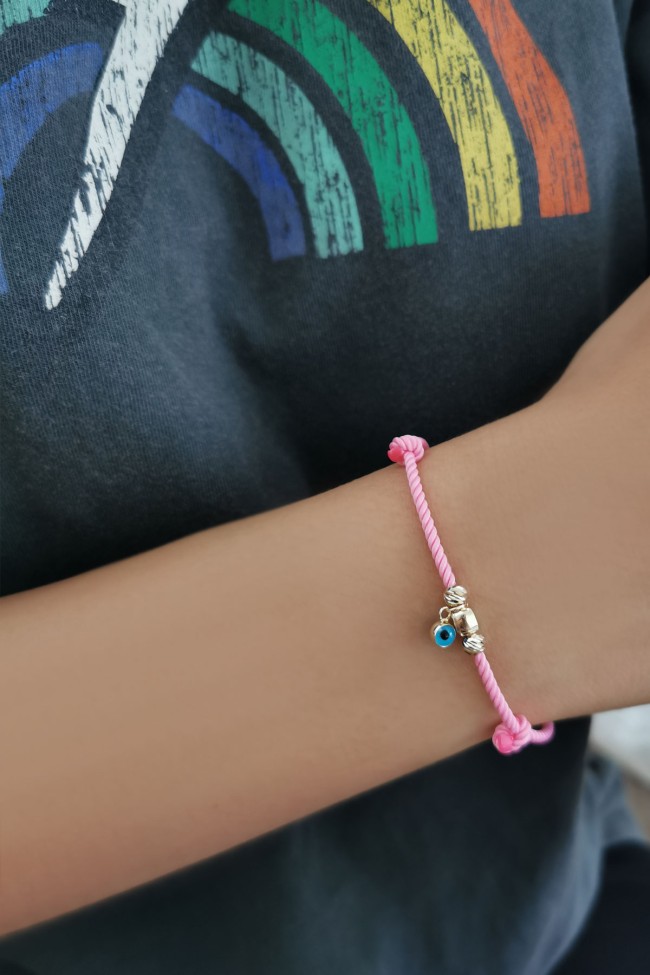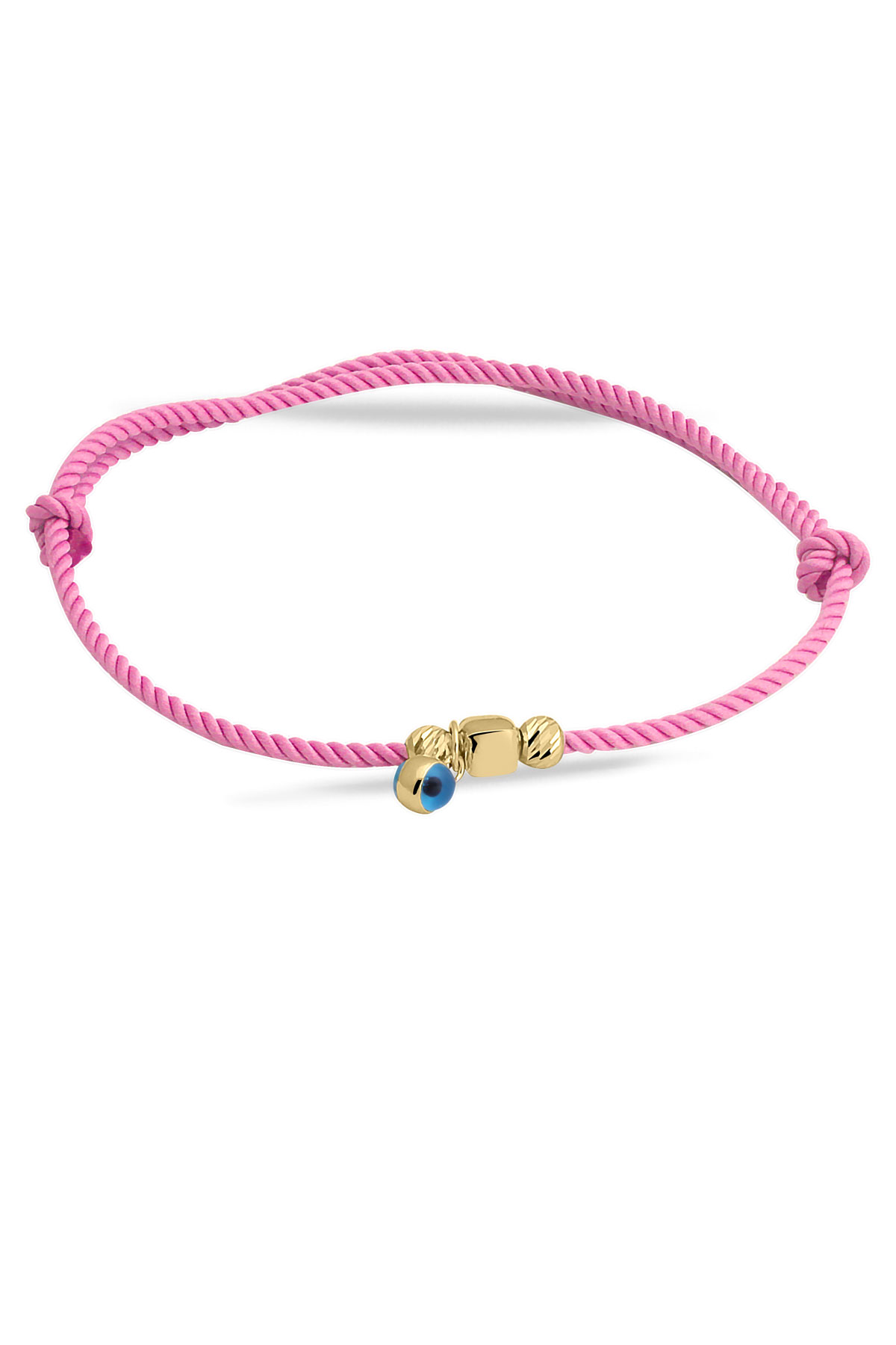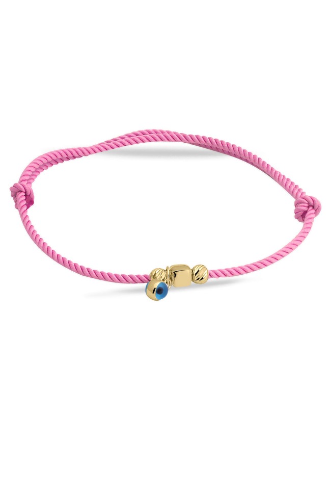 Pembe ipli tasarımı ile günlük olarak saatlerinizle yada tek olarak kullanabileceğiniz sevdiklerinize doğum günü hediyesi olarak da armağan edebileceğiniz 14 ayar 0.65 gr ağırlığında 14 ayar altın dorika ve küp detaylı nazar bileklik.