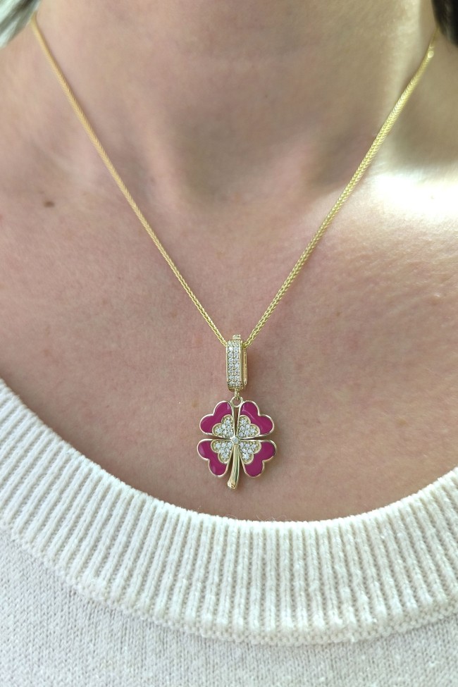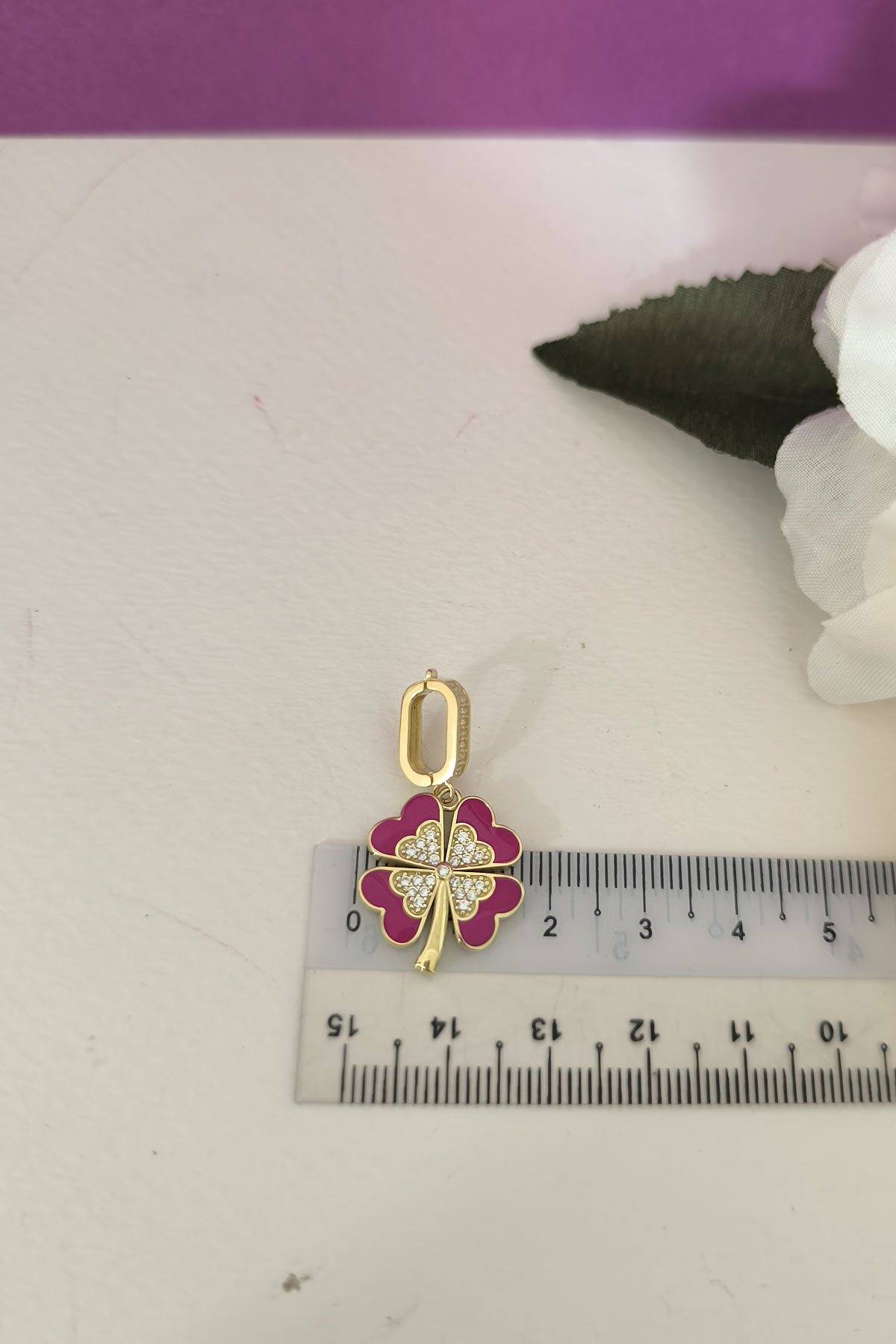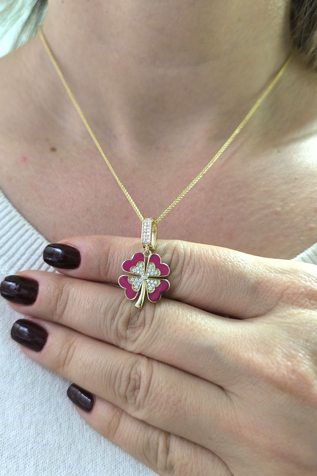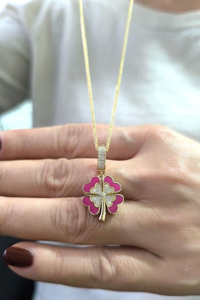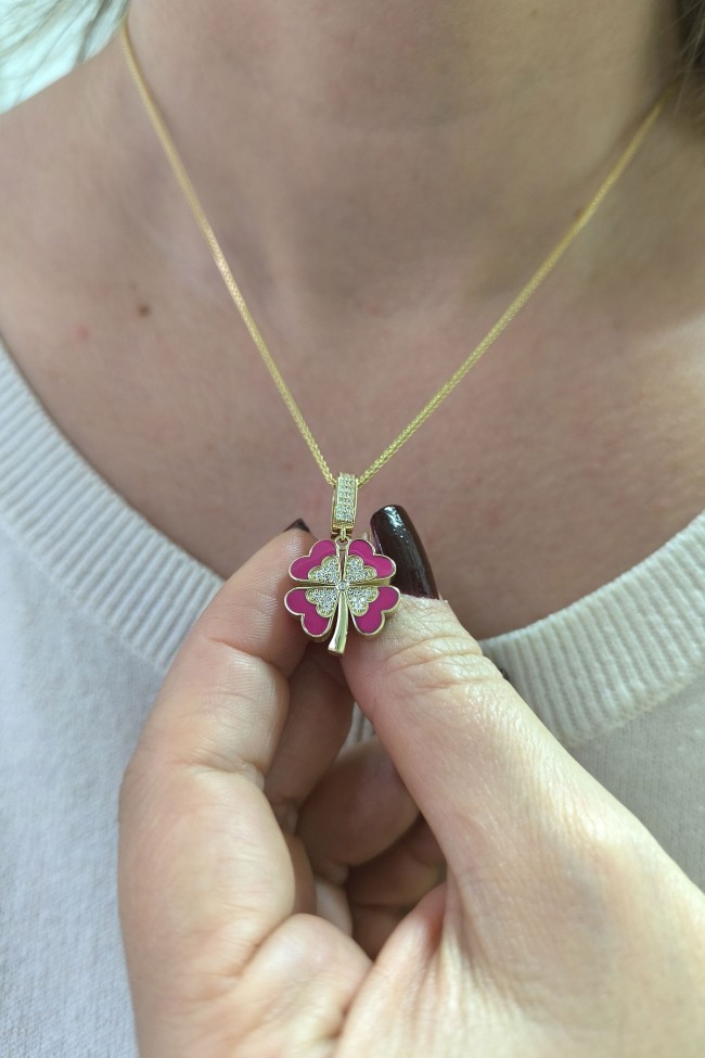 5.30 gr. 3 cm boyutunda zirkon taşlı model 14 ayar altın pembe mineli yonca model charm kilit kolye. Farklı kolyelerinizle bir arada kombine olarak kullanabileceğiniz harika ve gösterişli bir model.