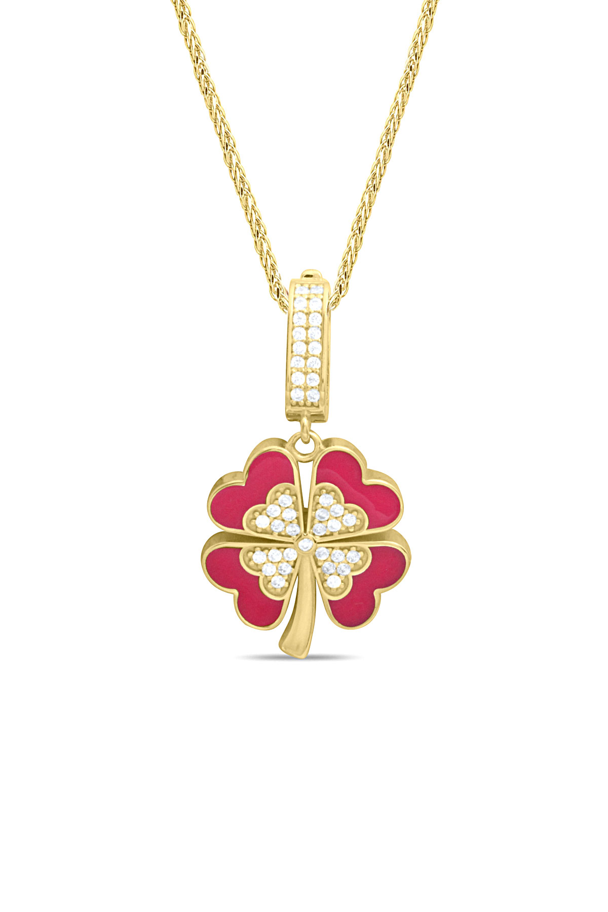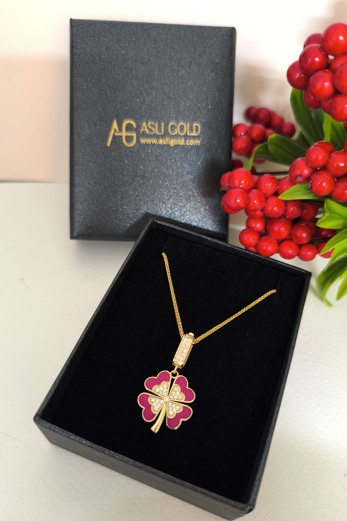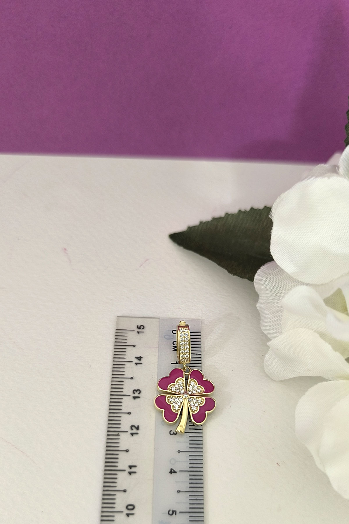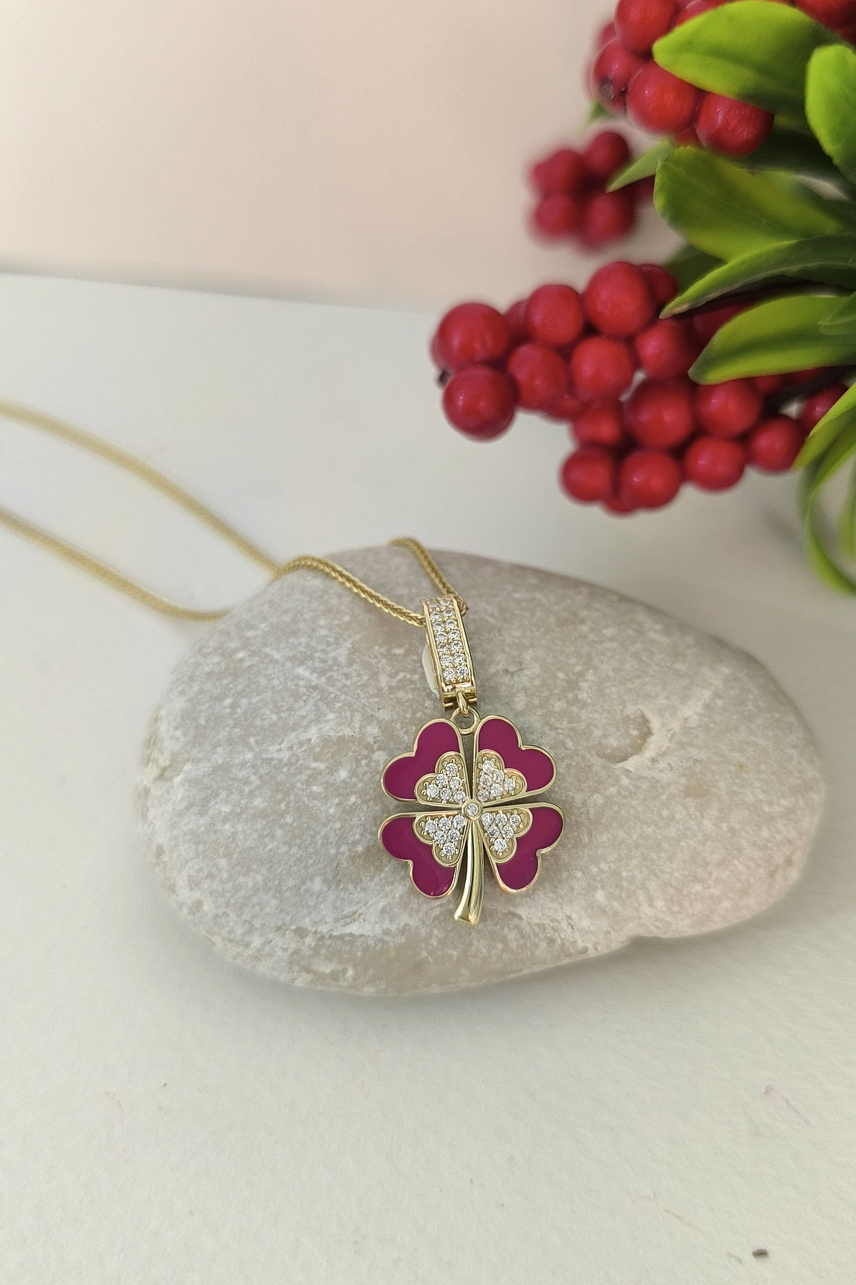 5.30 gr. 3 cm boyutunda zirkon taşlı model 14 ayar altın pembe mineli yonca model charm kilit kolye. Farklı kolyelerinizle bir arada kombine olarak kullanabileceğiniz harika ve gösterişli bir model.