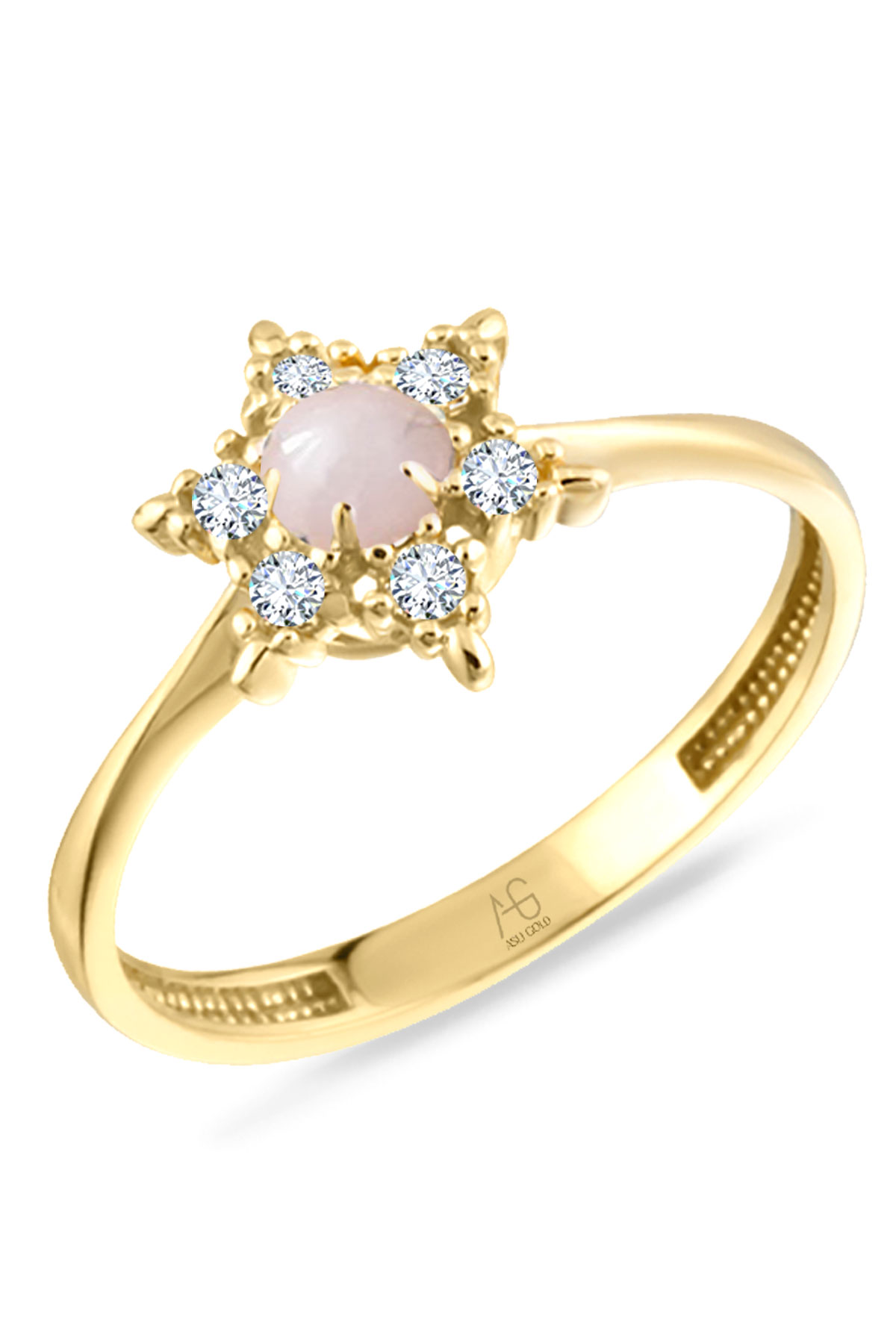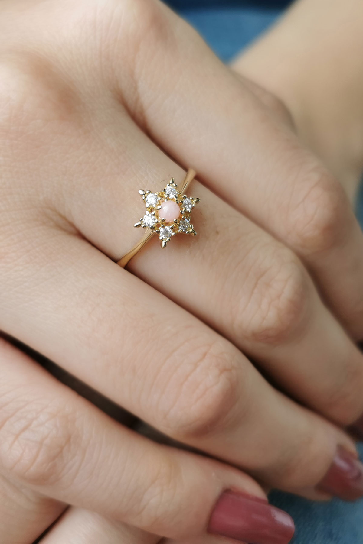 14 Ayar sarı altın pembe opal taşlı tasarım günlük kullanıma uygun 1.80 gram ağırlığında minimal yıldız yüzük.