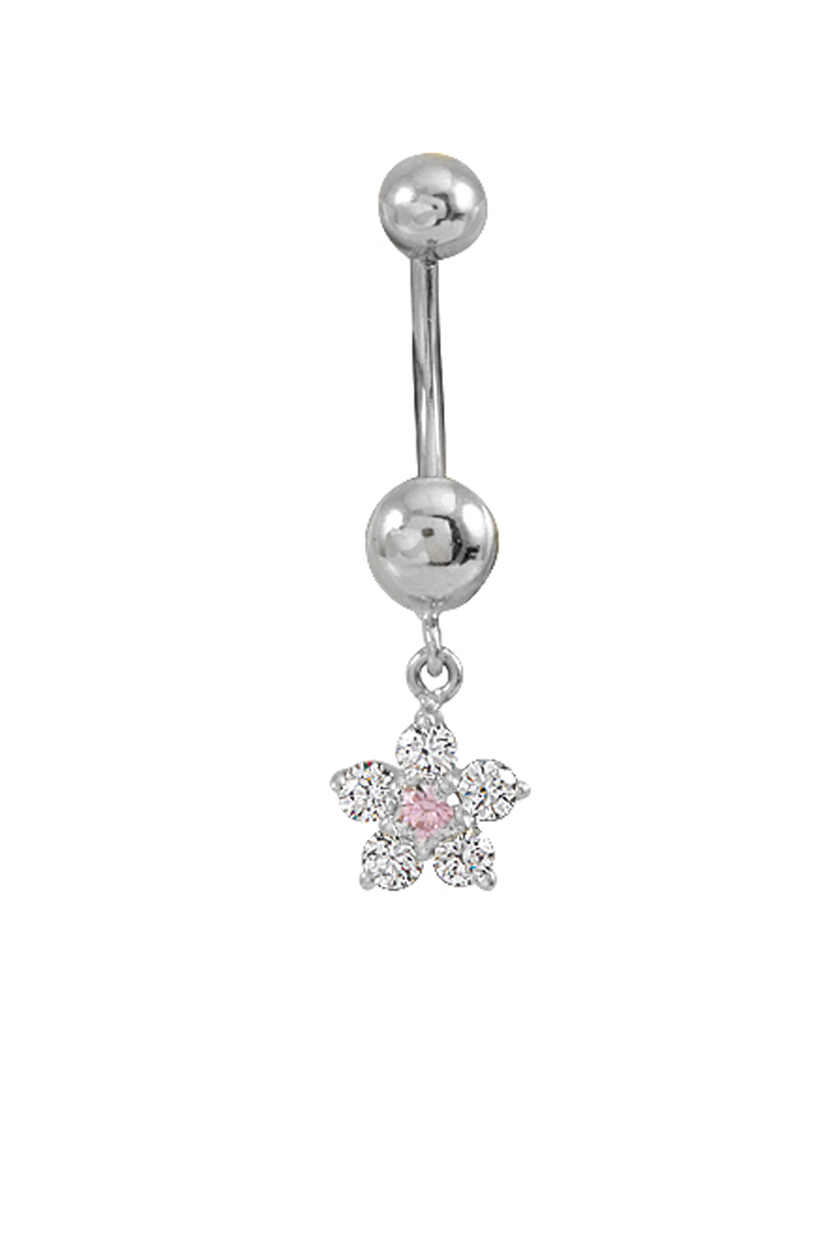 Mini Ortası Pembe Taşlı, Sallantılı Modeliyle Zarif Bir Duruşa Sahip 14 Ayar Altın Göbek Piercingi.