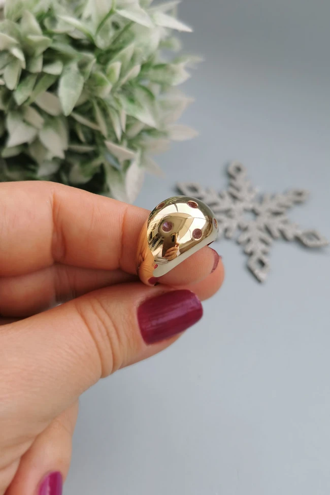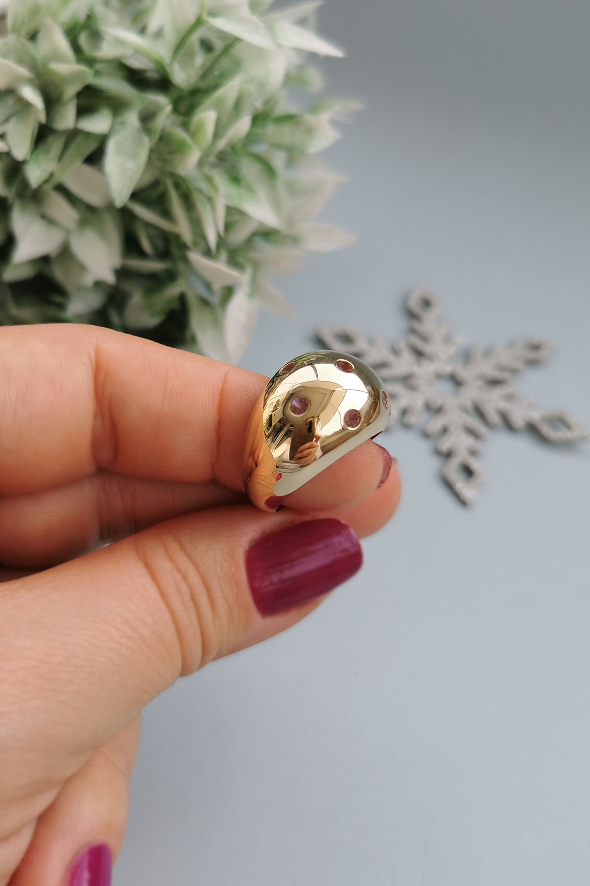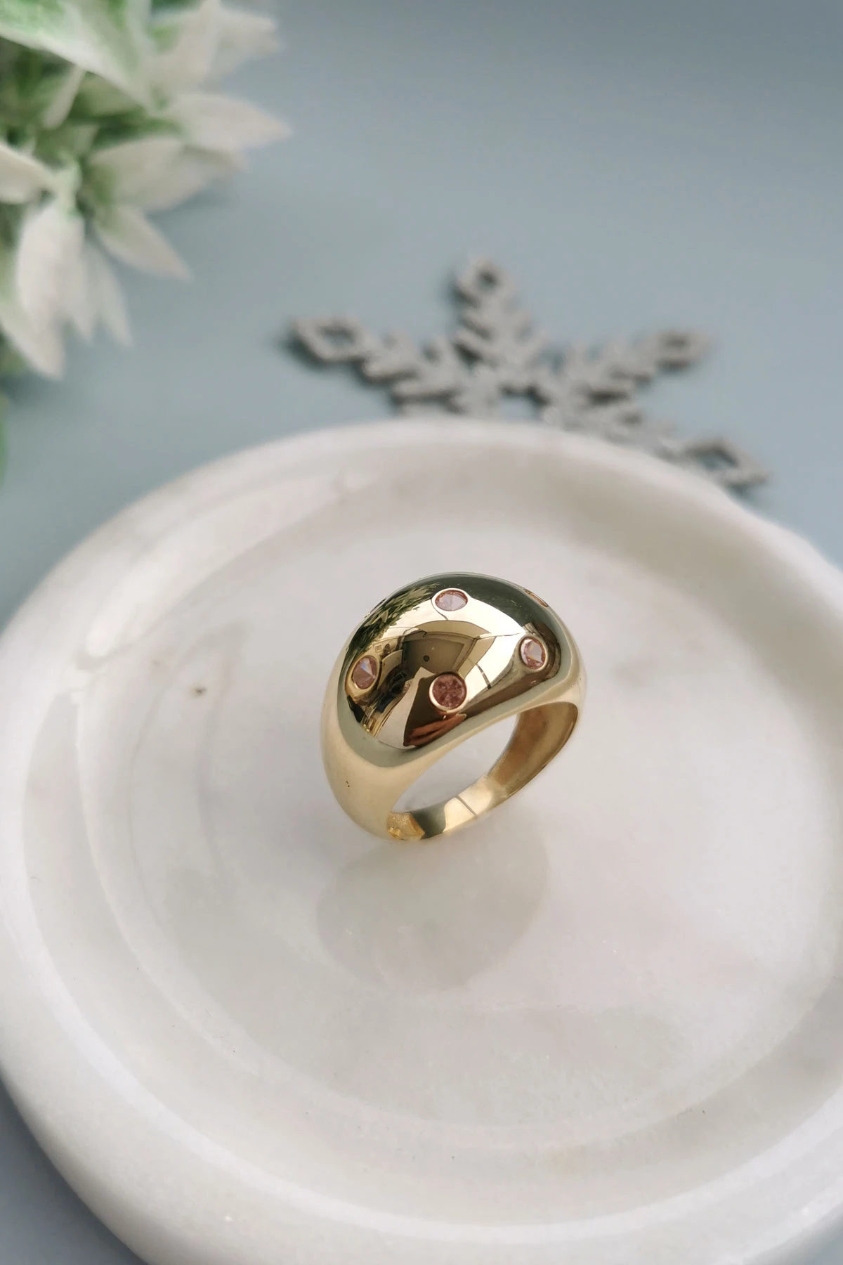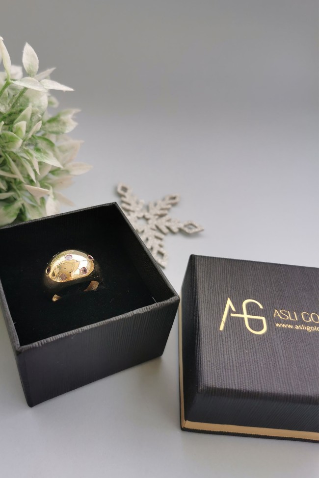 3.70 Gram Ağırlığında Geniş Bombeli Oldukça Hoş Bir Havaya Sahip, Gösterişli Ve Günlük Kullanıma Uygun Zirkon Pembe Taşlı 14 Ayar Altın Yüzük.