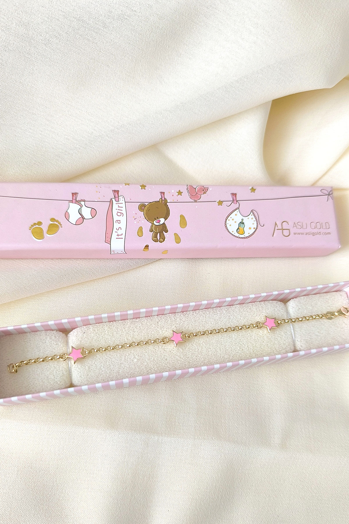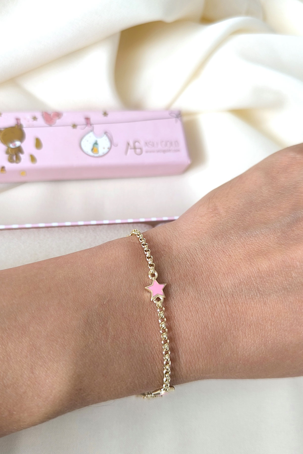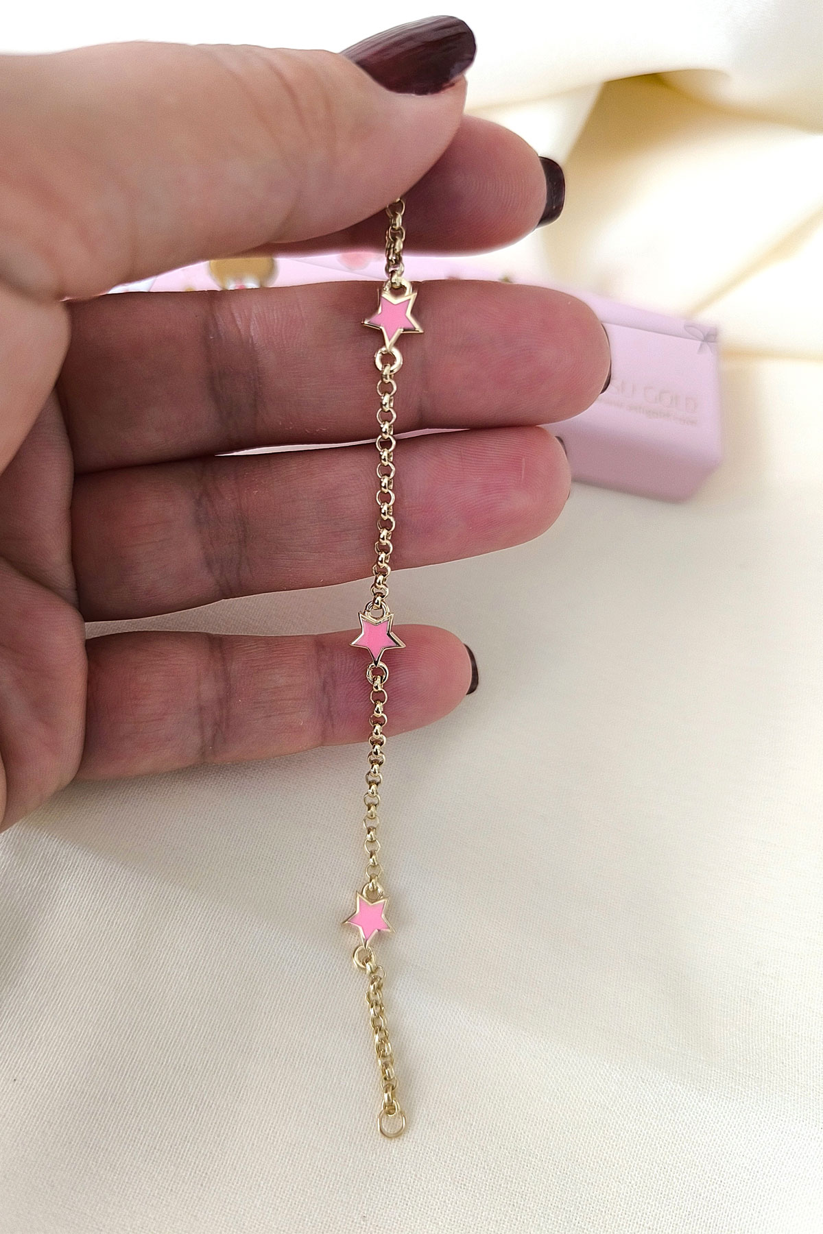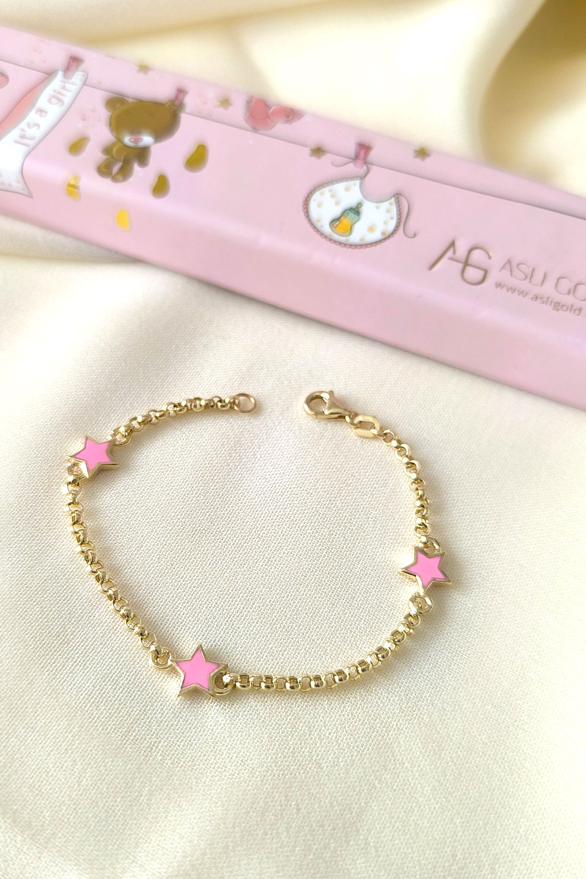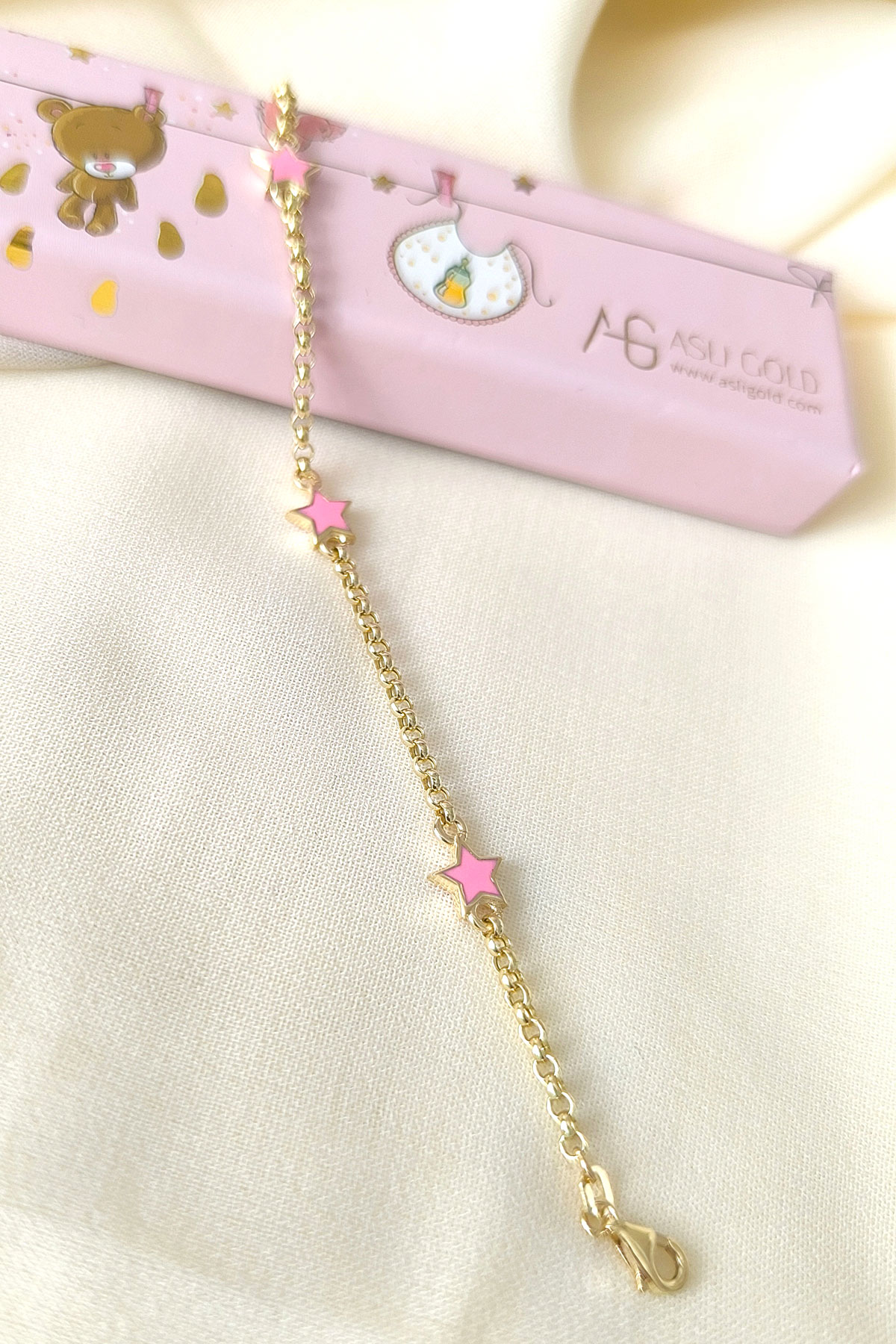 14 Cm boyunda günlük olarak da kullanıma uygun halka doc zincirli 14 ayar 2.15 gr ağırlığında altın pembe yıldız modelli kız çocuk bileklik.