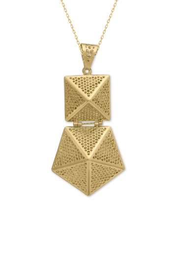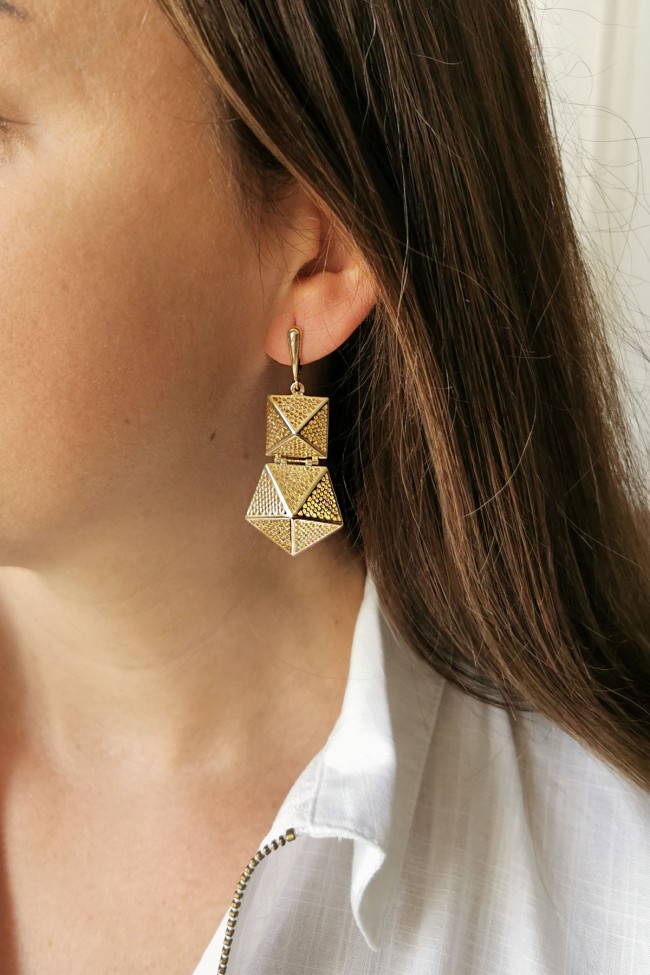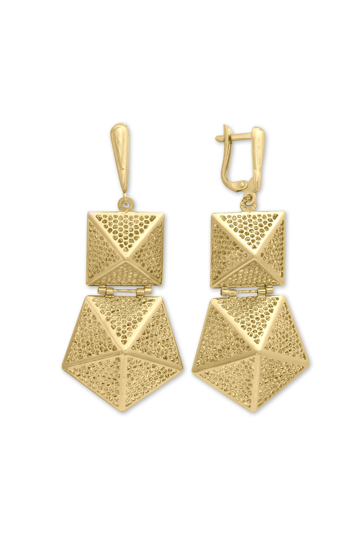 Farklı tasarımlar ile güne imzasını atmayı seven kadınlara özel bir modele sahip tüm kombinlerinize eşlik edecek 7.55 gram ağırlığında 6 cm uzunluğunda 14 ayar altın taşsız ışıl ışıl piramit tasarım küpe.
