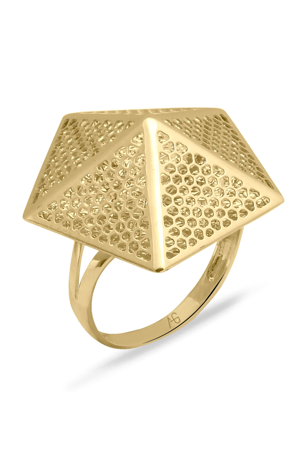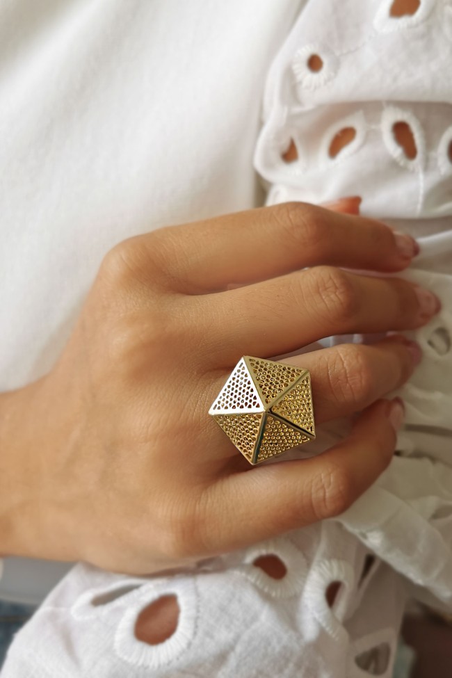 14 Ayar günlük kullanıma da uygun farklı tasarımlar ile güne imzasını atmayı seven kadınlara özel bir modele sahip tüm kombinlerinize eşlik edecek 3.25 gram ağırlığında altın taşsız ışıl ışıl piramit tasarım yüzük.