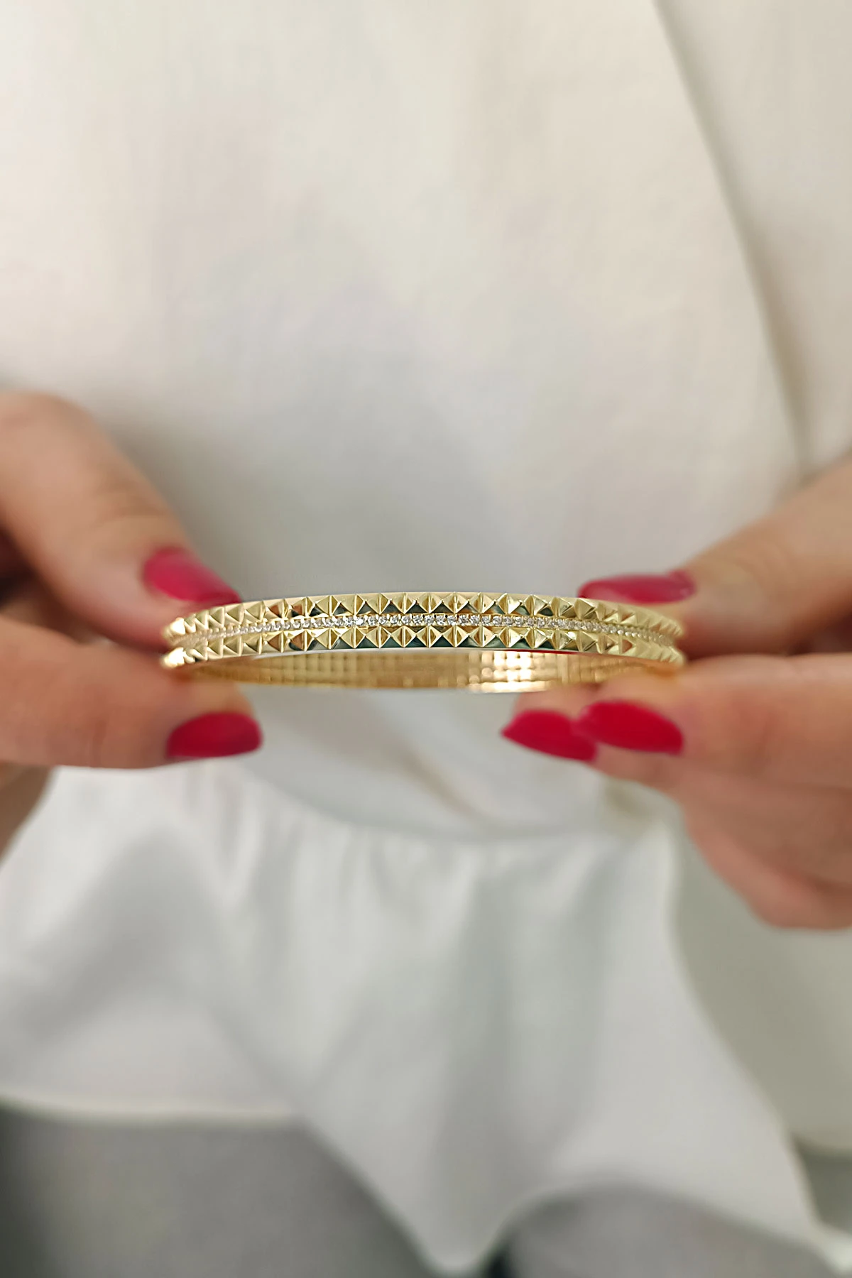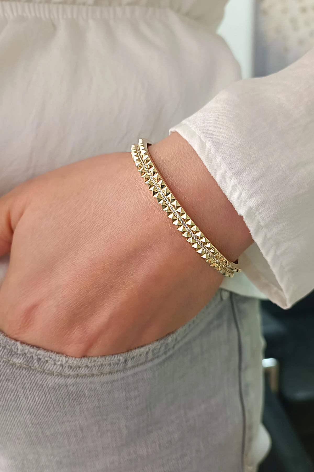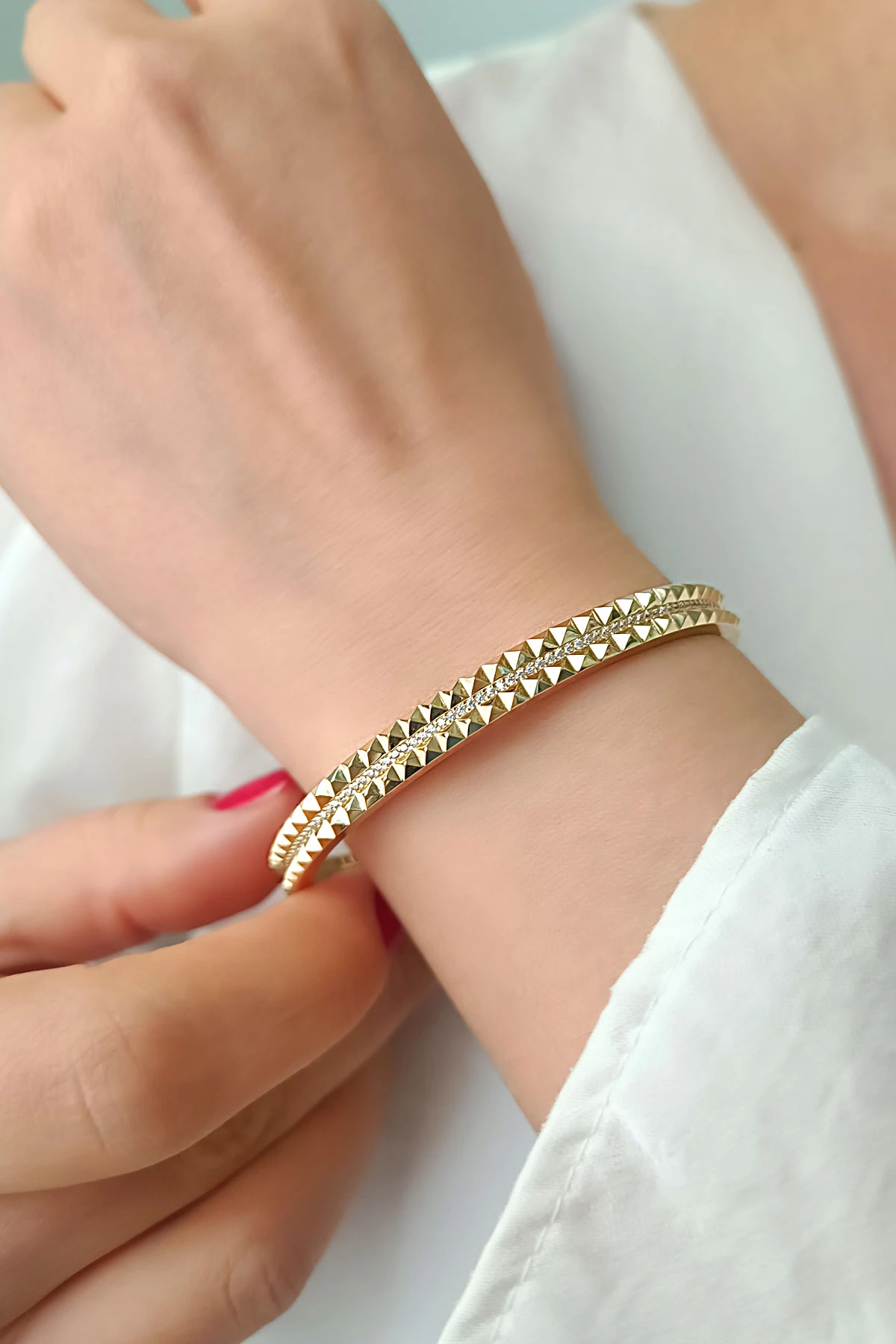 14 Ayar taş şerit detaylı şık tasarımı ile gösterişli ve spor duruşa sahip günlük kullanıma uygun 13.00 gram ağırlığında Tiffany model altın piramit bilezik.