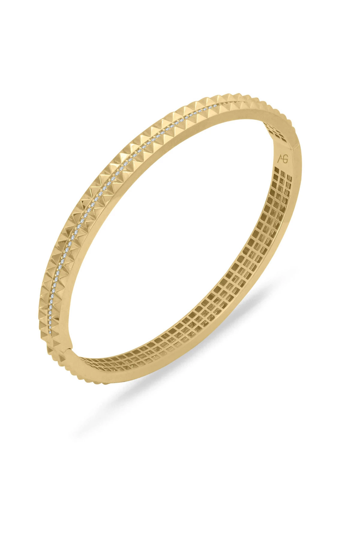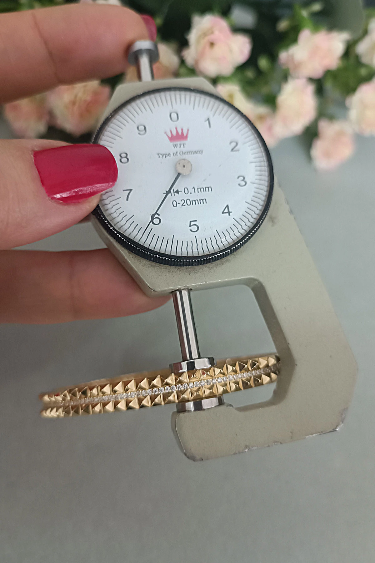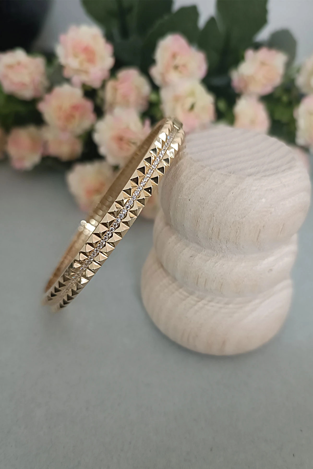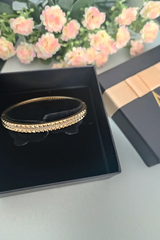 14 Ayar taş şerit detaylı şık tasarımı ile gösterişli ve spor duruşa sahip günlük kullanıma uygun 13.00 gram ağırlığında Tiffany model altın piramit bilezik.