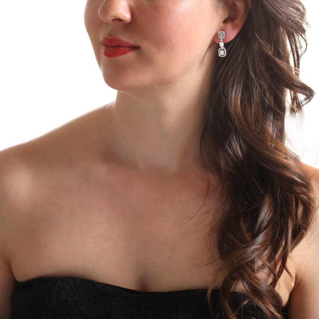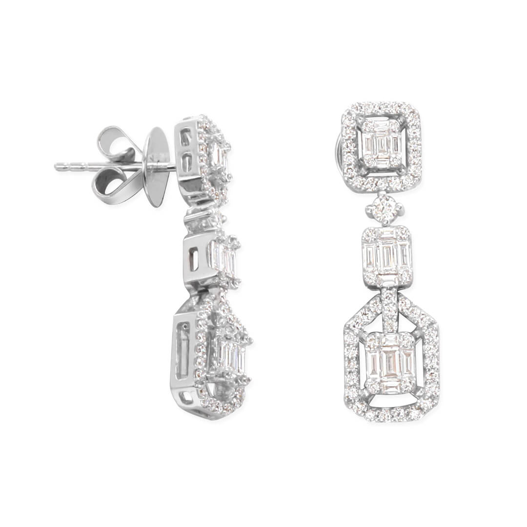 1.07 karat yuvarlak ve baget F-SI kesim pırlantalarla kombine taşlanmış el emeği, özel işçilik kalitesiyle tasarlanmış hafif sallantılı oldukça şık ve elit bir modele sahip pırlanta 18 ayar beyaz altın baget küpe.
