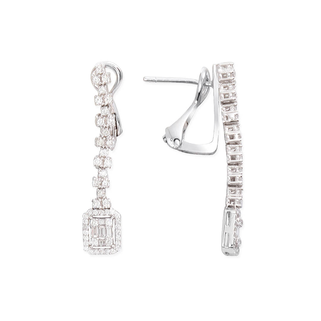 0.55 karat yuvarlak ve baget F-SI kesim pırlantalarla kombinlenerek el emeği ile özel işçilik kalitesinde tasarlanmış hafif sallantılı oldukça şık ve elit bir modele sahip pırlanta 14 ayar beyaz altın küpe.
